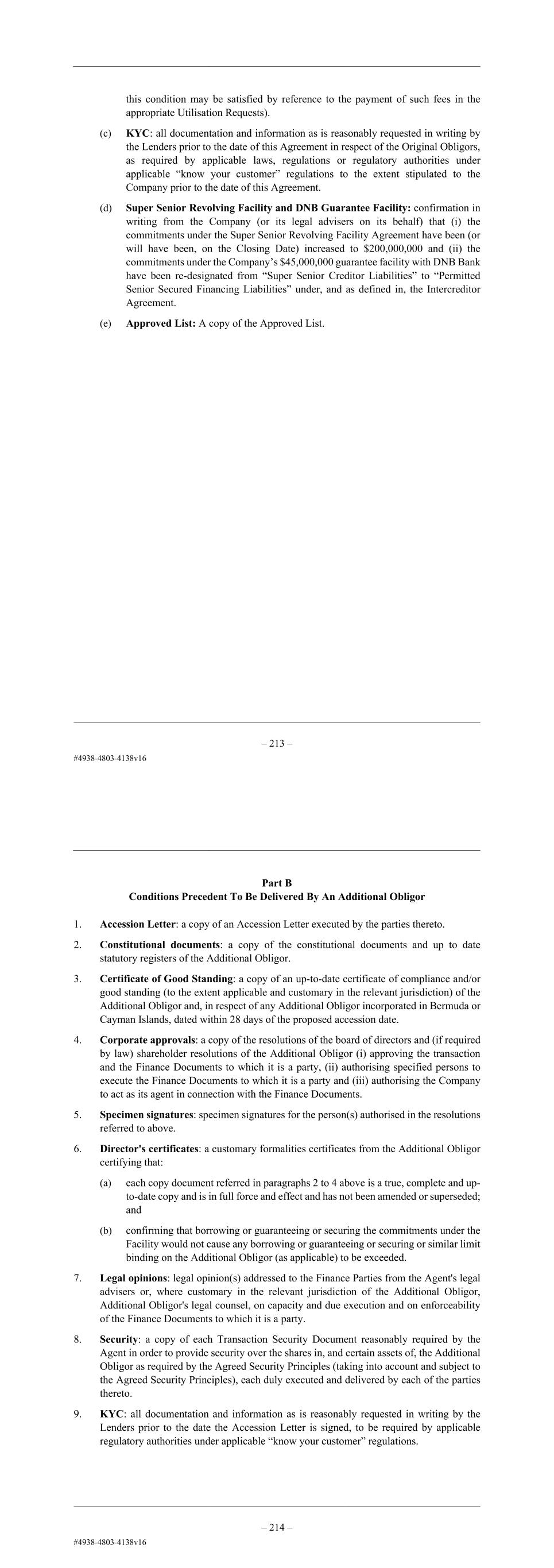 – 5 – Part B Conditions Precedent To Be Delivered By An Additional Obligor 1. Accession Letter: a copy of an Accession Letter executed by the parties thereto. 2. Constitutional documents: a copy of the constitutional documents and up to date statutory registers of the Additional Obligor. 3. Certificate of Good Standing: a copy of an up-to-date certificate of compliance and/or good standing (to the extent applicable and customary in the relevant jurisdiction) of the Additional Obligor and, in respect of any Additional Obligor incorporated in Bermuda or Cayman Islands, dated within 28 days of the proposed accession date. 4. Corporate approvals: a copy of the resolutions of the board of directors and (if required by law) shareholder resolutions of the Additional Obligor (i) approving the transaction and the Finance Documents to which it is a party, (ii) authorising specified persons to execute the Finance Documents to which it is a party and (iii) authorising the Company to act as its agent in connection with the Finance Documents. 5. Specimen signatures: specimen signatures for the person(s) authorised in the resolutions referred to above. 6. Director's certificates: a customary formalities certificates from the Additional Obligor certifying that: (a) each copy document referred in paragraphs 2 to 4 above is a true, complete and up- to-date copy and is in full force and effect and has not been amended or superseded; and (b) confirming that borrowing or guaranteeing or securing the commitments under the Facility would not cause any borrowing or guaranteeing or securing or similar limit binding on the Additional Obligor (as applicable) to be exceeded. 7. Legal opinions: legal opinion(s) addressed to the Finance Parties from the Agent's legal advisers or, where customary in the relevant jurisdiction of the Additional Obligor, Additional Obligor's legal counsel, on capacity and due execution and on enforceability of the Finance Documents to which it is a party. 8. Security: a copy of each Transaction Security Document reasonably required by the Agent in order to provide security over the shares in, and certain assets of, the Additional Obligor as required by the Agreed Security Principles (taking into account and subject to the Agreed Security Principles), each duly executed and delivered by each of the parties thereto. 9. KYC: all documentation and information as is reasonably requested in writing by the Lenders prior to the date the Accession Letter is signed, to be required by applicable regulatory authorities under applicable “know your customer” regulations. – 6 – Schedule 3 REQUESTS AND NOTICES UTILISATION REQUEST – LOANS From: [Borrower] [the Company]* To: [Agent] Dated: [ ] Dear Sirs [ ]– Revolving Facility Agreement dated [ ] (as amended) (the “Revolving Facility Agreement”) 1. We refer to the Revolving Facility Agreement. This is a Utilisation Request. Terms defined in the Revolving Facility Agreement have the same meaning in this Utilisation Request unless given a different meaning in this Utilisation Request. 2. We wish to [borrow a Loan on the following terms]/[arrange for a Letter of Credit to be issued under the Facility]: Borrower: [ ] Proposed Utilisation Date: [ ] (or, if that is not a Business Day, the next Business Day) Facility to be utilised: [Original Revolving Facility] [Additional Facility]2 Currency of Loan: [ ] Amount: [ ] or, if less, the Available Facility Interest Period: [ ] 3. [The proceeds of this Loan should be credited to [account].] 4. We confirm that each condition specified in clause 4.2 (Further conditions precedent) of the Agreement is satisfied on the date of this Utilisation Request. 5. This Utilisation Request is irrevocable. 6. [We attach a copy of the proposed Letter of Credit.]3 2 Select the Facility to be utilised and delete references to the other Facilities. 3 Include only if it is a Letter of Credit.