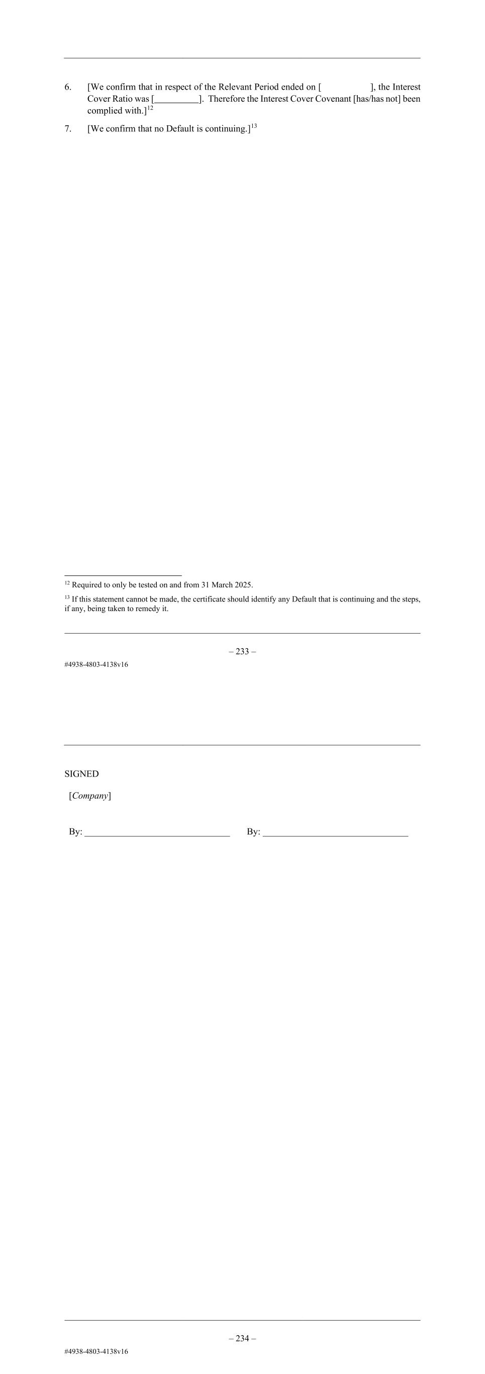 – 21 – 6. [We confirm that in respect of the Relevant Period ended on [ ], the Interest Cover Ratio was [ ]. Therefore the Interest Cover Covenant [has/has not] been complied with.]13 7. [We confirm that no Default is continuing.]14 13 Required to only be tested on and from 31 March 2025. 14 If this statement cannot be made, the certificate should identify any Default that is continuing and the steps, if any, being taken to remedy it. – 22 – SIGNED [Company] By: _______________________________ By: _______________________________