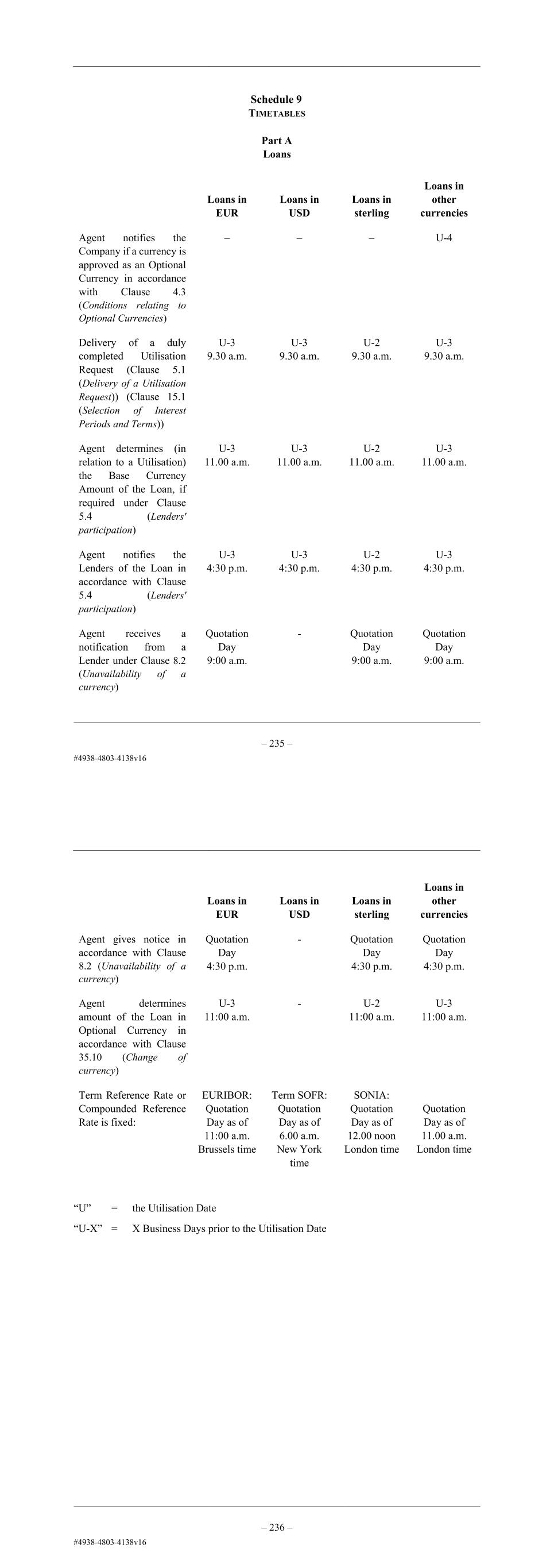 – 23 – Schedule 9 TIMETABLES Part A Loans Loans in EUR Loans in USD Loans in sterling Loans in other currencies Agent notifies the Company if a currency is approved as an Optional Currency in accordance with Clause 4.3 (Conditions relating to Optional Currencies) – – – U-4 Delivery of a duly completed Utilisation Request (Clause 5.1 (Delivery of a Utilisation Request)) (Clause 15.1 (Selection of Interest Periods and Terms)) U-3 9.30 a.m. U-3 9.30 a.m. U-2 9.30 a.m. U-3 9.30 a.m. Agent determines (in relation to a Utilisation) the Base Currency Amount of the Loan, if required under Clause 5.4 (Lenders' participation) U-3 11.00 a.m. U-3 11.00 a.m. U-2 11.00 a.m. U-3 11.00 a.m. Agent notifies the Lenders of the Loan in accordance with Clause 5.4 (Lenders' participation) U-3 4:30 p.m. U-3 4:30 p.m. U-2 4:30 p.m. U-3 4:30 p.m. Agent receives a notification from a Lender under Clause 8.2 (Unavailability of a currency) Quotation Day 9:00 a.m. - Quotation Day 9:00 a.m. Quotation Day 9:00 a.m. – 24 – Loans in EUR Loans in USD Loans in sterling Loans in other currencies Agent gives notice in accordance with Clause 8.2 (Unavailability of a currency) Quotation Day 4:30 p.m. - Quotation Day 4:30 p.m. Quotation Day 4:30 p.m. Agent determines amount of the Loan in Optional Currency in accordance with Clause 35.10 (Change of currency) U 11:00 a.m. - U 11:00 a.m. U 11:00 a.m. Term Reference Rate or Compounded Reference Rate is fixed: EURIBOR: Quotation Day as of 11:00 a.m. Brussels time Term SOFR: Quotation Day as of 6.00 a.m. New York time SONIA: Quotation Day as of 12.00 noon London time Quotation Day as of 11.00 a.m. London time “U” = the Utilisation Date “U-X” = X Business Days prior to the Utilisation Date