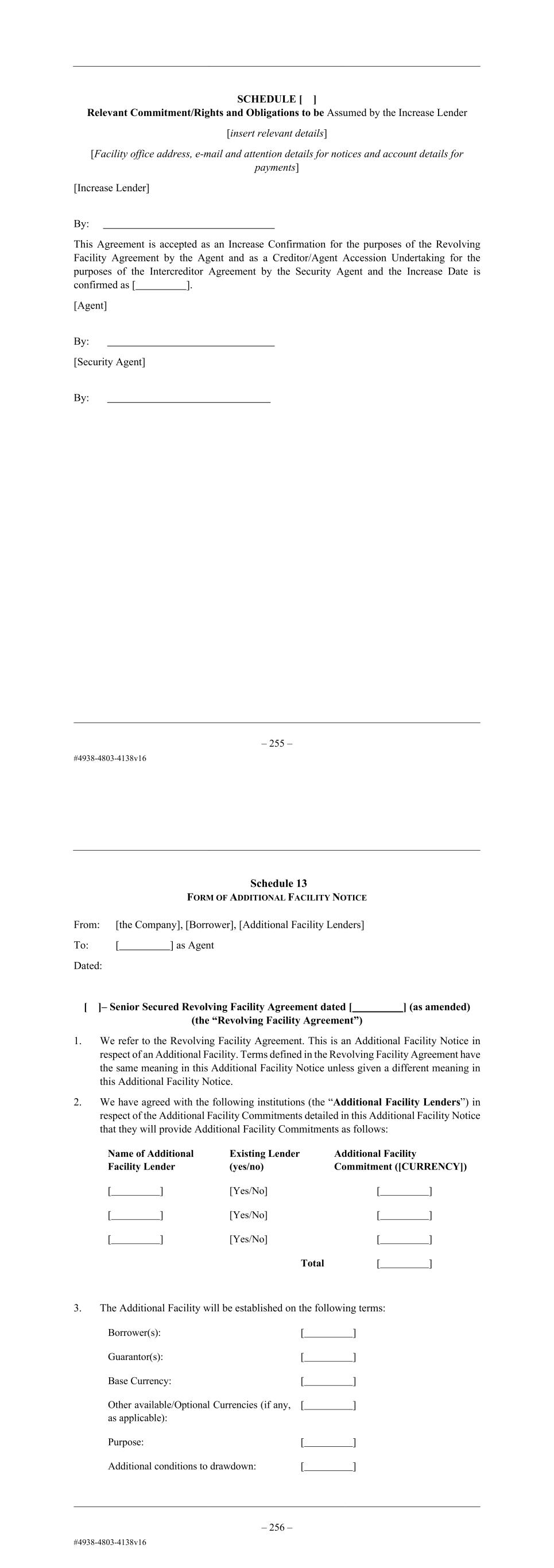 – 43 – SCHEDULE [ ] Relevant Commitment/Rights and Obligations to be Assumed by the Increase Lender [insert relevant details] [Facility office address, e-mail and attention details for notices and account details for payments] [Increase Lender] By: This Agreement is accepted as an Increase Confirmation for the purposes of the Revolving Facility Agreement by the Agent and as a Creditor/Agent Accession Undertaking for the purposes of the Intercreditor Agreement by the Security Agent and the Increase Date is confirmed as [ ]. [Agent] By: [Security Agent] By: – 44 – Schedule 13 FORM OF ADDITIONAL FACILITY NOTICE From: [the Company], [Borrower], [Additional Facility Lenders] To: [ ] as Agent Dated: Dear Sirs [ ]– Revolving Facility Agreement dated [ ] (as amended) (the “Revolving Facility Agreement”) 1. We refer to the Revolving Facility Agreement. This is an Additional Facility Notice in respect of an Additional Facility. Terms defined in the Revolving Facility Agreement have the same meaning in this Additional Facility Notice unless given a different meaning in this Additional Facility Notice. 2. We have agreed with the following institutions (the “Additional Facility Lenders”) in respect of the Additional Facility Commitments detailed in this Additional Facility Notice that they will provide Additional Facility Commitments as follows: Name of Additional Facility Lender Existing Lender (yes/no) Additional Facility Commitment ([CURRENCY]) [ ] [Yes/No] [ ] [ ] [Yes/No] [ ] [ ] [Yes/No] [ ] Total [ ] 3. The Additional Facility will be established on the following terms: Borrower(s): [ ] Guarantor(s): [ ] Base Currency: [ ] Other available/Optional Currencies (if any, as applicable): [ ] Purpose: [ ] Additional conditions to drawdown: [ ]