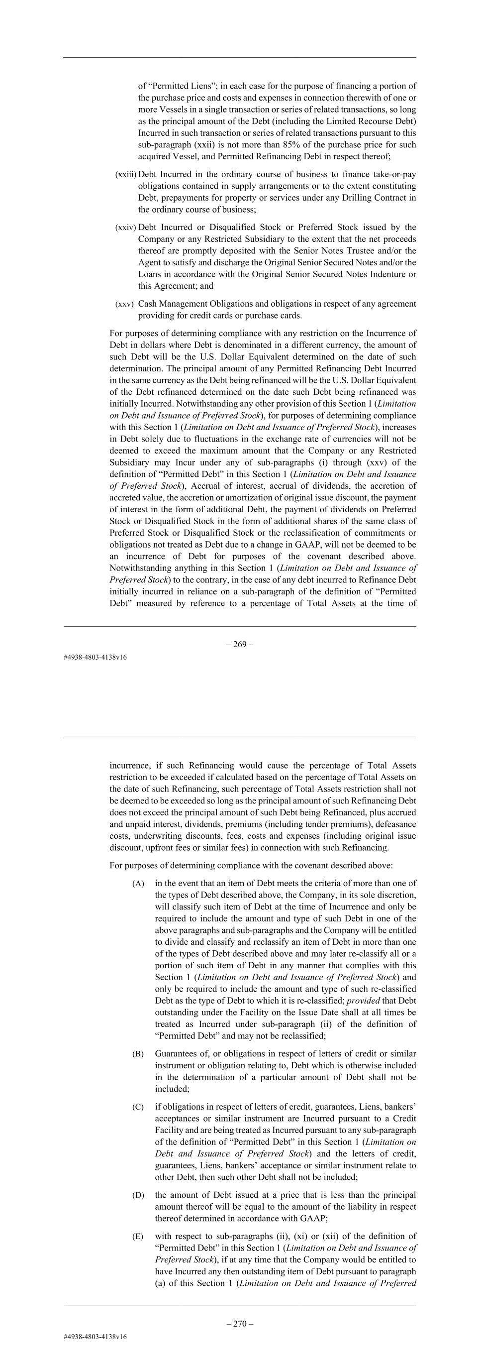 – 57 – paragraph (xxii) (other than such Debt Incurred to finance a portion of the purchase price of the Hull B 367 and the Hull B 368) is not more than 85% of the purchase price for such acquired Vessel, and Permitted Refinancing Debt in respect thereof; (xxiii) Debt Incurred in the ordinary course of business to finance take-or-pay obligations contained in supply arrangements or to the extent constituting Debt, prepayments for property or services under any Drilling Contract in the ordinary course of business; (xxiv) Debt Incurred or Disqualified Stock or Preferred Stock issued by the Company or any Restricted Subsidiary to the extent that the net proceeds thereof are promptly deposited with the Senior Notes Trustee and/or the Agent to satisfy and discharge the Original Senior Secured Notes and/or the Loans in accordance with the Original Senior Secured Notes Indenture or this Agreement; and (xxv) Cash Management Obligations and obligations in respect of any agreement providing for credit cards or purchase cards. For purposes of determining compliance with any restriction on the Incurrence of Debt in dollars where Debt is denominated in a different currency, the amount of such Debt will be the U.S. Dollar Equivalent determined on the date of such determination. The principal amount of any Permitted Refinancing Debt Incurred in the same currency as the Debt being refinanced will be the U.S. Dollar Equivalent of the Debt refinanced determined on the date such Debt being refinanced was initially Incurred. Notwithstanding any other provision of this Section 1 (Limitation on Debt and Issuance of Preferred Stock), for purposes of determining compliance with this Section 1 (Limitation on Debt and Issuance of Preferred Stock), increases in Debt solely due to fluctuations in the exchange rate of currencies will not be deemed to exceed the maximum amount that the Company or any Restricted Subsidiary may Incur under any of sub-paragraphs (b)(i) through (b)(xxv) of the definition of “Permitted Debt” in this Section 1 (Limitation on Debt and Issuance of Preferred Stock), Accrual of interest, accrual of dividends, the accretion of accreted value, the accretion or amortization of original issue discount, the payment of interest in the form of additional Debt, the payment of dividends on Preferred Stock or Disqualified Stock in the form of additional shares of the same class of Preferred Stock or Disqualified Stock or the reclassification of commitments or obligations not treated as Debt due to a change in GAAP, will not be deemed to be an incurrence of Debt for purposes of the covenant described above. Notwithstanding anything in this Section 1 (Limitation on Debt and Issuance of Preferred Stock) to the contrary, in the case of any debt incurred to Refinance Debt initially incurred in reliance on a sub-paragraph of the definition of “Permitted Debt” measured by reference to a percentage of Total Assets at the time of incurrence, if such Refinancing would cause the percentage of Total Assets restriction to be exceeded if calculated based on the percentage of Total Assets on the date of such Refinancing, such percentage of Total Assets restriction shall not – 58 – be deemed to be exceeded so long as the principal amount of such Refinancing Debt does not exceed the principal amount of such Debt being Refinanced, plus accrued and unpaid interest, dividends, premiums (including tender premiums), defeasance costs, underwriting discounts, fees, costs and expenses (including original issue discount, upfront fees or similar fees) in connection with such Refinancing. For purposes of determining compliance with the covenant described above: (A) in the event that an item of Debt meets the criteria of more than one of the types of Debt described above, the Company, in its sole discretion, will classify such item of Debt at the time of Incurrence and only be required to include the amount and type of such Debt in one of the above paragraphs and sub-paragraphs and the Company will be entitled to divide and classify and reclassify an item of Debt in more than one of the types of Debt described above and may later re-classify all or a portion of such item of Debt in any manner that complies with this Section 1 (Limitation on Debt and Issuance of Preferred Stock) and only be required to include the amount and type of such re-classified Debt as the type of Debt to which it is re-classified; provided that Debt outstanding under the Facility on the Issue Date shall at all times be treated as Incurred under sub-paragraph (ii) of the definition of “Permitted Debt” and may not be reclassified; (B) Guarantees of, or obligations in respect of letters of credit or similar instrument or obligation relating to, Debt which is otherwise included in the determination of a particular amount of Debt shall not be included; (C) if obligations in respect of letters of credit, guarantees, Liens, bankers’ acceptances or similar instrument are Incurred pursuant to a Credit Facility and are being treated as Incurred pursuant to any sub-paragraph of the definition of “Permitted Debt” in this Section 1 (Limitation on Debt and Issuance of Preferred Stock) and the letters of credit, guarantees, Liens, bankers’ acceptance or similar instrument relate to other Debt, then such other Debt shall not be included; (D) the amount of Debt issued at a price that is less than the principal amount thereof will be equal to the amount of the liability in respect thereof determined in accordance with GAAP; (E) with respect to sub-paragraphs (ii), (xi) or (xii) of the definition of “Permitted Debt” in this Section 1 (Limitation on Debt and Issuance of Preferred Stock), if at any time that the Company would be entitled to have Incurred any then outstanding item of Debt pursuant to paragraph (a) of this Section 1 (Limitation on Debt and Issuance of Preferred Stock) such item of Debt shall (unless otherwise elected by the Company) 