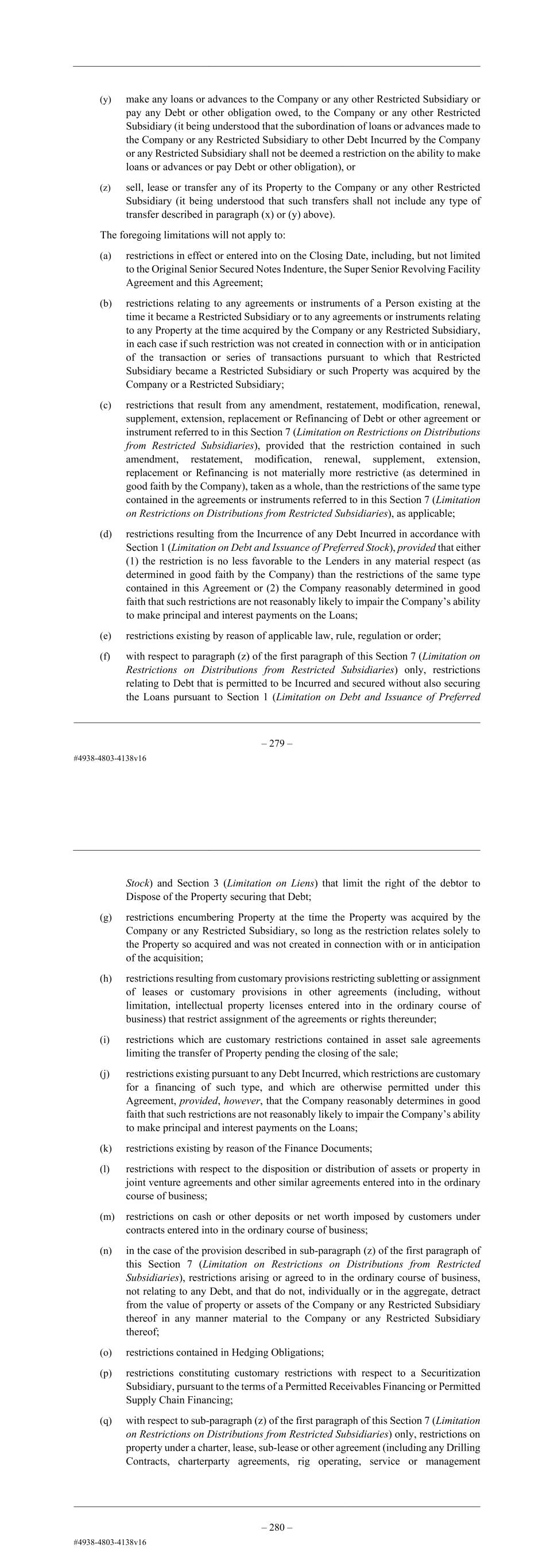 – 67 – (y) make any loans or advances to the Company or any other Restricted Subsidiary or pay any Debt or other obligation owed, to the Company or any other Restricted Subsidiary (it being understood that the subordination of loans or advances made to the Company or any Restricted Subsidiary to other Debt Incurred by the Company or any Restricted Subsidiary shall not be deemed a restriction on the ability to make loans or advances or pay Debt or other obligation), or (z) sell, lease or transfer any of its Property to the Company or any other Restricted Subsidiary (it being understood that such transfers shall not include any type of transfer described in paragraph (x) or (y) above). The foregoing limitations will not apply to: (a) restrictions in effect or entered into on the Issue Date or the Closing Date, including, but not limited to the Original Senior Secured Notes Indenture and this Agreement; (b) restrictions relating to any agreements or instruments of a Person existing at the time it became a Restricted Subsidiary or to any agreements or instruments relating to any Property at the time acquired by the Company or any Restricted Subsidiary, in each case if such restriction was not created in connection with or in anticipation of the transaction or series of transactions pursuant to which that Restricted Subsidiary became a Restricted Subsidiary or such Property was acquired by the Company or a Restricted Subsidiary; (c) restrictions that result from any amendment, restatement, modification, renewal, supplement, extension, replacement or Refinancing of Debt or other agreement or instrument referred to in this Section 7 (Limitation on Restrictions on Distributions from Restricted Subsidiaries), provided that the restriction contained in such amendment, restatement, modification, renewal, supplement, extension, replacement or Refinancing is not materially more restrictive (as determined in good faith by the Company), taken as a whole, than the restrictions of the same type contained in the agreements or instruments referred to in this Section 7 (Limitation on Restrictions on Distributions from Restricted Subsidiaries), as applicable; (d) restrictions resulting from the Incurrence of any Debt Incurred in accordance with Section 1 (Limitation on Debt and Issuance of Preferred Stock), provided that either (1) the restriction is no less favorable to the Lenders in any material respect (as determined in good faith by the Company) than the restrictions of the same type contained in this Agreement or (2) the Company reasonably determined in good faith that such restrictions are not reasonably likely to impair the Company’s ability to make principal and interest payments on the Loans; (e) restrictions existing by reason of applicable law, rule, regulation or order; (f) with respect to paragraph (z) of the first paragraph of this Section 7 (Limitation on Restrictions on Distributions from Restricted Subsidiaries) only, restrictions relating to Debt that is permitted to be Incurred and secured without also securing the Loans pursuant to Section 1 (Limitation on Debt and Issuance of Preferred – 68 – Stock) and Section 3 (Limitation on Liens) that limit the right of the debtor to Dispose of the Property securing that Debt; (g) restrictions encumbering Property at the time the Property was acquired by the Company or any Restricted Subsidiary, so long as the restriction relates solely to the Property so acquired and was not created in connection with or in anticipation of the acquisition; (h) restrictions resulting from customary provisions restricting subletting or assignment of leases or customary provisions in other agreements (including, without limitation, intellectual property licenses entered into in the ordinary course of business) that restrict assignment of the agreements or rights thereunder; (i) restrictions which are customary restrictions contained in asset sale agreements limiting the transfer of Property pending the closing of the sale; (j) restrictions existing pursuant to any Debt Incurred, which restrictions are customary for a financing of such type, and which are otherwise permitted under this Agreement, provided, however, that the Company reasonably determines in good faith that such restrictions are not reasonably likely to impair the Company’s ability to make principal and interest payments on the Loans; (k) restrictions existing by reason of the Finance Documents; (l) restrictions with respect to the disposition or distribution of assets or property in joint venture agreements and other similar agreements entered into in the ordinary course of business; (m) restrictions on cash or other deposits or net worth imposed by customers under contracts entered into in the ordinary course of business; (n) in the case of the provision described in sub-paragraph (z) of the first paragraph of this Section 7 (Limitation on Restrictions on Distributions from Restricted Subsidiaries), restrictions arising or agreed to in the ordinary course of business, not relating to any Debt, and that do not, individually or in the aggregate, detract from the value of property or assets of the Company or any Restricted Subsidiary thereof in any manner material to the Company or any Restricted Subsidiary thereof; (o) restrictions contained in Hedging Obligations; (p) restrictions constituting customary restrictions with respect to a Securitization Subsidiary, pursuant to the terms of a Permitted Receivables Financing or Permitted Supply Chain Financing; (q) with respect to sub-paragraph (z) of the first paragraph of this Section 7 (Limitation on Restrictions on Distributions from Restricted Subsidiaries) only, restrictions on property under a charter, lease, sub-lease or other agreement (including any Drilling Contracts, charterparty agreements, rig operating, service or management