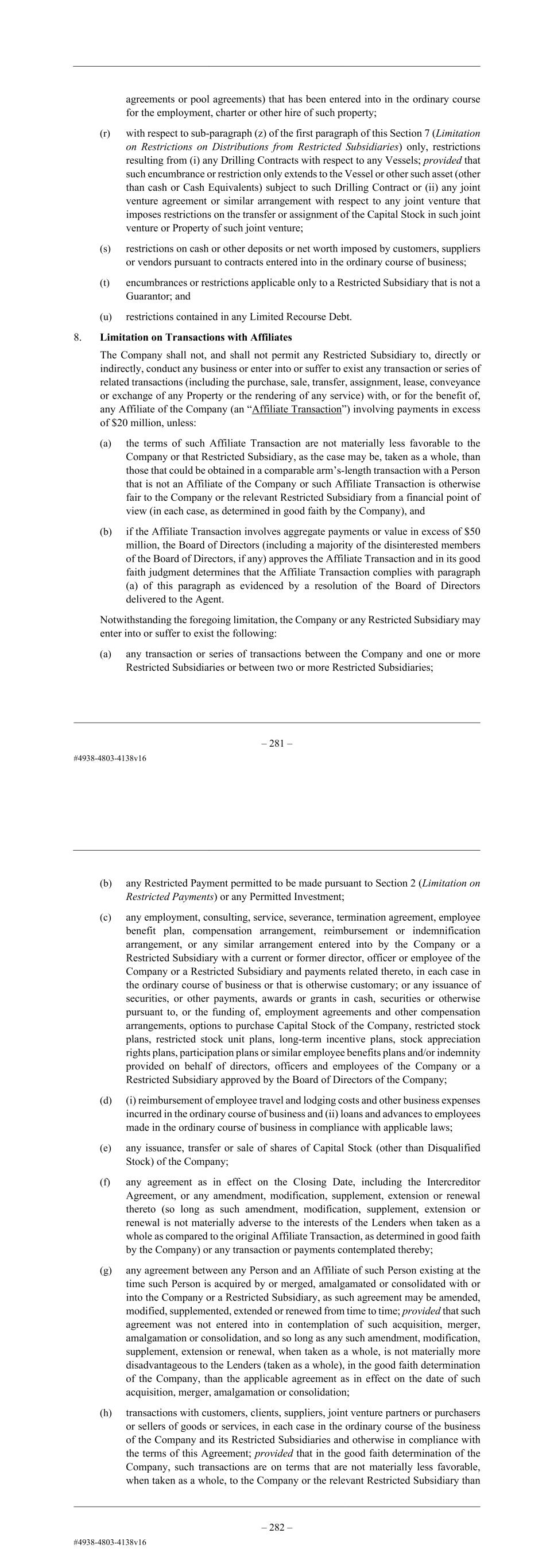 – 69 – agreements or pool agreements) that has been entered into in the ordinary course for the employment, charter or other hire of such property; (r) with respect to sub-paragraph (z) of the first paragraph of this Section 7 (Limitation on Restrictions on Distributions from Restricted Subsidiaries) only, restrictions resulting from (i) any Drilling Contracts with respect to any Vessels; provided that such encumbrance or restriction only extends to the Vessel or other such asset (other than cash or Cash Equivalents) subject to such Drilling Contract or (ii) any joint venture agreement or similar arrangement with respect to any joint venture that imposes restrictions on the transfer or assignment of the Capital Stock in such joint venture or Property of such joint venture; (s) restrictions on cash or other deposits or net worth imposed by customers, suppliers or vendors pursuant to contracts entered into in the ordinary course of business; (t) encumbrances or restrictions applicable only to a Restricted Subsidiary that is not a Guarantor; and (u) restrictions contained in any Limited Recourse Debt. 8. Limitation on Transactions with Affiliates The Company shall not, and shall not permit any Restricted Subsidiary to, directly or indirectly, conduct any business or enter into or suffer to exist any transaction or series of related transactions (including the purchase, sale, transfer, assignment, lease, conveyance or exchange of any Property or the rendering of any service) with, or for the benefit of, any Affiliate of the Company (an “Affiliate Transaction”) involving payments in excess of $20 million, unless: (a) the terms of such Affiliate Transaction are not materially less favorable to the Company or that Restricted Subsidiary, as the case may be, taken as a whole, than those that could be obtained in a comparable arm’s-length transaction with a Person that is not an Affiliate of the Company or such Affiliate Transaction is otherwise fair to the Company or the relevant Restricted Subsidiary from a financial point of view (in each case, as determined in good faith by the Company), and (b) if the Affiliate Transaction involves aggregate payments or value in excess of $50 million, the Board of Directors (including a majority of the disinterested members of the Board of Directors, if any) approves the Affiliate Transaction and in its good faith judgment determines that the Affiliate Transaction complies with paragraph (a) of this paragraph as evidenced by a resolution of the Board of Directors delivered to the Agent. Notwithstanding the foregoing limitation, the Company or any Restricted Subsidiary may enter into or suffer to exist the following: (a) any transaction or series of transactions between the Company and one or more Restricted Subsidiaries or between two or more Restricted Subsidiaries; – 70 – (b) any Restricted Payment permitted to be made pursuant to Section 2 (Limitation on Restricted Payments) or any Permitted Investment; (c) any employment, consulting, service, severance, termination agreement, employee benefit plan, compensation arrangement, reimbursement or indemnification arrangement, or any similar arrangement entered into by the Company or a Restricted Subsidiary with a current or former director, officer or employee of the Company or a Restricted Subsidiary and payments related thereto, in each case in the ordinary course of business or that is otherwise customary; or any issuance of securities, or other payments, awards or grants in cash, securities or otherwise pursuant to, or the funding of, employment agreements and other compensation arrangements, options to purchase Capital Stock of the Company, restricted stock plans, restricted stock unit plans, long-term incentive plans, stock appreciation rights plans, participation plans or similar employee benefits plans and/or indemnity provided on behalf of directors, officers and employees of the Company or a Restricted Subsidiary approved by the Board of Directors of the Company; (d) (i) reimbursement of employee travel and lodging costs and other business expenses incurred in the ordinary course of business and (ii) loans and advances to employees made in the ordinary course of business in compliance with applicable laws; (e) any issuance, transfer or sale of shares of Capital Stock (other than Disqualified Stock) of the Company; (f) any agreement as in effect on the Issue Date, including the Intercreditor Agreement, or any amendment, modification, supplement, extension or renewal thereto (so long as such amendment, modification, supplement, extension or renewal is not materially adverse to the interests of the Lenders when taken as a whole as compared to the original Affiliate Transaction, as determined in good faith by the Company) or any transaction or payments contemplated thereby; (g) any agreement between any Person and an Affiliate of such Person existing at the time such Person is acquired by or merged, amalgamated or consolidated with or into the Company or a Restricted Subsidiary, as such agreement may be amended, modified, supplemented, extended or renewed from time to time; provided that such agreement was not entered into in contemplation of such acquisition, merger, amalgamation or consolidation, and so long as any such amendment, modification, supplement, extension or renewal, when taken as a whole, is not materially more disadvantageous to the Lenders (taken as a whole), in the good faith determination of the Company, than the applicable agreement as in effect on the date of such acquisition, merger, amalgamation or consolidation; (h) transactions with customers, clients, suppliers, joint venture partners or purchasers or sellers of goods or services, in each case in the ordinary course of the business of the Company and its Restricted Subsidiaries and otherwise in compliance with the terms of this Agreement; provided that in the good faith determination of the Company, such transactions 