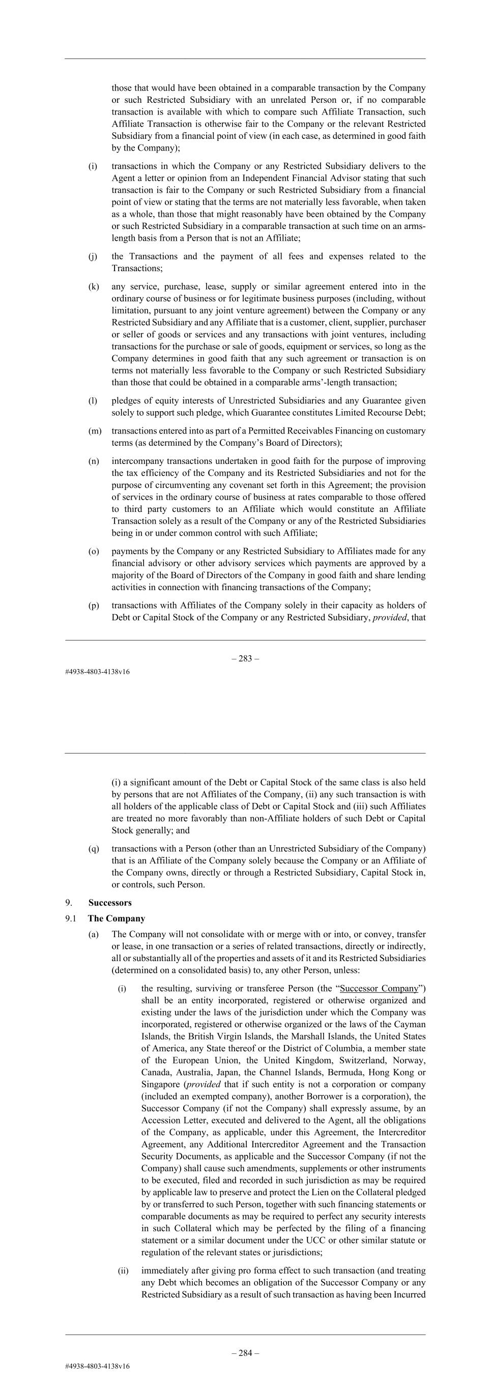 – 71 – those that would have been obtained in a comparable transaction by the Company or such Restricted Subsidiary with an unrelated Person or, if no comparable transaction is available with which to compare such Affiliate Transaction, such Affiliate Transaction is otherwise fair to the Company or the relevant Restricted Subsidiary from a financial point of view (in each case, as determined in good faith by the Company); (i) transactions in which the Company or any Restricted Subsidiary delivers to the Agent a letter or opinion from an Independent Financial Advisor stating that such transaction is fair to the Company or such Restricted Subsidiary from a financial point of view or stating that the terms are not materially less favorable, when taken as a whole, than those that might reasonably have been obtained by the Company or such Restricted Subsidiary in a comparable transaction at such time on an arms- length basis from a Person that is not an Affiliate; (j) the Transactions and the payment of all fees and expenses related to the Transactions; (k) any service, purchase, lease, supply or similar agreement entered into in the ordinary course of business or for legitimate business purposes (including, without limitation, pursuant to any joint venture agreement) between the Company or any Restricted Subsidiary and any Affiliate that is a customer, client, supplier, purchaser or seller of goods or services and any transactions with joint ventures, including transactions for the purchase or sale of goods, equipment or services, so long as the Company determines in good faith that any such agreement or transaction is on terms not materially less favorable to the Company or such Restricted Subsidiary than those that could be obtained in a comparable arms’-length transaction; (l) pledges of equity interests of Unrestricted Subsidiaries and any Guarantee given solely to support such pledge, which Guarantee constitutes Limited Recourse Debt; (m) transactions entered into as part of a Permitted Receivables Financing on customary terms (as determined by the Company’s Board of Directors); (n) intercompany transactions undertaken in good faith for the purpose of improving the tax efficiency of the Company and its Restricted Subsidiaries and not for the purpose of circumventing any covenant set forth in this Agreement; the provision of services in the ordinary course of business at rates comparable to those offered to third party customers to an Affiliate which would constitute an Affiliate Transaction solely as a result of the Company or any of the Restricted Subsidiaries being in or under common control with such Affiliate; (o) payments by the Company or any Restricted Subsidiary to Affiliates made for any financial advisory or other advisory services which payments are approved by a majority of the Board of Directors of the Company in good faith and share lending activities in connection with financing transactions of the Company; (p) transactions with Affiliates of the Company solely in their capacity as holders of Debt or Capital Stock of the Company or any Restricted Subsidiary, provided, that – 72 – (i) a significant amount of the Debt or Capital Stock of the same class is also held by persons that are not Affiliates of the Company, (ii) any such transaction is with all holders of the applicable class of Debt or Capital Stock and (iii) such Affiliates are treated no more favorably than non-Affiliate holders of such Debt or Capital Stock generally; and (q) transactions with a Person (other than an Unrestricted Subsidiary of the Company) that is an Affiliate of the Company solely because the Company or an Affiliate of the Company owns, directly or through a Restricted Subsidiary, Capital Stock in, or controls, such Person. 9. Successors 9.1 The Company (a) The Company will not consolidate with or merge with or into, or convey, transfer or lease, in one transaction or a series of related transactions, directly or indirectly, all or substantially all of the properties and assets of it and its Restricted Subsidiaries (determined on a consolidated basis) to, any other Person, unless: (i) the resulting, surviving or transferee Person (the “Successor Company”) shall be an entity incorporated, registered or otherwise organized and existing under the laws of the jurisdiction under which the Company was incorporated, registered or otherwise organized or the laws of the Cayman Islands, the British Virgin Islands, the Marshall Islands, the United States of America, any State thereof or the District of Columbia, a member state of the European Union, the United Kingdom, Switzerland, Norway, Canada, Australia, Japan, the Channel Islands, Bermuda, Hong Kong or Singapore (provided that if such entity is not a corporation or company (included an exempted company), another Borrower is a corporation), the Successor Company (if not the Company) shall expressly assume, by an Accession Letter, executed and delivered to the Agent, all the obligations of the Company, as applicable, under this Agreement, the Intercreditor Agreement, any Additional Intercreditor Agreement and the Transaction Security Documents, as applicable and the Successor Company (if not the Company) shall cause such amendments, supplements or other instruments to be executed, filed and recorded in such jurisdiction as may be required by applicable law to preserve and protect the Lien on the Collateral pledged by or transferred to such Person, together with such financing statements or comparable documents as may be required to perfect any security interests in such Collateral which may be perfected by the filing of a financing statement or a similar document under the UCC or other similar statute or regulation of the relevant states or jurisdictions; (ii) immediately after giving pro forma effect to such transaction (and treating any Debt which becomes an obligation of the Successor Company or any Restricted Subsidiary as a result 