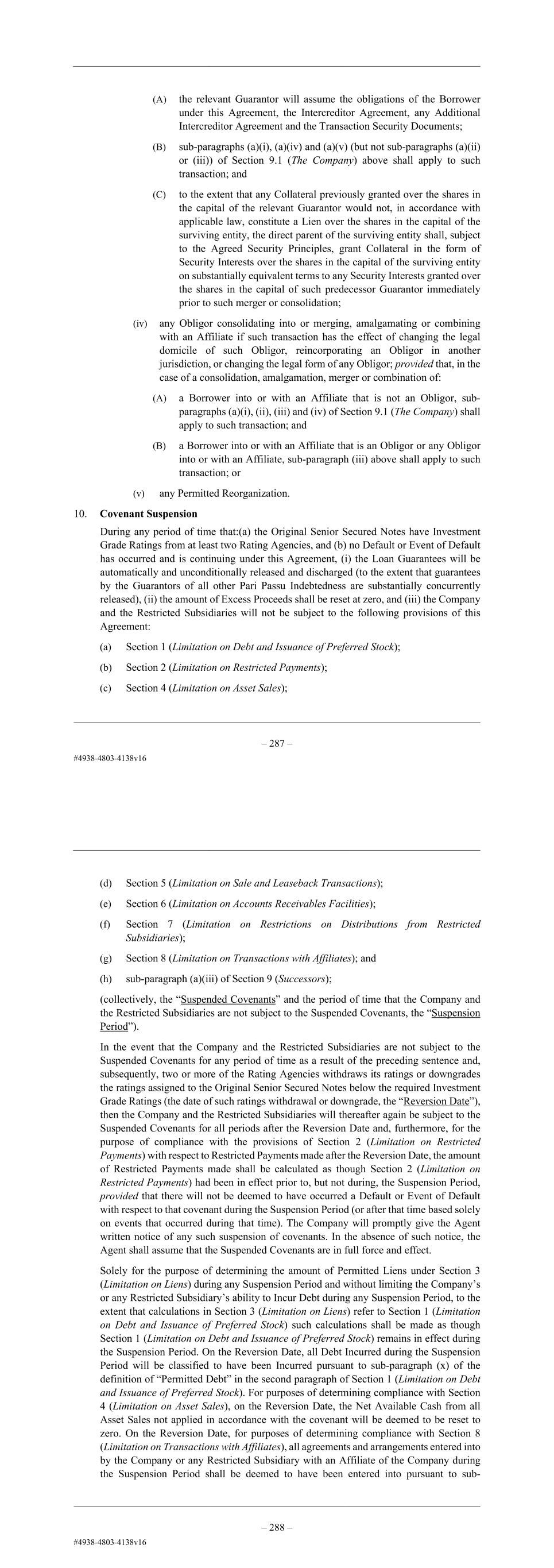 – 75 – (B) sub-paragraphs (a)(i), (a)(iv) and (a)(v) (but not sub-paragraphs (a)(ii) or (iii)) of Section 9.1 (The Company) above shall apply to such transaction; and (C) to the extent that any Collateral previously granted over the shares in the capital of the relevant Guarantor would not, in accordance with applicable law, constitute a Lien over the shares in the capital of the surviving entity, the direct parent of the surviving entity shall, subject to the Agreed Security Principles, grant Collateral in the form of Security Interests over the shares in the capital of the surviving entity on substantially equivalent terms to any Security Interests granted over the shares in the capital of such predecessor Guarantor immediately prior to such merger or consolidation; (iv) any Obligor consolidating into or merging, amalgamating or combining with an Affiliate if such transaction has the effect of changing the legal domicile of such Obligor, reincorporating an Obligor in another jurisdiction, or changing the legal form of any Obligor; provided that, in the case of a consolidation, amalgamation, merger or combination of: (A) a Borrower into or with an Affiliate that is not an Obligor, sub- paragraphs (a)(i), (ii), (iii) and (iv) of Section 9.1 (The Company) shall apply to such transaction; and (B) a Borrower into or with an Affiliate that is an Obligor or any Obligor into or with an Affiliate, sub-paragraph (iii) above shall apply to such transaction; or (v) any Permitted Reorganization. 10. Covenant Suspension During any period of time that:(a) the Original Senior Secured Notes have Investment Grade Ratings from at least two Rating Agencies, and (b) no Default or Event of Default has occurred and is continuing under this Agreement, (i) the Loan Guarantees will be automatically and unconditionally released and discharged (to the extent that guarantees by the Guarantors of all other Pari Passu Indebtedness are substantially concurrently released), (ii) the amount of Excess Proceeds shall be reset at zero, and (iii) the Company and the Restricted Subsidiaries will not be subject to the following provisions of this Agreement: (a) Section 1 (Limitation on Debt and Issuance of Preferred Stock); (b) Section 2 (Limitation on Restricted Payments); (c) Section 4 (Limitation on Asset Sales); (d) Section 5 (Limitation on Sale and Leaseback Transactions); (e) Section 6 (Limitation on Accounts Receivables Facilities); – 76 – (f) Section 7 (Limitation on Restrictions on Distributions from Restricted Subsidiaries); (g) Section 8 (Limitation on Transactions with Affiliates); and (h) sub-paragraph (a)(iii) of Section 9 (Successors); (collectively, the “Suspended Covenants” and the period of time that the Company and the Restricted Subsidiaries are not subject to the Suspended Covenants, the “Suspension Period”). In the event that the Company and the Restricted Subsidiaries are not subject to the Suspended Covenants for any period of time as a result of the preceding sentence and, subsequently, two or more of the Rating Agencies withdraws its ratings or downgrades the ratings assigned to the Original Senior Secured Notes below the required Investment Grade Ratings (the date of such ratings withdrawal or downgrade, the “Reversion Date”), then the Company and the Restricted Subsidiaries will thereafter again be subject to the Suspended Covenants for all periods after the Reversion Date and, furthermore, for the purpose of compliance with the provisions of Section 2 (Limitation on Restricted Payments) with respect to Restricted Payments made after the Reversion Date, the amount of Restricted Payments made shall be calculated as though Section 2 (Limitation on Restricted Payments) had been in effect prior to, but not during, the Suspension Period, provided that there will not be deemed to have occurred a Default or Event of Default with respect to that covenant during the Suspension Period (or after that time based solely on events that occurred during that time). The Company will promptly give the Agent written notice of any such suspension of covenants. In the absence of such notice, the Agent shall assume that the Suspended Covenants are in full force and effect. Solely for the purpose of determining the amount of Permitted Liens under Section 3 (Limitation on Liens) during any Suspension Period and without limiting the Company’s or any Restricted Subsidiary’s ability to Incur Debt during any Suspension Period, to the extent that calculations in Section 3 (Limitation on Liens) refer to Section 1 (Limitation on Debt and Issuance of Preferred Stock) such calculations shall be made as though Section 1 (Limitation on Debt and Issuance of Preferred Stock) remains in effect during the Suspension Period. On the Reversion Date, all Debt Incurred during the Suspension Period will be classified to have been Incurred pursuant to sub-paragraph (x) of the definition of “Permitted Debt” in the second paragraph of Section 1 (Limitation on Debt and Issuance of Preferred Stock). For purposes of determining compliance with Section 4 (Limitation on Asset Sales), on the Reversion Date, the Net Available Cash from all Asset Sales not applied in accordance with the covenant will be deemed to be reset to zero. On the Reversion Date, for purposes of determining compliance with Section 8 (Limitation on Transactions with Affiliates), all agreements and arrangements entered into by the Company or any Restricted Subsidiary with an Affiliate of the Company during the Suspension Period shall be deemed to have been entered into pursuant to sub- paragraph (f) of the second paragraph of 8 (Limitation on Transactions with Affiliates), and for purposes of determining compliance with Section 7 (Limitation on Restrictions on Distributions from Restricted Subsidiaries), all contracts entered into during the