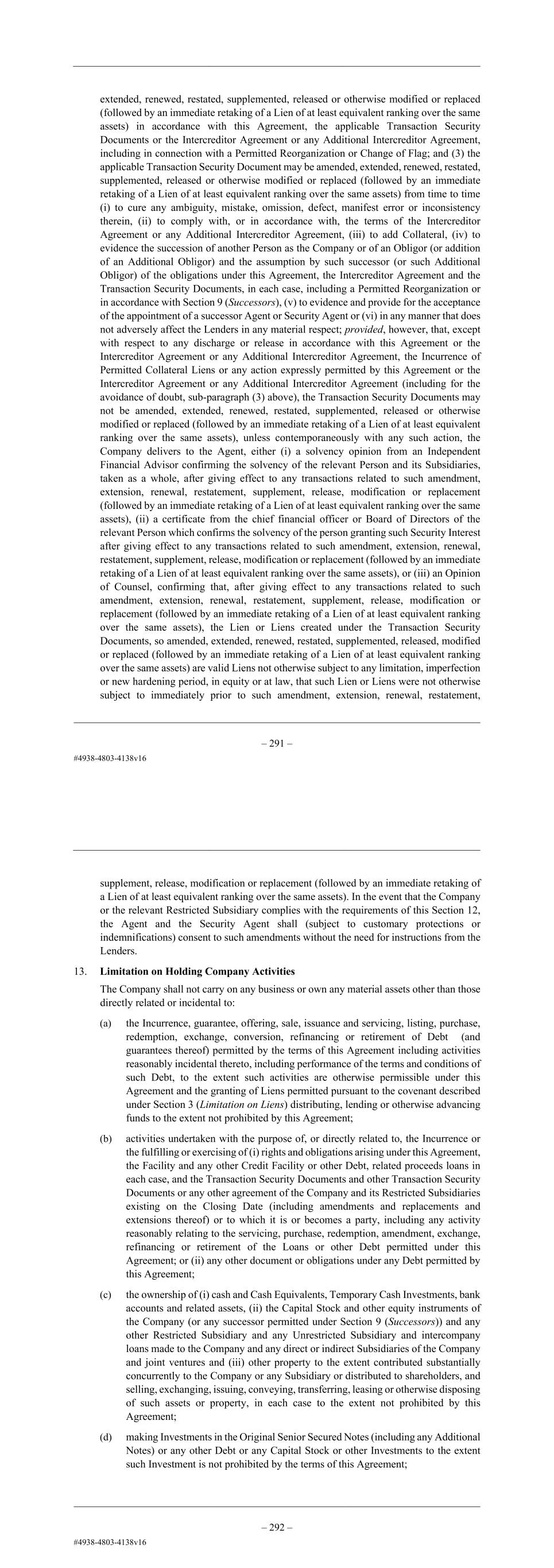 – 79 – Documents or the Intercreditor Agreement or any Additional Intercreditor Agreement, including in connection with a Permitted Reorganization or Change of Flag; and (3) the applicable Transaction Security Document may be amended, extended, renewed, restated, supplemented, released or otherwise modified or replaced (followed by an immediate retaking of a Lien of at least equivalent ranking over the same assets) from time to time (i) to cure any ambiguity, mistake, omission, defect, manifest error or inconsistency therein, (ii) to comply with, or in accordance with, the terms of the Intercreditor Agreement or any Additional Intercreditor Agreement, (iii) to add Collateral, (iv) to evidence the succession of another Person as the Company or of an Obligor (or addition of an Additional Obligor) and the assumption by such successor (or such Additional Obligor) of the obligations under this Agreement, the Intercreditor Agreement and the Transaction Security Documents, in each case, including a Permitted Reorganization or in accordance with Section 9 (Successors), (v) to evidence and provide for the acceptance of the appointment of a successor Agent or Security Agent or (vi) in any manner that does not adversely affect the Lenders in any material respect; provided, however, that, except with respect to any discharge or release in accordance with this Agreement or the Intercreditor Agreement or any Additional Intercreditor Agreement, the Incurrence of Permitted Collateral Liens or any action expressly permitted by this Agreement or the Intercreditor Agreement or any Additional Intercreditor Agreement (including for the avoidance of doubt, sub-paragraph (3) above), the Transaction Security Documents may not be amended, extended, renewed, restated, supplemented, released or otherwise modified or replaced (followed by an immediate retaking of a Lien of at least equivalent ranking over the same assets), unless contemporaneously with any such action, the Company delivers to the Agent, either (i) a solvency opinion from an Independent Financial Advisor confirming the solvency of the relevant Person and its Subsidiaries, taken as a whole, after giving effect to any transactions related to such amendment, extension, renewal, restatement, supplement, release, modification or replacement (followed by an immediate retaking of a Lien of at least equivalent ranking over the same assets), (ii) a certificate from the chief financial officer or Board of Directors of the relevant Person which confirms the solvency of the person granting such Security Interest after giving effect to any transactions related to such amendment, extension, renewal, restatement, supplement, release, modification or replacement (followed by an immediate retaking of a Lien of at least equivalent ranking over the same assets), or (iii) an Opinion of Counsel, confirming that, after giving effect to any transactions related to such amendment, extension, renewal, restatement, supplement, release, modification or replacement (followed by an immediate retaking of a Lien of at least equivalent ranking over the same assets), the Lien or Liens created under the Transaction Security Documents, so amended, extended, renewed, restated, supplemented, released, modified or replaced (followed by an immediate retaking of a Lien of at least equivalent ranking over the same assets) are valid Liens not otherwise subject to any limitation, imperfection or new hardening period, in equity or at law, that such Lien or Liens were not otherwise subject to immediately prior to such amendment, extension, renewal, restatement, supplement, release, modification or replacement (followed by an immediate retaking of a Lien of at least equivalent ranking over the same assets). In the event that the Company or the relevant Restricted Subsidiary complies with the requirements of this Section 12, – 80 – the Agent and the Security Agent shall (subject to customary protections or indemnifications) consent to such amendments without the need for instructions from the Lenders. 13. Limitation on Holding Company Activities The Company shall not carry on any business or own any material assets other than those directly related or incidental to: (a) the Incurrence, guarantee, offering, sale, issuance and servicing, listing, purchase, redemption, exchange, conversion, refinancing or retirement of Debt (and guarantees thereof) permitted by the terms of this Agreement including activities reasonably incidental thereto, including performance of the terms and conditions of such Debt, to the extent such activities are otherwise permissible under this Agreement and the granting of Liens permitted pursuant to the covenant described under Section 3 (Limitation on Liens) distributing, lending or otherwise advancing funds to the extent not prohibited by this Agreement; (b) activities undertaken with the purpose of, or directly related to, the Incurrence or the fulfilling or exercising of (i) rights and obligations arising under this Agreement, the Facility and any other Credit Facility or other Debt, related proceeds loans in each case, and the Transaction Security Documents and other Transaction Security Documents or any other agreement of the Company and its Restricted Subsidiaries existing on the Issue Date (including amendments and replacements and extensions thereof) or to which it is or becomes a party, including any activity reasonably relating to the servicing, purchase, redemption, amendment, exchange, refinancing or retirement of the Loans or other Debt permitted under this Agreement; or (ii) any other document or obligations under any Debt permitted by this Agreement; (c) the ownership of (i) cash and Cash Equivalents, Temporary Cash Investments, bank accounts and related assets, (ii) the Capital Stock and other equity instruments of the Company (or any successor permitted under Section 9 (Successors)) and any other Restricted Subsidiary and any Unrestricted Subsidia