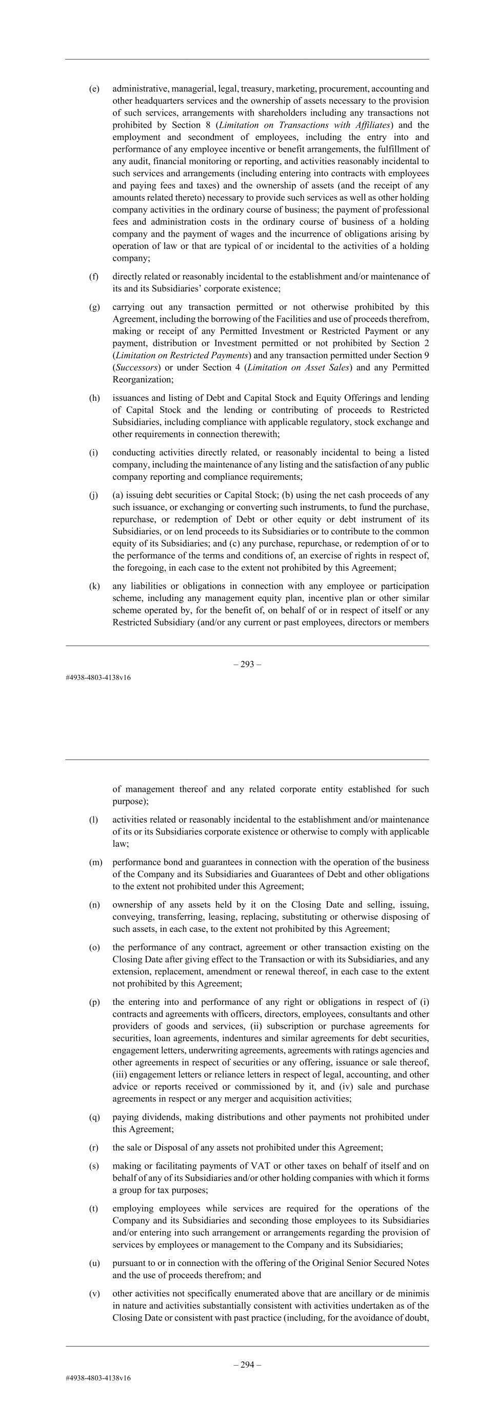 – 81 – employment and secondment of employees, including the entry into and performance of any employee incentive or benefit arrangements, the fulfillment of any audit, financial monitoring or reporting, and activities reasonably incidental to such services and arrangements (including entering into contracts with employees and paying fees and taxes) and the ownership of assets (and the receipt of any amounts related thereto) necessary to provide such services as well as other holding company activities in the ordinary course of business; the payment of professional fees and administration costs in the ordinary course of business of a holding company and the payment of wages and the incurrence of obligations arising by operation of law or that are typical of or incidental to the activities of a holding company; (f) directly related or reasonably incidental to the establishment and/or maintenance of its and its Subsidiaries’ corporate existence; (g) carrying out any transaction permitted or not otherwise prohibited by this Agreement, including the borrowing of the Facilities and use of proceeds therefrom, making or receipt of any Permitted Investment or Restricted Payment or any payment, distribution or Investment permitted or not prohibited by Section 2 (Limitation on Restricted Payments) and any transaction permitted under Section 9 (Successors) or under Section 4 (Limitation on Asset Sales) and any Permitted Reorganization; (h) issuances and listing of Debt and Capital Stock and Equity Offerings and lending of Capital Stock and the lending or contributing of proceeds to Restricted Subsidiaries, including compliance with applicable regulatory, stock exchange and other requirements in connection therewith; (i) conducting activities directly related, or reasonably incidental to being a listed company, including the maintenance of any listing and the satisfaction of any public company reporting and compliance requirements; (j) (a) issuing debt securities or Capital Stock; (b) using the net cash proceeds of any such issuance, or exchanging or converting such instruments, to fund the purchase, repurchase, or redemption of Debt or other equity or debt instrument of its Subsidiaries, or on lend proceeds to its Subsidiaries or to contribute to the common equity of its Subsidiaries; and (c) any purchase, repurchase, or redemption of or to the performance of the terms and conditions of, an exercise of rights in respect of, the foregoing, in each case to the extent not prohibited by this Agreement; (k) any liabilities or obligations in connection with any employee or participation scheme, including any management equity plan, incentive plan or other similar scheme operated by, for the benefit of, on behalf of or in respect of itself or any Restricted Subsidiary (and/or any current or past employees, directors or members of management thereof and any related corporate entity established for such purpose); – 82 – (l) activities related or reasonably incidental to the establishment and/or maintenance of its or its Subsidiaries corporate existence or otherwise to comply with applicable law; (m) performance bond and guarantees in connection with the operation of the business of the Company and its Subsidiaries and Guarantees of Debt and other obligations to the extent not prohibited under this Agreement; (n) ownership of any assets held by it on the Issue Date and selling, issuing, conveying, transferring, leasing, replacing, substituting or otherwise disposing of such assets, in each case, to the extent not prohibited by this Agreement; (o) the performance of any contract, agreement or other transaction existing on the Issue Date after giving effect to the Transaction or with its Subsidiaries, and any extension, replacement, amendment or renewal thereof, in each case to the extent not prohibited by this Agreement; (p) the entering into and performance of any right or obligations in respect of (i) contracts and agreements with officers, directors, employees, consultants and other providers of goods and services, (ii) subscription or purchase agreements for securities, loan agreements, indentures and similar agreements for debt securities, engagement letters, underwriting agreements, agreements with ratings agencies and other agreements in respect of securities or any offering, issuance or sale thereof, (iii) engagement letters or reliance letters in respect of legal, accounting, and other advice or reports received or commissioned by it, and (iv) sale and purchase agreements in respect or any merger and acquisition activities; (q) paying dividends, making distributions and other payments not prohibited under this Agreement; (r) the sale or Disposal of any assets not prohibited under this Agreement; (s) making or facilitating payments of VAT or other taxes on behalf of itself and on behalf of any of its Subsidiaries and/or other holding companies with which it forms a group for tax purposes; (t) employing employees while services are required for the operations of the Company and its Subsidiaries and seconding those employees to its Subsidiaries and/or entering into such arrangement or arrangements regarding the provision of services by employees or management to the Company and its Subsidiaries; (u) pursuant to or in connection with the offering of the Original Senior Secured Notes and the use of proceeds therefrom; and (v) other activities not specifically enumerated above that are ancillary or de minimis in nature and activities substantially consistent with activities undertaken as of the Issue Date or consistent with past practice (including, for the avoidance of doubt, strategic advice services, support services, the creation, development, sale, licensing, acquisition or disposition activities and the exploitation of intellectual property rights).