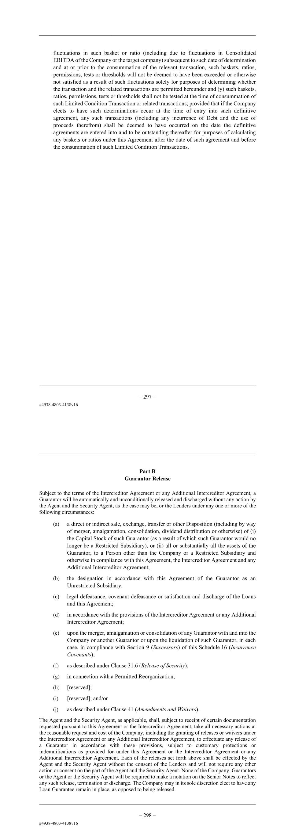 – 85 – not satisfied as a result of such fluctuations solely for purposes of determining whether the transaction and the related transactions are permitted hereunder and (y) such baskets, ratios, permissions, tests or thresholds shall not be tested at the time of consummation of such Limited Condition Transaction or related transactions; provided that if the Company elects to have such determinations occur at the time of entry into such definitive agreement, any such transactions (including any incurrence of Debt and the use of proceeds therefrom) shall be deemed to have occurred on the date the definitive agreements are entered into and to be outstanding thereafter for purposes of calculating any baskets or ratios under this Agreement after the date of such agreement and before the consummation of such Limited Condition Transactions. – 86 – Part B Guarantor Release Subject to the terms of the Intercreditor Agreement or any Additional Intercreditor Agreement, a Guarantor will be automatically and unconditionally released and discharged without any action by the Agent and the Security Agent, as the case may be, or the Lenders under any one or more of the following circumstances: (a) a direct or indirect sale, exchange, transfer or other Disposition (including by way of merger, amalgamation, consolidation, dividend distribution or otherwise) of (i) the Capital Stock of such Guarantor (as a result of which such Guarantor would no longer be a Restricted Subsidiary), or (ii) all or substantially all the assets of the Guarantor, to a Person other than the Company or a Restricted Subsidiary and otherwise in compliance with this Agreement, the Intercreditor Agreement and any Additional Intercreditor Agreement; (b) the designation in accordance with this Agreement of the Guarantor as an Unrestricted Subsidiary; (c) legal defeasance, covenant defeasance or satisfaction and discharge of the Loans and this Agreement; (d) in accordance with the provisions of the Intercreditor Agreement or any Additional Intercreditor Agreement; (e) upon the merger, amalgamation or consolidation of any Guarantor with and into the Company or another Guarantor or upon the liquidation of such Guarantor, in each case, in compliance with Section 9 (Successors) of this Schedule 16 (Incurrence Covenants); (f) as described under Clause 31.6 (Release of Security); (g) in connection with a Permitted Reorganization; (h) [reserved]; (i) [reserved]; and/or (j) as described under Clause 41 (Amendments and Waivers). The Agent and the Security Agent, as applicable, shall, subject to receipt of certain documentation requested pursuant to this Agreement or the Intercreditor Agreement, take all necessary actions at the reasonable request and cost of the Company, including the granting of releases or waivers under the Intercreditor Agreement or any Additional Intercreditor Agreement, to effectuate any release of a Guarantor in accordance with these provisions, subject to customary protections or indemnifications as provided for under this Agreement or the Intercreditor Agreement or any Additional Intercreditor Agreement. Each of the releases set forth above shall be effected by the Agent and the Security Agent without the consent of the Lenders and will not require any other action or consent on the part of the Agent and the Security Agent. None of the Company, Guarantors or the Agent or the Security Agent will be required to make a notation on the Senior Notes to reflect any such release, termination or discharge. The Company may in its sole discretion elect to have any Loan Guarantee remain in place, as opposed to being released.