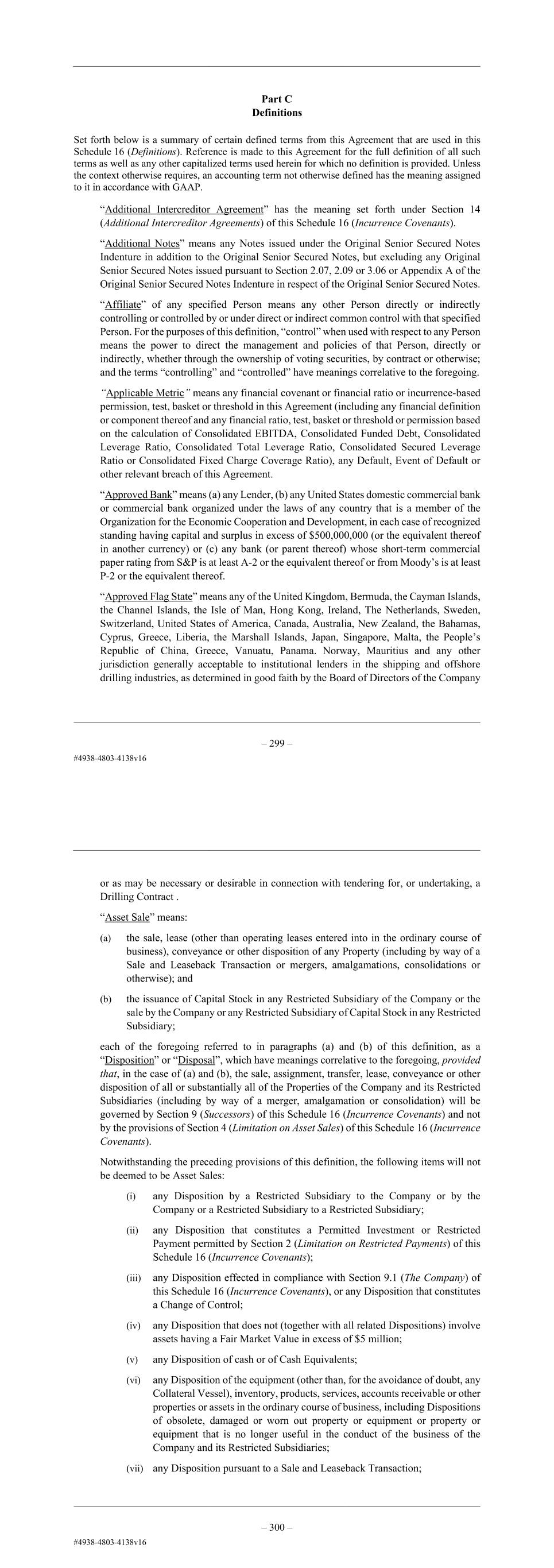 – 87 – Part C Definitions Set forth below is a summary of certain defined terms from this Agreement that are used in this Schedule 16 (Definitions). Reference is made to this Agreement for the full definition of all such terms as well as any other capitalized terms used herein for which no definition is provided. Unless the context otherwise requires, an accounting term not otherwise defined has the meaning assigned to it in accordance with GAAP. “Additional Intercreditor Agreement” has the meaning set forth under Section 14 (Additional Intercreditor Agreements) of this Schedule 16 (Incurrence Covenants). “Additional Notes” means any Notes issued under the Original Senior Secured Notes Indenture in addition to the Original Senior Secured Notes, but excluding any Original Senior Secured Notes issued pursuant to Section 2.07, 2.09 or 3.06 or Appendix A of the Original Senior Secured Notes Indenture in respect of the Original Senior Secured Notes. “Affiliate” of any specified Person means any other Person directly or indirectly controlling or controlled by or under direct or indirect common control with that specified Person. For the purposes of this definition, “control” when used with respect to any Person means the power to direct the management and policies of that Person, directly or indirectly, whether through the ownership of voting securities, by contract or otherwise; and the terms “controlling” and “controlled” have meanings correlative to the foregoing. “Applicable Metric” means any financial covenant or financial ratio or incurrence-based permission, test, basket or threshold in this Agreement (including any financial definition or component thereof and any financial ratio, test, basket or threshold or permission based on the calculation of Consolidated EBITDA, Consolidated Funded Debt, Consolidated Leverage Ratio, Consolidated Total Leverage Ratio, Consolidated Secured Leverage Ratio or Consolidated Fixed Charge Coverage Ratio), any Default, Event of Default or other relevant breach of this Agreement. “Approved Bank” means (a) any Lender, (b) any United States domestic commercial bank or commercial bank organized under the laws of any country that is a member of the Organization for the Economic Cooperation and Development, in each case of recognized standing having capital and surplus in excess of $500,000,000 (or the equivalent thereof in another currency) or (c) any bank (or parent thereof) whose short-term commercial paper rating from S&P is at least A-2 or the equivalent thereof or from Moody’s is at least P-2 or the equivalent thereof. “Approved Flag State” means any of the United Kingdom, Bermuda, the Cayman Islands, the Channel Islands, the Isle of Man, Hong Kong, Ireland, The Netherlands, Sweden, Switzerland, United States of America, Canada, Australia, New Zealand, the Bahamas, Cyprus, Greece, Liberia, the Marshall Islands, Japan, Singapore, Malta, the People’s Republic of China, Greece, Vanuatu, Panama. Norway, Mauritius and any other jurisdiction generally acceptable to institutional lenders in the shipping and offshore drilling industries, as determined in good faith by the Board of Directors of the Company – 88 – or as may be necessary or desirable in connection with tendering for, or undertaking, a Drilling Contract . “Asset Sale” means: (a) the sale, lease (other than operating leases entered into in the ordinary course of business), conveyance or other disposition of any Property (including by way of a Sale and Leaseback Transaction or mergers, amalgamations, consolidations or otherwise); and (b) the issuance of Capital Stock in any Restricted Subsidiary of the Company or the sale by the Company or any Restricted Subsidiary of Capital Stock in any Restricted Subsidiary; each of the foregoing referred to in paragraphs (a) and (b) of this definition, as a “Disposition” or “Disposal”, which have meanings correlative to the foregoing, provided that, in the case of (a) and (b), the sale, assignment, transfer, lease, conveyance or other disposition of all or substantially all of the Properties of the Company and its Restricted Subsidiaries (including by way of a merger, amalgamation or consolidation) will be governed by Section 9 (Successors) of this Schedule 16 (Incurrence Covenants) and not by the provisions of Section 4 (Limitation on Asset Sales) of this Schedule 16 (Incurrence Covenants). Notwithstanding the preceding provisions of this definition, the following items will not be deemed to be Asset Sales: (i) any Disposition by a Restricted Subsidiary to the Company or by the Company or a Restricted Subsidiary to a Restricted Subsidiary; (ii) any Disposition that constitutes a Permitted Investment or Restricted Payment permitted by Section 2 (Limitation on Restricted Payments) of this Schedule 16 (Incurrence Covenants); (iii) any Disposition effected in compliance with Section 9.1 (The Company) of this Schedule 16 (Incurrence Covenants), or any Disposition that constitutes a Change of Control; (iv) any Disposition that does not (together with all related Dispositions) involve assets having a Fair Market Value in excess of $5 million; (v) any Disposition of cash or of Cash Equivalents; (vi) any Disposition of the equipment (other than, for the avoidance of doubt, any Collateral Vessel), inventory, products, services, accounts receivable or other properties or assets in the ordinary course of business, including Dispositions of obsolete, damaged or worn out property or equipment or property or equipment that is no longer useful in the conduct of the business of the Company and its Restricted Subsidiaries; (vii) any Disposition pursuant to a Sale and Leaseback Transaction;