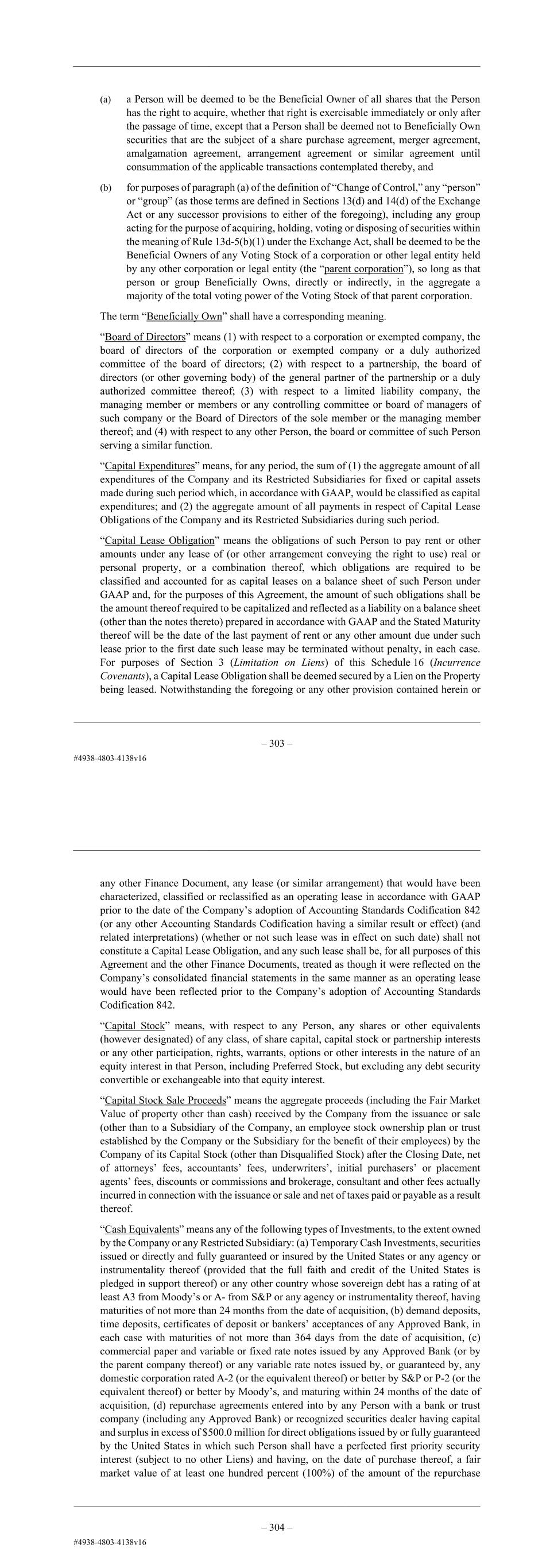 – 91 – (a) a Person will be deemed to be the Beneficial Owner of all shares that the Person has the right to acquire, whether that right is exercisable immediately or only after the passage of time, except that a Person shall be deemed not to Beneficially Own securities that are the subject of a share purchase agreement, merger agreement, amalgamation agreement, arrangement agreement or similar agreement until consummation of the applicable transactions contemplated thereby, and (b) for purposes of paragraph (a) of the definition of “Change of Control,” any “person” or “group” (as those terms are defined in Sections 13(d) and 14(d) of the Exchange Act or any successor provisions to either of the foregoing), including any group acting for the purpose of acquiring, holding, voting or disposing of securities within the meaning of Rule 13d-5(b)(1) under the Exchange Act, shall be deemed to be the Beneficial Owners of any Voting Stock of a corporation or other legal entity held by any other corporation or legal entity (the “parent corporation”), so long as that person or group Beneficially Owns, directly or indirectly, in the aggregate a majority of the total voting power of the Voting Stock of that parent corporation. The term “Beneficially Own” shall have a corresponding meaning. “Board of Directors” means (1) with respect to a corporation or exempted company, the board of directors of the corporation or exempted company or a duly authorized committee of the board of directors; (2) with respect to a partnership, the board of directors (or other governing body) of the general partner of the partnership or a duly authorized committee thereof; (3) with respect to a limited liability company, the managing member or members or any controlling committee or board of managers of such company or the Board of Directors of the sole member or the managing member thereof; and (4) with respect to any other Person, the board or committee of such Person serving a similar function. “Capital Expenditures” means, for any period, the sum of (1) the aggregate amount of all expenditures of the Company and its Restricted Subsidiaries for fixed or capital assets made during such period which, in accordance with GAAP, would be classified as capital expenditures; and (2) the aggregate amount of all payments in respect of Capital Lease Obligations of the Company and its Restricted Subsidiaries during such period. “Capital Lease Obligation” means the obligations of such Person to pay rent or other amounts under any lease of (or other arrangement conveying the right to use) real or personal property, or a combination thereof, which obligations are required to be classified and accounted for as capital leases on a balance sheet of such Person under GAAP and, for the purposes of this Agreement, the amount of such obligations shall be the amount thereof required to be capitalized and reflected as a liability on a balance sheet (other than the notes thereto) prepared in accordance with GAAP and the Stated Maturity thereof will be the date of the last payment of rent or any other amount due under such lease prior to the first date such lease may be terminated without penalty, in each case. For purposes of Section 3 (Limitation on Liens) of this Schedule 16 (Incurrence Covenants), a Capital Lease Obligation shall be deemed secured by a Lien on the Property being leased. Notwithstanding the foregoing or any other provision contained herein or – 92 – any other Finance Document, any lease (or similar arrangement) that would have been characterized, classified or reclassified as an operating lease in accordance with GAAP prior to the date of the Company’s adoption of Accounting Standards Codification 842 (or any other Accounting Standards Codification having a similar result or effect) (and related interpretations) (whether or not such lease was in effect on such date) shall not constitute a Capital Lease Obligation, and any such lease shall be, for all purposes of this Agreement and the other Finance Documents, treated as though it were reflected on the Company’s consolidated financial statements in the same manner as an operating lease would have been reflected prior to the Company’s adoption of Accounting Standards Codification 842. “Capital Stock” means, with respect to any Person, any shares or other equivalents (however designated) of any class, of share capital, capital stock or partnership interests or any other participation, rights, warrants, options or other interests in the nature of an equity interest in that Person, including Preferred Stock, but excluding any debt security convertible or exchangeable into that equity interest. “Capital Stock Sale Proceeds” means the aggregate proceeds (including the Fair Market Value of property other than cash) received by the Company from the issuance or sale (other than to a Subsidiary of the Company, an employee stock ownership plan or trust established by the Company or the Subsidiary for the benefit of their employees) by the Company of its Capital Stock (other than Disqualified Stock) after the Closing Date, net of attorneys’ fees, accountants’ fees, underwriters’, initial purchasers’ or placement agents’ fees, discounts or commissions and brokerage, consultant and other fees actually incurred in connection with the issuance or sale and net of taxes paid or payable as a result thereof. “Cash Equivalents” means any of the following types of Investments, to the extent owned by the Company or any Restricted Subsidiary: (a) Temporary Cash Investments, securities issued or directly and fully guaranteed or insured by the United States or any agency or instrumentality thereof (provided that the full faith and credit of the United States is pledged in support thereof) or any other country whose sovereign debt has a rating of at least A3 from Moody’s or A- from S&P or any agency or instrumentality thereof, having 