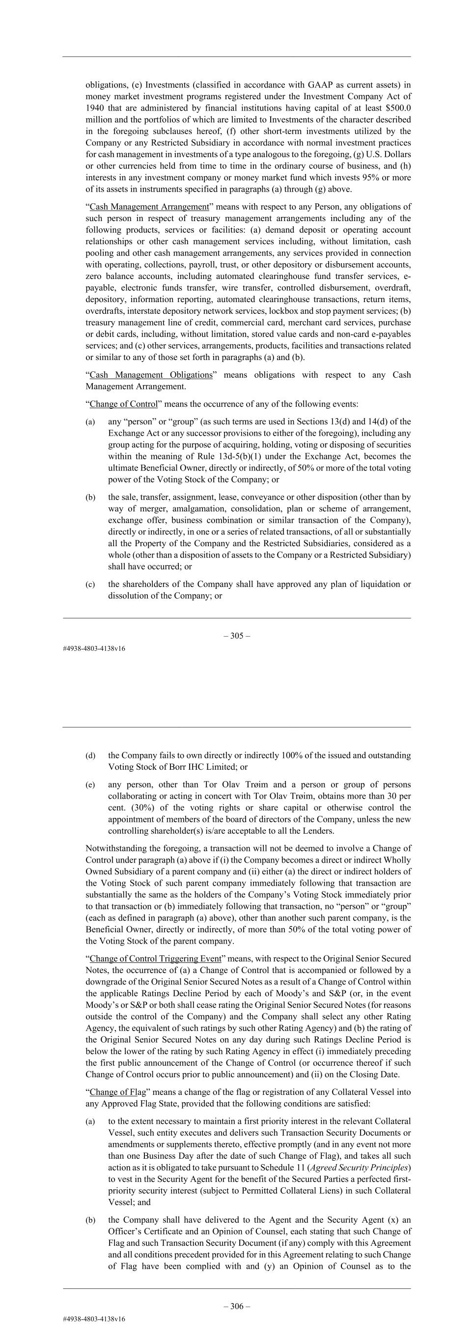 – 93 – obligations, (e) Investments (classified in accordance with GAAP as current assets) in money market investment programs registered under the Investment Company Act of 1940 that are administered by financial institutions having capital of at least $500.0 million and the portfolios of which are limited to Investments of the character described in the foregoing subclauses hereof, (f) other short-term investments utilized by the Company or any Restricted Subsidiary in accordance with normal investment practices for cash management in investments of a type analogous to the foregoing, (g) U.S. Dollars or other currencies held from time to time in the ordinary course of business, and (h) interests in any investment company or money market fund which invests 95% or more of its assets in instruments specified in paragraphs (a) through (g) above. “Cash Management Arrangement” means with respect to any Person, any obligations of such person in respect of treasury management arrangements including any of the following products, services or facilities: (a) demand deposit or operating account relationships or other cash management services including, without limitation, cash pooling and other cash management arrangements, any services provided in connection with operating, collections, payroll, trust, or other depository or disbursement accounts, zero balance accounts, including automated clearinghouse fund transfer services, e- payable, electronic funds transfer, wire transfer, controlled disbursement, overdraft, depository, information reporting, automated clearinghouse transactions, return items, overdrafts, interstate depository network services, lockbox and stop payment services; (b) treasury management line of credit, commercial card, merchant card services, purchase or debit cards, including, without limitation, stored value cards and non-card e-payables services; and (c) other services, arrangements, products, facilities and transactions related or similar to any of those set forth in paragraphs (a) and (b). “Cash Management Obligations” means obligations with respect to any Cash Management Arrangement. “Change of Control” means the occurrence of any of the following events: (a) any “person” or “group” (as such terms are used in Sections 13(d) and 14(d) of the Exchange Act or any successor provisions to either of the foregoing), including any group acting for the purpose of acquiring, holding, voting or disposing of securities within the meaning of Rule 13d-5(b)(1) under the Exchange Act, becomes the ultimate Beneficial Owner, directly or indirectly, of 50% or more of the total voting power of the Voting Stock of the Company; or (b) the sale, transfer, assignment, lease, conveyance or other disposition (other than by way of merger, amalgamation, consolidation, plan or scheme of arrangement, exchange offer, business combination or similar transaction of the Company), directly or indirectly, in one or a series of related transactions, of all or substantially all the Property of the Company and the Restricted Subsidiaries, considered as a whole (other than a disposition of assets to the Company or a Restricted Subsidiary) shall have occurred; or (c) the shareholders of the Company shall have approved any plan of liquidation or dissolution of the Company; or – 94 – (d) the Company fails to own directly or indirectly 100% of the issued and outstanding Voting Stock of Borr IHC Limited; or (e) any person, other than Tor Olav Trøim and a person or group of persons collaborating or acting in concert with Tor Olav Trøim, obtains more than 30 per cent. (30%) of the voting rights or share capital or otherwise control the appointment of members of the board of directors of the Company, unless the new controlling shareholder(s) is/are acceptable to all the Lenders. Notwithstanding the foregoing, a transaction will not be deemed to involve a Change of Control under paragraph (a) above if (i) the Company becomes a direct or indirect Wholly Owned Subsidiary of a parent company and (ii) either (a) the direct or indirect holders of the Voting Stock of such parent company immediately following that transaction are substantially the same as the holders of the Company’s Voting Stock immediately prior to that transaction or (b) immediately following that transaction, no “person” or “group” (each as defined in paragraph (a) above), other than another such parent company, is the Beneficial Owner, directly or indirectly, of more than 50% of the total voting power of the Voting Stock of the parent company. “Change of Control Triggering Event” means, with respect to the Original Senior Secured Notes, the occurrence of (a) a Change of Control that is accompanied or followed by a downgrade of the Original Senior Secured Notes as a result of a Change of Control within the applicable Ratings Decline Period by each of Moody’s and S&P (or, in the event Moody’s or S&P or both shall cease rating the Original Senior Secured Notes (for reasons outside the control of the Company) and the Company shall select any other Rating Agency, the equivalent of such ratings by such other Rating Agency) and (b) the rating of the Original Senior Secured Notes on any day during such Ratings Decline Period is below the lower of the rating by such Rating Agency in effect (i) immediately preceding the first public announcement of the Change of Control (or occurrence thereof if such Change of Control occurs prior to public announcement) and (ii) the Issue Date. “Change of Flag” means a change of the flag or registration of any Collateral Vessel into any Approved Flag State, provided that the following conditions are satisfied: (a) to the extent necessary to maintain a first priority interest in the relevant Collateral Vessel, such entity executes and delivers such Transaction Security Documents or amendments or supplements thereto, effective promptly (and in any event not more than one Busin