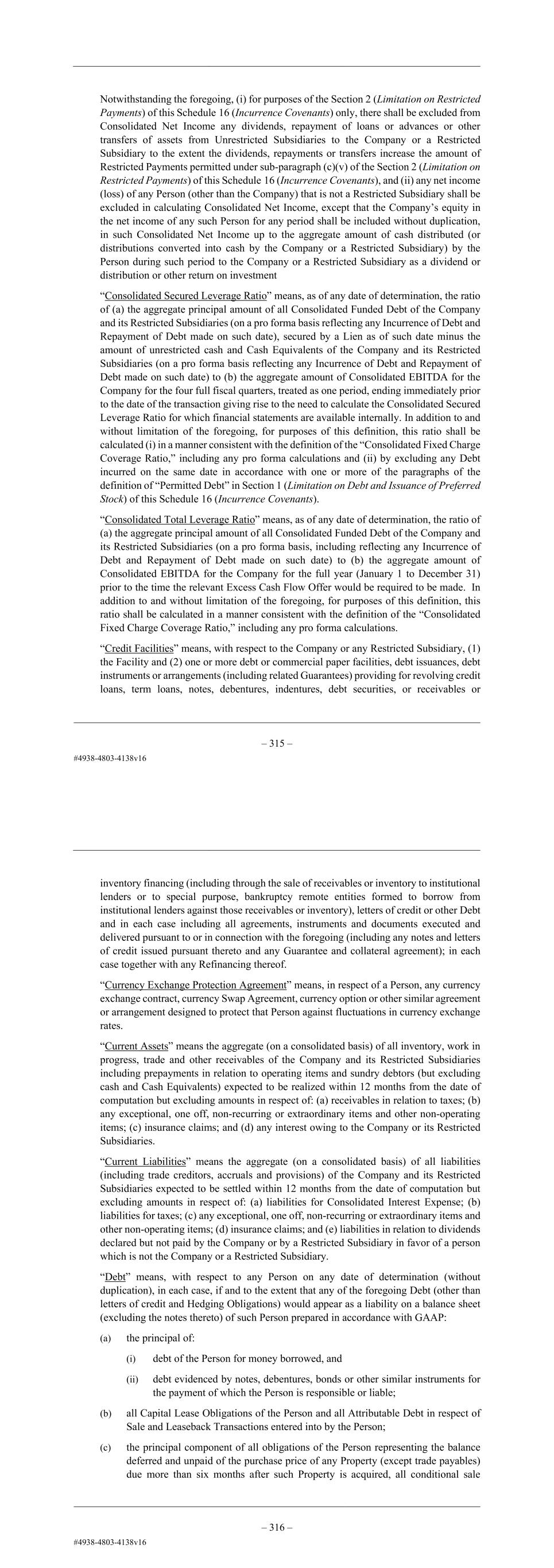– 103 – Notwithstanding the foregoing, (i) for purposes of the Section 2 (Limitation on Restricted Payments) of this Schedule 16 (Incurrence Covenants) only, there shall be excluded from Consolidated Net Income any dividends, repayment of loans or advances or other transfers of assets from Unrestricted Subsidiaries to the Company or a Restricted Subsidiary to the extent the dividends, repayments or transfers increase the amount of Restricted Payments permitted under sub-paragraph (c)(v) of the Section 2 (Limitation on Restricted Payments) of this Schedule 16 (Incurrence Covenants), and (ii) any net income (loss) of any Person (other than the Company) that is not a Restricted Subsidiary shall be excluded in calculating Consolidated Net Income, except that the Company’s equity in the net income of any such Person for any period shall be included without duplication, in such Consolidated Net Income up to the aggregate amount of cash distributed (or distributions converted into cash by the Company or a Restricted Subsidiary) by the Person during such period to the Company or a Restricted Subsidiary as a dividend or distribution or other return on investment “Consolidated Secured Leverage Ratio” means, as of any date of determination, the ratio of (a) the aggregate principal amount of all Consolidated Funded Debt of the Company and its Restricted Subsidiaries (on a pro forma basis reflecting any Incurrence of Debt and Repayment of Debt made on such date), secured by a Lien as of such date minus the amount of unrestricted cash and Cash Equivalents of the Company and its Restricted Subsidiaries (on a pro forma basis reflecting any Incurrence of Debt and Repayment of Debt made on such date) to (b) the aggregate amount of Consolidated EBITDA for the Company for the four full fiscal quarters, treated as one period, ending immediately prior to the date of the transaction giving rise to the need to calculate the Consolidated Secured Leverage Ratio for which financial statements are available internally. In addition to and without limitation of the foregoing, for purposes of this definition, this ratio shall be calculated (i) in a manner consistent with the definition of the “Consolidated Fixed Charge Coverage Ratio,” including any pro forma calculations and (ii) by excluding any Debt incurred on the same date in accordance with one or more of the paragraphs of the definition of “Permitted Debt” in Section 1 (Limitation on Debt and Issuance of Preferred Stock) of this Schedule 16 (Incurrence Covenants). “Consolidated Total Leverage Ratio” means, as of any date of determination, the ratio of (a) the aggregate principal amount of all Consolidated Funded Debt of the Company and its Restricted Subsidiaries (on a pro forma basis, including reflecting any Incurrence of Debt and Repayment of Debt made on such date) to (b) the aggregate amount of Consolidated EBITDA for the Company for the full year (January 1 to December 31) prior to the time the relevant Excess Cash Flow Offer would be required to be made. In addition to and without limitation of the foregoing, for purposes of this definition, this ratio shall be calculated in a manner consistent with the definition of the “Consolidated Fixed Charge Coverage Ratio,” including any pro forma calculations. “Credit Facilities” means, with respect to the Company or any Restricted Subsidiary, (1) the Facility and (2) one or more debt or commercial paper facilities, debt issuances, debt instruments or arrangements (including related Guarantees) providing for revolving credit loans, term loans, notes, debentures, indentures, debt securities, or receivables or – 104 – inventory financing (including through the sale of receivables or inventory to institutional lenders or to special purpose, bankruptcy remote entities formed to borrow from institutional lenders against those receivables or inventory), letters of credit or other Debt and in each case including all agreements, instruments and documents executed and delivered pursuant to or in connection with the foregoing (including any notes and letters of credit issued pursuant thereto and any Guarantee and collateral agreement); in each case together with any Refinancing thereof. “Currency Exchange Protection Agreement” means, in respect of a Person, any currency exchange contract, currency Swap Agreement, currency option or other similar agreement or arrangement designed to protect that Person against fluctuations in currency exchange rates. “Current Assets” means the aggregate (on a consolidated basis) of all inventory, work in progress, trade and other receivables of the Company and its Restricted Subsidiaries including prepayments in relation to operating items and sundry debtors (but excluding cash and Cash Equivalents) expected to be realized within 12 months from the date of computation but excluding amounts in respect of: (a) receivables in relation to taxes; (b) any exceptional, one off, non-recurring or extraordinary items and other non-operating items; (c) insurance claims; and (d) any interest owing to the Company or its Restricted Subsidiaries. “Current Liabilities” means the aggregate (on a consolidated basis) of all liabilities (including trade creditors, accruals and provisions) of the Company and its Restricted Subsidiaries expected to be settled within 12 months from the date of computation but excluding amounts in respect of: (a) liabilities for Consolidated Interest Expense; (b) liabilities for taxes; (c) any exceptional, one off, non-recurring or extraordinary items and other non-operating items; (d) insurance claims; and (e) liabilities in relation to dividends declared but not paid by the Company or by a Restricted Subsidiary in favor of a person which is not the Company or a Restricted Subsidiary. “Debt” means, with respect to any Person on any date of determination (without duplication), in each case, if and to the extent that any of the fore
