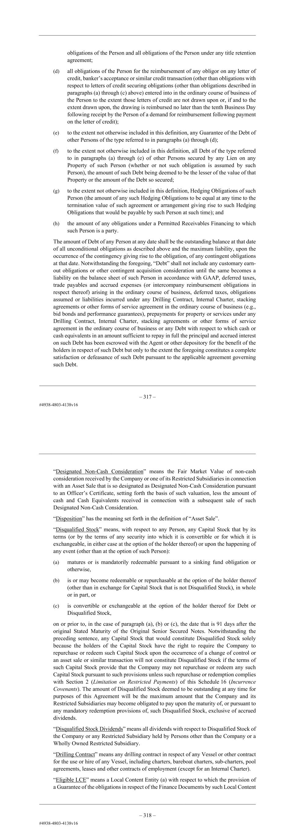 – 105 – obligations of the Person and all obligations of the Person under any title retention agreement; (d) all obligations of the Person for the reimbursement of any obligor on any letter of credit, banker’s acceptance or similar credit transaction (other than obligations with respect to letters of credit securing obligations (other than obligations described in paragraphs (a) through (c) above) entered into in the ordinary course of business of the Person to the extent those letters of credit are not drawn upon or, if and to the extent drawn upon, the drawing is reimbursed no later than the tenth Business Day following receipt by the Person of a demand for reimbursement following payment on the letter of credit); (e) to the extent not otherwise included in this definition, any Guarantee of the Debt of other Persons of the type referred to in paragraphs (a) through (d); (f) to the extent not otherwise included in this definition, all Debt of the type referred to in paragraphs (a) through (e) of other Persons secured by any Lien on any Property of such Person (whether or not such obligation is assumed by such Person), the amount of such Debt being deemed to be the lesser of the value of that Property or the amount of the Debt so secured; (g) to the extent not otherwise included in this definition, Hedging Obligations of such Person (the amount of any such Hedging Obligations to be equal at any time to the termination value of such agreement or arrangement giving rise to such Hedging Obligations that would be payable by such Person at such time); and (h) the amount of any obligations under a Permitted Receivables Financing to which such Person is a party. The amount of Debt of any Person at any date shall be the outstanding balance at that date of all unconditional obligations as described above and the maximum liability, upon the occurrence of the contingency giving rise to the obligation, of any contingent obligations at that date. Notwithstanding the foregoing, “Debt” shall not include any customary earn- out obligations or other contingent acquisition consideration until the same becomes a liability on the balance sheet of such Person in accordance with GAAP, deferred taxes, trade payables and accrued expenses (or intercompany reimbursement obligations in respect thereof) arising in the ordinary course of business, deferred taxes, obligations assumed or liabilities incurred under any Drilling Contract, Internal Charter, stacking agreements or other forms of service agreement in the ordinary course of business (e.g., bid bonds and performance guarantees), prepayments for property or services under any Drilling Contract, Internal Charter, stacking agreements or other forms of service agreement in the ordinary course of business or any Debt with respect to which cash or cash equivalents in an amount sufficient to repay in full the principal and accrued interest on such Debt has been escrowed with the Agent or other depository for the benefit of the holders in respect of such Debt but only to the extent the foregoing constitutes a complete satisfaction or defeasance of such Debt pursuant to the applicable agreement governing such Debt. – 106 – “Designated Non-Cash Consideration” means the Fair Market Value of non-cash consideration received by the Company or one of its Restricted Subsidiaries in connection with an Asset Sale that is so designated as Designated Non-Cash Consideration pursuant to an Officer’s Certificate, setting forth the basis of such valuation, less the amount of cash and Cash Equivalents received in connection with a subsequent sale of such Designated Non-Cash Consideration. “Disposition” has the meaning set forth in the definition of “Asset Sale”. “Disqualified Stock” means, with respect to any Person, any Capital Stock that by its terms (or by the terms of any security into which it is convertible or for which it is exchangeable, in either case at the option of the holder thereof) or upon the happening of any event (other than at the option of such Person): (a) matures or is mandatorily redeemable pursuant to a sinking fund obligation or otherwise, (b) is or may become redeemable or repurchasable at the option of the holder thereof (other than in exchange for Capital Stock that is not Disqualified Stock), in whole or in part, or (c) is convertible or exchangeable at the option of the holder thereof for Debt or Disqualified Stock, on or prior to, in the case of paragraph (a), (b) or (c), the date that is 91 days after the original Stated Maturity of the Original Senior Secured Notes. Notwithstanding the preceding sentence, any Capital Stock that would constitute Disqualified Stock solely because the holders of the Capital Stock have the right to require the Company to repurchase or redeem such Capital Stock upon the occurrence of a change of control or an asset sale or similar transaction will not constitute Disqualified Stock if the terms of such Capital Stock provide that the Company may not repurchase or redeem any such Capital Stock pursuant to such provisions unless such repurchase or redemption complies with Section 2 (Limitation on Restricted Payments) of this Schedule 16 (Incurrence Covenants). The amount of Disqualified Stock deemed to be outstanding at any time for purposes of this Agreement will be the maximum amount that the Company and its Restricted Subsidiaries may become obligated to pay upon the maturity of, or pursuant to any mandatory redemption provisions of, such Disqualified Stock, exclusive of accrued dividends. “Disqualified Stock Dividends” means all dividends with respect to Disqualified Stock of the Company or any Restricted Subsidiary held by Persons other than the Company or a Wholly Owned Restricted Subsidiary. “Drilling Contract” means any drilling contract in respect of any Vessel or other contract for the use or hire of any Vessel, including charters, bareboat charters, sub-charters, pool agreeme