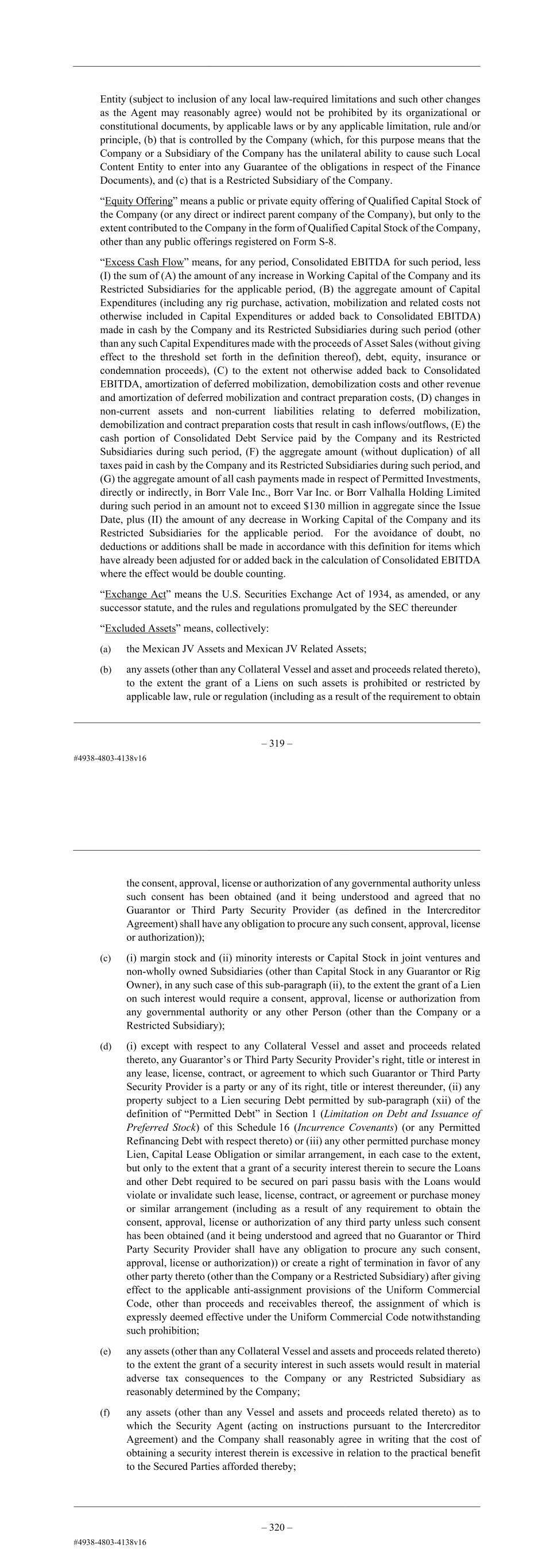 – 107 – Entity (subject to inclusion of any local law-required limitations and such other changes as the Agent may reasonably agree) would not be prohibited by its organizational or constitutional documents, by applicable laws or by any applicable limitation, rule and/or principle, (b) that is controlled by the Company (which, for this purpose means that the Company or a Subsidiary of the Company has the unilateral ability to cause such Local Content Entity to enter into any Guarantee of the obligations in respect of the Finance Documents), and (c) that is a Restricted Subsidiary of the Company. “Equity Offering” means a public or private equity offering of Qualified Capital Stock of the Company (or any direct or indirect parent company of the Company), but only to the extent contributed to the Company in the form of Qualified Capital Stock of the Company, other than any public offerings registered on Form S-8. “Excess Cash Flow” means, for any period, Consolidated EBITDA for such period, less (I) the sum of (A) the amount of any increase in Working Capital of the Company and its Restricted Subsidiaries for the applicable period, (B) the aggregate amount of Capital Expenditures (including any rig purchase, activation, mobilization and related costs not otherwise included in Capital Expenditures or added back to Consolidated EBITDA) made in cash by the Company and its Restricted Subsidiaries during such period (other than any such Capital Expenditures made with the proceeds of Asset Sales (without giving effect to the threshold set forth in the definition thereof), debt, equity, insurance or condemnation proceeds), (C) to the extent not otherwise added back to Consolidated EBITDA, amortization of deferred mobilization, demobilization costs and other revenue and amortization of deferred mobilization and contract preparation costs, (D) changes in non-current assets and non-current liabilities relating to deferred mobilization, demobilization and contract preparation costs that result in cash inflows/outflows, (E) the cash portion of Consolidated Debt Service paid by the Company and its Restricted Subsidiaries during such period, (F) the aggregate amount (without duplication) of all taxes paid in cash by the Company and its Restricted Subsidiaries during such period, and (G) the aggregate amount of all cash payments made in respect of Permitted Investments, directly or indirectly, in Borr Vale Inc., Borr Var Inc. or Borr Valhalla Holding Limited during such period in an amount not to exceed $130 million in aggregate since the Issue Date, plus (II) the amount of any decrease in Working Capital of the Company and its Restricted Subsidiaries for the applicable period. For the avoidance of doubt, no deductions or additions shall be made in accordance with this definition for items which have already been adjusted for or added back in the calculation of Consolidated EBITDA where the effect would be double counting. “Exchange Act” means the U.S. Securities Exchange Act of 1934, as amended, or any successor statute, and the rules and regulations promulgated by the SEC thereunder “Excluded Assets” means, collectively: (a) the Mexican JV Assets and Mexican JV Related Assets; (b) any assets (other than any Collateral Vessel and asset and proceeds related thereto), to the extent the grant of a Liens on such assets is prohibited or restricted by applicable law, rule or regulation (including as a result of the requirement to obtain – 108 – the consent, approval, license or authorization of any governmental authority unless such consent has been obtained (and it being understood and agreed that no Guarantor or Third Party Security Provider (as defined in the Intercreditor Agreement) shall have any obligation to procure any such consent, approval, license or authorization)); (c) (i) margin stock and (ii) minority interests or Capital Stock in joint ventures and non-wholly owned Subsidiaries (other than Capital Stock in any Guarantor or Rig Owner), in any such case of this sub-paragraph (ii), to the extent the grant of a Lien on such interest would require a consent, approval, license or authorization from any governmental authority or any other Person (other than the Company or a Restricted Subsidiary); (d) (i) except with respect to any Collateral Vessel and asset and proceeds related thereto, any Guarantor’s or Third Party Security Provider’s right, title or interest in any lease, license, contract, or agreement to which such Guarantor or Third Party Security Provider is a party or any of its right, title or interest thereunder, (ii) any property subject to a Lien securing Debt permitted by sub-paragraph (xii) of the definition of “Permitted Debt” in Section 1 (Limitation on Debt and Issuance of Preferred Stock) of this Schedule 16 (Incurrence Covenants) (or any Permitted Refinancing Debt with respect thereto) or (iii) any other permitted purchase money Lien, Capital Lease Obligation or similar arrangement, in each case to the extent, but only to the extent that a grant of a security interest therein to secure the Loans and other Debt required to be secured on pari passu basis with the Loans would violate or invalidate such lease, license, contract, or agreement or purchase money or similar arrangement (including as a result of any requirement to obtain the consent, approval, license or authorization of any third party unless such consent has been obtained (and it being understood and agreed that no Guarantor or Third Party Security Provider shall have any obligation to procure any such consent, approval, license or authorization)) or create a right of termination in favor of any other party thereto (other than the Company or a Restricted Subsidiary) after giving effect to the applicable anti-assignment provisions of the Uniform Commercial Code, other than proceeds and receivables thereof, the assignment of which is expressly deemed effective under the Uniform Commercial C