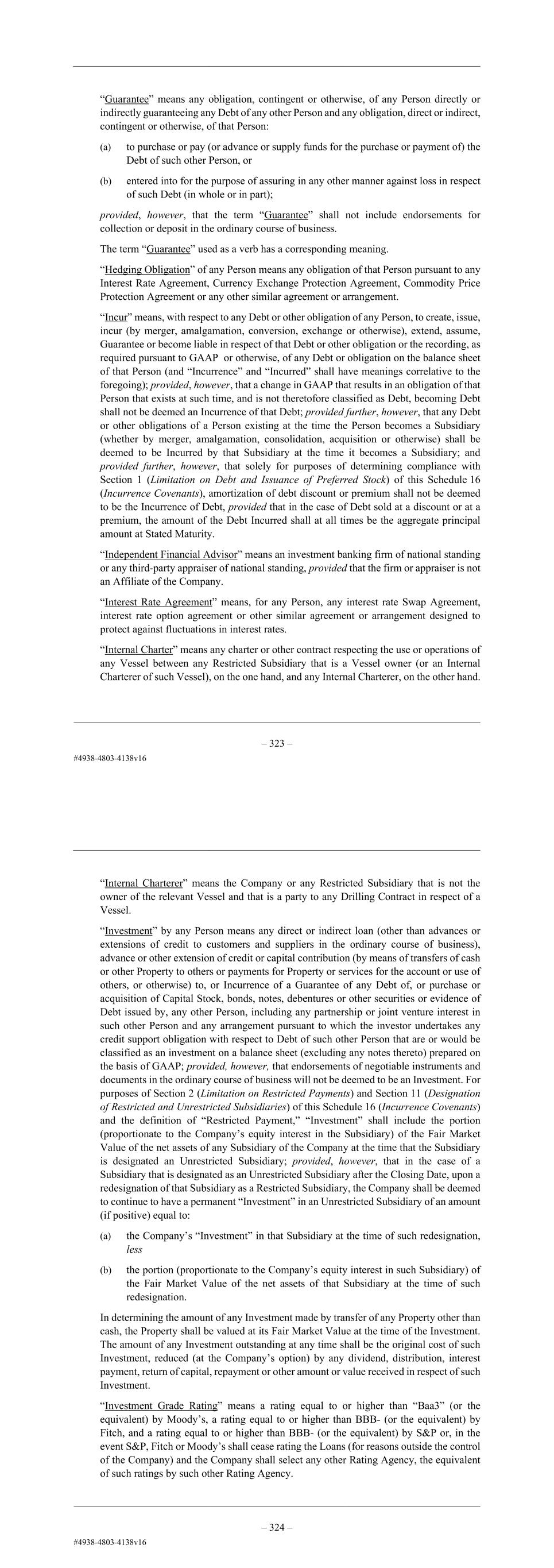 – 113 – is designated an Unrestricted Subsidiary; provided, however, that in the case of a Subsidiary that is designated as an Unrestricted Subsidiary after the Issue Date, upon a redesignation of that Subsidiary as a Restricted Subsidiary, the Company shall be deemed to continue to have a permanent “Investment” in an Unrestricted Subsidiary of an amount (if positive) equal to: (a) the Company’s “Investment” in that Subsidiary at the time of such redesignation, less (b) the portion (proportionate to the Company’s equity interest in such Subsidiary) of the Fair Market Value of the net assets of that Subsidiary at the time of such redesignation. In determining the amount of any Investment made by transfer of any Property other than cash, the Property shall be valued at its Fair Market Value at the time of the Investment. The amount of any Investment outstanding at any time shall be the original cost of such Investment, reduced (at the Company’s option) by any dividend, distribution, interest payment, return of capital, repayment or other amount or value received in respect of such Investment. “Investment Grade Rating” means a rating equal to or higher than “Baa3” (or the equivalent) by Moody’s, a rating equal to or higher than BBB- (or the equivalent) by Fitch, and a rating equal to or higher than BBB- (or the equivalent) by S&P or, in the event S&P, Fitch or Moody’s shall cease rating the Loans (for reasons outside the control of the Company) and the Company shall select any other Rating Agency, the equivalent of such ratings by such other Rating Agency. “Involuntary Disposition” means the receipt by the Company or any Restricted Subsidiary of any cash insurance proceeds or condemnation awards or expropriation compensation payable by reason of theft, loss, physical destruction or damage, taking or similar event with respect to any of its Property. “Issue Date” means November 7, 2023, the date on which the Original Senior Secured Notes are originally issued under the Original Senior Secured Notes Indenture. “Lien” means, with respect to any Property of any Person, any mortgage or deed of trust, pledge, hypothecation, assignment, assignment by way of security, deposit arrangement, security interest, lien, charge, easement (other than any easement not materially impairing usefulness or marketability), encumbrance, preference, priority or other security agreement or preferential arrangement of any kind or nature whatsoever on or with respect to that Property (including any Capital Lease Obligation, conditional sale or other title retention agreement having substantially the same economic effect as any of the foregoing or any Sale and Leaseback Transaction). “Limited Condition Transaction” means any investment, acquisition, disposition, sale, merger, joint venture, consolidation or other business combination transaction, Incurrence, Change of Control, assumption, commitment, issuance, Incurrence, repayment, repurchase or refinancing of Debt, redeemable Capital Stock or Preferred Stock and the use of proceeds thereof, any creation of a Lien, any designation of a – 114 – Restricted Subsidiary or Unrestricted Subsidiary, any asset sale or any other transaction for which an Applicable Metric falls to be determined; provided that, if any such transaction (the “first transaction”) is being effected in connection with another such transaction (the “second transaction”), the second transaction shall also be a Limited Condition Transaction with respect to the first transaction. “Limited Recourse Debt” means Debt Incurred by a Restricted Subsidiary (excluding, for the avoidance of doubt, the Company) that has no material assets or operations other than those related to the Vessels referred to below for the purpose of financing a portion of the purchase price of one or more Vessels, as and to the extent permitted pursuant to sub- paragraph (xxii) of the definition of “Permitted Debt” in Section 1 (Limitation on Debt and Issuance of Preferred Stock) of this Schedule 16 (Incurrence Covenants), which Debt may be secured by Liens on such Vessels and on any other assets acquired with the proceeds of such Debt pursuant to paragraph (jj) of the definition of “Permitted Liens” and any related assets related to the operation of such Vessels, including related Drilling Contracts, and the sole recourse of the holder of such Debt shall be to the Restricted Subsidiary that is the obligor of such Debt, to the assets permitted to secure such Debt pursuant to paragraph (jj) of the definition of “Permitted Liens” (including the Capital Stock in such Restricted Subsidiary), and such holder shall have no recourse to the Company or any other Restricted Subsidiary, or to any other of their respective assets (other than such Capital Stock); provided that such Debt may be guaranteed on an unsecured basis by the Company. “Loan Guarantee” means the guarantee of the Loans by a Guarantor pursuant to this Agreement. “Local Content Entity” means any Affiliate of the Company (a) that owns or is contemplated to own a Vessel or that is party to or contemplated to be party to a charter party agreement, Drilling Contract or any demise, bareboat, time, voyage, other charter, lease or other right to use of a Vessel owned by it or by the Company, any Restricted Subsidiary or another Local Content Entity and (b) the capital stock, shares or other Capital Stock of which is jointly owned by the Company or any Restricted Subsidiary and any other Person that is required or necessary under local law or custom to own capital stock, shares or other Capital Stock in the Local Content Entity as a condition for (i) the operation of a Vessel in such jurisdiction, (ii) the ownership of any asset owned, or contemplated to be acquired, by such entity in such jurisdiction or (iii) the business transacted, or contemplated to be transacted, by such entity in such jurisdiction; 