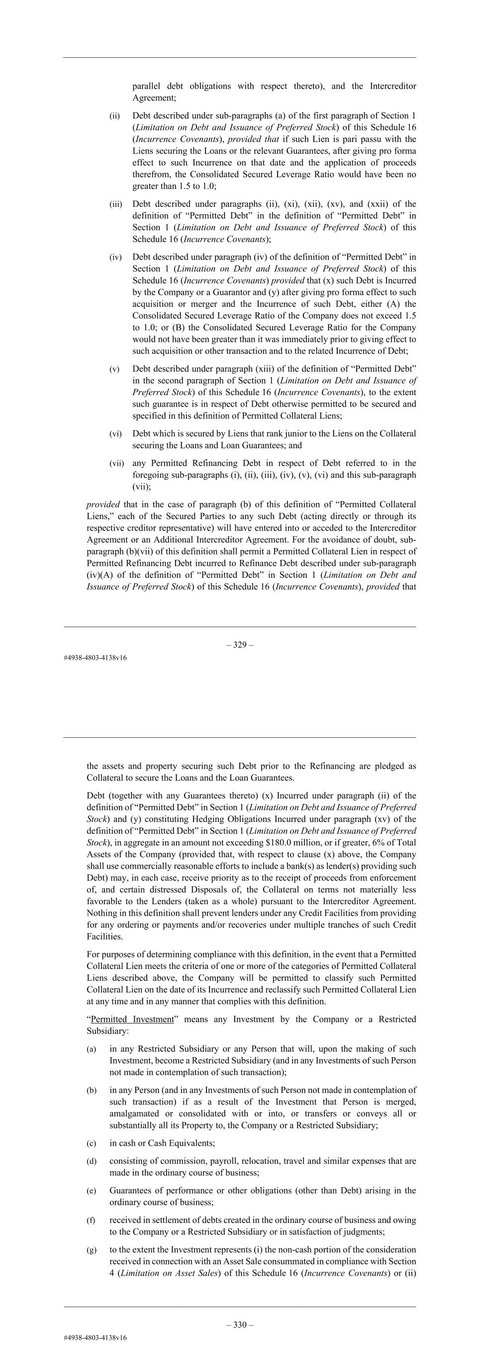 – 53 – Schedule 16 INCURRENCE COVENANTS The capitalised words and expressions in this Schedule 16 (Incurrence Covenants) shall have the meaning ascribed to them in Part C (Definitions) of this Schedule 16 (Incurrence Covenants) save that if a capitalised word or expression is not given a meaning in Part C (Definitions) of this Schedule 16 (Incurrence Covenants), it shall be given the meaning ascribed to it in Clause 1.1 (Definitions) or otherwise pursuant to the recitals to, or elsewhere in, this Agreement. If a capitalised word or expression is not given a meaning in (i) Part C (Definitions) of Schedule 16 (Incurrence Covenants) or (ii) otherwise pursuant to the recitals to, or elsewhere in, this Agreement, it shall be given the meaning ascribed to it in the Original Senior Secured Notes Indenture. The undertakings contained in this Schedule 16 (Incurrence Covenants) shall be varied in accordance with the other provisions of this Agreement. Part A Incurrence Covenants 1. Limitation on Debt and Issuance of Preferred Stock The Company shall not, and shall not permit any Restricted Subsidiary to, Incur, directly or in directly, any Debt, and the Company will not and will not permit any Restricted Subsidiary to issue any Disqualified Stock and will not permit any of its Restricted Subsidiaries that is not a Guarantor to issue any shares of Preferred Stock, unless, after giving effect to the application of the proceeds thereof, either: (a) the Debt, Disqualified Stock or Preferred Stock is Debt, Disqualified Stock or Preferred Stock of the Company or a Restricted Subsidiary and after giving effect to the Incurrence or issuance thereof and the application of the proceeds thereof on a pro forma basis, the Consolidated Fixed Charge Coverage Ratio would be at least 2.00 to 1.00, provided that the aggregate principal amount of Debt, Disqualified Stock and Preferred Stock permitted to be Incurred or issued pursuant to this paragraph (a) by Restricted Subsidiaries that are not Guarantors may not exceed an aggregate amount equal to the greater of (x) $50 million and (y) 1.75% of Total Assets (measured at the time of Incurrence), plus the aggregate amount of fees, underwriting discounts, accrued and unpaid interest, premiums (including, without limitation, tender premiums) and other costs and expenses (including, without limitation, original issue discount, upfront fees and similar fees) incurred in connection with any refinancing thereof, or (b) the Debt, Disqualified Stock or Preferred Stock is Permitted Debt. The term “Permitted Debt” is defined to consist of the following: (i) Debt evidenced by the Original Senior Secured Notes (but not any Additional Notes) issued on the Issue Date and the Note Guarantees thereof; (ii) Debt of the Company or a Restricted Subsidiary Incurred under Credit Facilities up to an aggregate outstanding principal amount not to exceed the – 54 – greater of $260 million and 9% of Total Assets (measured at the time of Incurrence); (iii) Debt of the Company owing to and held by any Restricted Subsidiary and Debt of a Restricted Subsidiary owing to and held by the Company or any Restricted Subsidiary; provided, however, that (1) any subsequent issue or transfer of Capital Stock or other event that results in the Company or any Restricted Subsidiary ceasing to be a Restricted Subsidiary or any subsequent transfer of that Debt (except to the Company or a Restricted Subsidiary, whether directly or pursuant to one or more back-to-back transfers) shall be deemed, in each case, to constitute the Incurrence of that Debt by the issuer thereof, and (2) if the Company or a Guarantor is the obligor on that Debt and the Debt is owed to a Restricted Subsidiary that is not the Company or a Guarantor, except in the case of intercompany current liabilities incurred in the ordinary course of business in connection with cash management activities of the Company and its Restricted Subsidiaries, the Debt is expressly subordinated to the prior payment in full in cash of all obligations with respect to the Facility or the applicable Loan Guarantee; (iv) (A) Debt, Disqualified Stock and Preferred Stock of a Restricted Subsidiary outstanding on the date on which that Restricted Subsidiary was acquired by the Company or otherwise became a Restricted Subsidiary or (B) Debt, Disqualified Stock or Preferred Stock Incurred or issued as consideration in, or to provide all or any portion of the funds or credit support utilized to consummate, a transaction or series of transactions pursuant to which the Person became a Restricted Subsidiary of the Company or was otherwise acquired by the Company; provided that at the time that Person was acquired by the Company or otherwise became a Restricted Subsidiary and after giving effect to the Incurrence of that Debt or the issuance of that Disqualified Stock or Preferred Stock and on a pro forma basis, (x) the Company would have been able to Incur $1.00 of additional Debt pursuant to paragraph (a) of this Section 1 (Limitation on Debt and Issuance of Preferred Stock) or (y) the Consolidated Fixed Charge Coverage Ratio is at least equal to such ratio immediately prior to such transaction or designation; (v) Debt under Interest Rate Agreements entered into by the Company or a Restricted Subsidiary for the purpose of limiting interest rate risk in the financial management of the Company or that Restricted Subsidiary and not for speculative purposes; (vi) Debt under Currency Exchange Protection Agreements entered into by the Company or a Restricted Subsidiary for the purpose of limiting currency exchange rate risks in the financial management of the Company or that Restricted Subsidiary and not for speculative purposes;