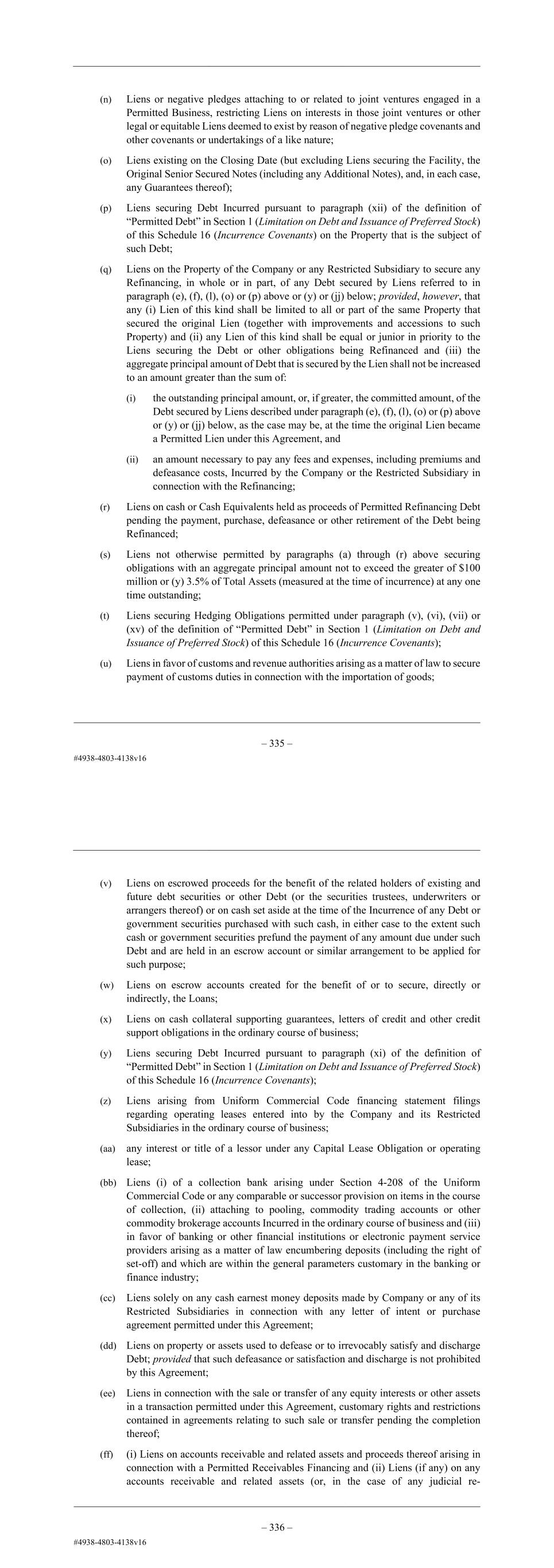 – 123 – reinsurers on pledges or deposits by the Company or any Restricted Subsidiary under workmen’s compensation laws, unemployment insurance laws or similar legislation; (i) Liens of landlords on fixtures, equipment and movable property located on leased premises and utility easements, building restrictions and such other encumbrances or charges against real Property as are of a nature generally existing with respect to properties of a similar character; (j) Liens arising out of judgments or awards against the Company or a Restricted Subsidiary with respect to which the Company or the Restricted Subsidiary shall then be proceeding with an appeal or other proceeding for review; (k) Liens in favor of issuers of performance, stay, appeal, indemnification, surety or similar bonds, completion guarantees, bank guarantees or letters of credit issued pursuant to the request of and for the account of the Company or a Restricted Subsidiary in the ordinary course of its business; (l) leases or subleases of real property granted by the Company or a Restricted Subsidiary to any other Person and not interfering in any material respect with the business of the Company and its Subsidiaries, taken as a whole; (m) Liens (including, without limitation and to the extent constituting Liens, negative pledges) on intellectual property arising from intellectual property licenses entered into in the ordinary course of business; (n) Liens or negative pledges attaching to or related to joint ventures engaged in a Permitted Business, restricting Liens on interests in those joint ventures or other legal or equitable Liens deemed to exist by reason of negative pledge covenants and other covenants or undertakings of a like nature; (o) Liens existing on the Issue Date (but excluding Liens securing the Facility, the Original Senior Secured Notes (including any Additional Notes), and, in each case, any Guarantees thereof); (p) Liens securing Debt Incurred pursuant to paragraph (xii) of the definition of “Permitted Debt” in Section 1 (Limitation on Debt and Issuance of Preferred Stock) of this Schedule 16 (Incurrence Covenants) on the Property that is the subject of such Debt; (q) Liens on the Property of the Company or any Restricted Subsidiary to secure any Refinancing, in whole or in part, of any Debt secured by Liens referred to in paragraph (e), (f), (l), (o) or (p) above or (y) or (jj) below; provided, however, that any (i) Lien of this kind shall be limited to all or part of the same Property that secured the original Lien (together with improvements and accessions to such Property) and (ii) any Lien of this kind shall be equal or junior in priority to the Liens securing the Debt or other obligations being Refinanced and (iii) the aggregate principal amount of Debt that is secured by the Lien shall not be increased to an amount greater than the sum of: – 124 – (i) the outstanding principal amount, or, if greater, the committed amount, of the Debt secured by Liens described under paragraph (e), (f), (l), (o) or (p) above or (y) or (jj) below, as the case may be, at the time the original Lien became a Permitted Lien under this Agreement, and (ii) an amount necessary to pay any fees and expenses, including premiums and defeasance costs, Incurred by the Company or the Restricted Subsidiary in connection with the Refinancing; (r) Liens on cash or Cash Equivalents held as proceeds of Permitted Refinancing Debt pending the payment, purchase, defeasance or other retirement of the Debt being Refinanced; (s) Liens not otherwise permitted by paragraphs (a) through (r) above securing obligations with an aggregate principal amount not to exceed the greater of $100 million or (y) 3.5% of Total Assets (measured at the time of incurrence) at any one time outstanding; (t) Liens securing Hedging Obligations permitted under paragraph (v), (vi), (vii) or (xv) of the definition of “Permitted Debt” in Section 1 (Limitation on Debt and Issuance of Preferred Stock) of this Schedule 16 (Incurrence Covenants); (u) Liens in favor of customs and revenue authorities arising as a matter of law to secure payment of customs duties in connection with the importation of goods; (v) Liens on escrowed proceeds for the benefit of the related holders of existing and future debt securities or other Debt (or the securities trustees, underwriters or arrangers thereof) or on cash set aside at the time of the Incurrence of any Debt or government securities purchased with such cash, in either case to the extent such cash or government securities prefund the payment of any amount due under such Debt and are held in an escrow account or similar arrangement to be applied for such purpose; (w) Liens on escrow accounts created for the benefit of or to secure, directly or indirectly, the Loans; (x) Liens on cash collateral supporting guarantees, letters of credit and other credit support obligations in the ordinary course of business; (y) Liens securing Debt Incurred pursuant to paragraph (xi) of the definition of “Permitted Debt” in Section 1 (Limitation on Debt and Issuance of Preferred Stock) of this Schedule 16 (Incurrence Covenants); (z) Liens arising from Uniform Commercial Code financing statement filings regarding operating leases entered into by the Company and its Restricted Subsidiaries in the ordinary course of business; (aa) any interest or title of a lessor under any Capital Lease Obligation or operating lease;
