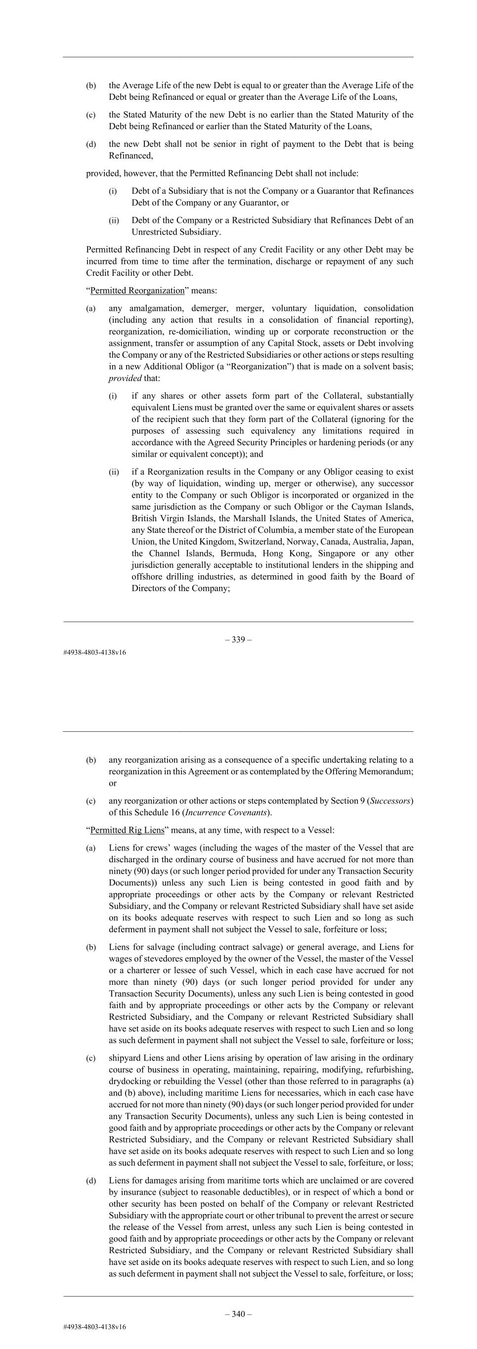 – 127 – the Company, in its sole discretion, may classify such portion of such Debt (and any Obligations in respect thereof) as having been secured pursuant to one or more Permitted Liens in this definition and thereafter the remainder of the Debt as having been secured pursuant to one or more of the other paragraphs of this definition. “Permitted Receivables Financing” means any receivables financing or factoring facility, including (i) an arrangement for the sale of receivables or (ii) an arrangement pursuant to which a Securitization Subsidiary purchases, otherwise acquires or receives Lien on accounts receivable of the Company or any Restricted Subsidiaries and enters into a third- party financing thereof on customary terms that are fair and reasonable to the Company and its Restricted Subsidiaries. “Permitted Refinancing Debt” means any Debt that Refinances any other Debt, including any successive Refinancings, so long as: (a) the new Debt is in an aggregate principal amount (or if Incurred with original issue discount, an aggregate issue price) not in excess of the sum of: (i) the aggregate principal amount (or if Incurred with original issue discount, the aggregate accreted value) then outstanding of the Debt being Refinanced, plus (ii) an amount necessary to pay any fees and expenses, including premiums and defeasance costs, related to the Refinancing, (b) the Average Life of the new Debt is equal to or greater than the Average Life of the Debt being Refinanced or equal or greater than the Average Life of the Loans, (c) the Stated Maturity of the new Debt is no earlier than the Stated Maturity of the Debt being Refinanced or earlier than the Stated Maturity of the Loans, (d) the new Debt shall not be senior in right of payment to the Debt that is being Refinanced, provided, however, that the Permitted Refinancing Debt shall not include: (i) Debt of a Subsidiary that is not the Company or a Guarantor that Refinances Debt of the Company or any Guarantor, or (ii) Debt of the Company or a Restricted Subsidiary that Refinances Debt of an Unrestricted Subsidiary. Permitted Refinancing Debt in respect of any Credit Facility or any other Debt may be incurred from time to time after the termination, discharge or repayment of any such Credit Facility or other Debt. “Permitted Reorganization” means: (a) any amalgamation, demerger, merger, voluntary liquidation, consolidation (including any action that results in a consolidation of financial reporting), reorganization, re-domiciliation, winding up or corporate reconstruction or the assignment, transfer or assumption of any Capital Stock, assets or Debt involving – 128 – the Company or any of the Restricted Subsidiaries or other actions or steps resulting in a new Additional Obligor (a “Reorganization”) that is made on a solvent basis; provided that: (i) if any shares or other assets form part of the Collateral, substantially equivalent Liens must be granted over the same or equivalent shares or assets of the recipient such that they form part of the Collateral (ignoring for the purposes of assessing such equivalency any limitations required in accordance with the Agreed Security Principles or hardening periods (or any similar or equivalent concept)); and (ii) if a Reorganization results in the Company or any Obligor ceasing to exist (by way of liquidation, winding up, merger or otherwise), any successor entity to the Company or such Obligor is incorporated or organized in the same jurisdiction as the Company or such Obligor or the Cayman Islands, British Virgin Islands, the Marshall Islands, the United States of America, any State thereof or the District of Columbia, a member state of the European Union, the United Kingdom, Switzerland, Norway, Canada, Australia, Japan, the Channel Islands, Bermuda, Hong Kong, Singapore or any other jurisdiction generally acceptable to institutional lenders in the shipping and offshore drilling industries, as determined in good faith by the Board of Directors of the Company; (b) any reorganization arising as a consequence of a specific undertaking relating to a reorganization in this Agreement or as contemplated by the Offering Memorandum; or (c) any reorganization or other actions or steps contemplated by Section 9 (Successors) of this Schedule 16 (Incurrence Covenants). “Permitted Rig Liens” means, at any time, with respect to a Vessel: (a) Liens for crews’ wages (including the wages of the master of the Vessel that are discharged in the ordinary course of business and have accrued for not more than ninety (90) days (or such longer period provided for under any Transaction Security Documents)) unless any such Lien is being contested in good faith and by appropriate proceedings or other acts by the Company or relevant Restricted Subsidiary, and the Company or relevant Restricted Subsidiary shall have set aside on its books adequate reserves with respect to such Lien and so long as such deferment in payment shall not subject the Vessel to sale, forfeiture or loss; (b) Liens for salvage (including contract salvage) or general average, and Liens for wages of stevedores employed by the owner of the Vessel, the master of the Vessel or a charterer or lessee of such Vessel, which in each case have accrued for not more than ninety (90) days (or such longer period provided for under any Transaction Security Documents), unless any such Lien is being contested in good faith and by appropriate proceedings or other acts by the Company or relevant Restricted Subsidiary, and the Company or relevant Restricted Subsidiary shall