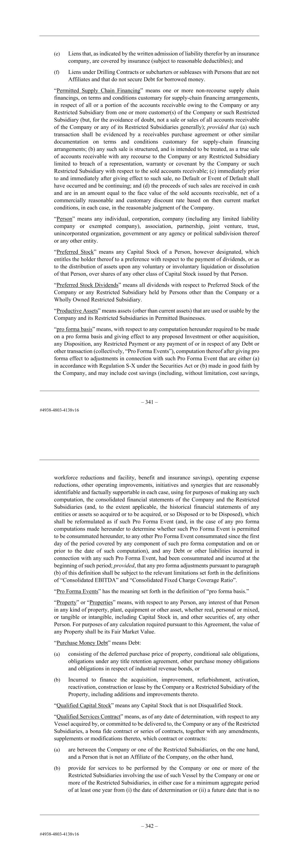 – 129 – have set aside on its books adequate reserves with respect to such Lien and so long as such deferment in payment shall not subject the Vessel to sale, forfeiture or loss; (c) shipyard Liens and other Liens arising by operation of law arising in the ordinary course of business in operating, maintaining, repairing, modifying, refurbishing, drydocking or rebuilding the Vessel (other than those referred to in paragraphs (a) and (b) above), including maritime Liens for necessaries, which in each case have accrued for not more than ninety (90) days (or such longer period provided for under any Transaction Security Documents), unless any such Lien is being contested in good faith and by appropriate proceedings or other acts by the Company or relevant Restricted Subsidiary, and the Company or relevant Restricted Subsidiary shall have set aside on its books adequate reserves with respect to such Lien and so long as such deferment in payment shall not subject the Vessel to sale, forfeiture, or loss; (d) Liens for damages arising from maritime torts which are unclaimed or are covered by insurance (subject to reasonable deductibles), or in respect of which a bond or other security has been posted on behalf of the Company or relevant Restricted Subsidiary with the appropriate court or other tribunal to prevent the arrest or secure the release of the Vessel from arrest, unless any such Lien is being contested in good faith and by appropriate proceedings or other acts by the Company or relevant Restricted Subsidiary, and the Company or relevant Restricted Subsidiary shall have set aside on its books adequate reserves with respect to such Lien, and so long as such deferment in payment shall not subject the Vessel to sale, forfeiture, or loss; (e) Liens that, as indicated by the written admission of liability therefor by an insurance company, are covered by insurance (subject to reasonable deductibles); and (f) Liens under Drilling Contracts or subcharters or subleases with Persons that are not Affiliates and that do not secure Debt for borrowed money. “Permitted Supply Chain Financing” means one or more non-recourse supply chain financings, on terms and conditions customary for supply-chain financing arrangements, in respect of all or a portion of the accounts receivable owing to the Company or any Restricted Subsidiary from one or more customer(s) of the Company or such Restricted Subsidiary (but, for the avoidance of doubt, not a sale or sales of all accounts receivable of the Company or any of its Restricted Subsidiaries generally); provided that (a) such transaction shall be evidenced by a receivables purchase agreement or other similar documentation on terms and conditions customary for supply-chain financing arrangements; (b) any such sale is structured, and is intended to be treated, as a true sale of accounts receivable with any recourse to the Company or any Restricted Subsidiary limited to breach of a representation, warranty or covenant by the Company or such Restricted Subsidiary with respect to the sold accounts receivable; (c) immediately prior to and immediately after giving effect to such sale, no Default or Event of Default shall have occurred and be continuing; and (d) the proceeds of such sales are received in cash and are in an amount equal to the face value of the sold accounts receivable, net of a commercially reasonable and customary discount rate based on then current market conditions, in each case, in the reasonable judgment of the Company. – 130 – “Person” means any individual, corporation, company (including any limited liability company or exempted company), association, partnership, joint venture, trust, unincorporated organization, government or any agency or political subdivision thereof or any other entity. “Preferred Stock” means any Capital Stock of a Person, however designated, which entitles the holder thereof to a preference with respect to the payment of dividends, or as to the distribution of assets upon any voluntary or involuntary liquidation or dissolution of that Person, over shares of any other class of Capital Stock issued by that Person. “Preferred Stock Dividends” means all dividends with respect to Preferred Stock of the Company or any Restricted Subsidiary held by Persons other than the Company or a Wholly Owned Restricted Subsidiary. “Productive Assets” means assets (other than current assets) that are used or usable by the Company and its Restricted Subsidiaries in Permitted Businesses. “pro forma basis” means, with respect to any computation hereunder required to be made on a pro forma basis and giving effect to any proposed Investment or other acquisition, any Disposition, any Restricted Payment or any payment of or in respect of any Debt or other transaction (collectively, “Pro Forma Events”), computation thereof after giving pro forma effect to adjustments in connection with such Pro Forma Event that are either (a) in accordance with Regulation S-X under the Securities Act or (b) made in good faith by the Company, and may include cost savings (including, without limitation, cost savings, workforce reductions and facility, benefit and insurance savings), operating expense reductions, other operating improvements, initiatives and synergies that are reasonably identifiable and factually supportable in each case, using for purposes of making any such computation, the consolidated financial statements of the Company and the Restricted Subsidiaries (and, to the extent applicable, the historical financial statements of any entities or assets so acquired or to be acquired, or so Disposed or to be Disposed), which shall be reformulated as if such Pro Forma Event (and, in the case of any pro forma computations made hereunder to determine whether such Pro Forma Event is permitted to be consummated hereunder, to any other Pro Forma Event consummated since the first day of the period covered by any component of such p