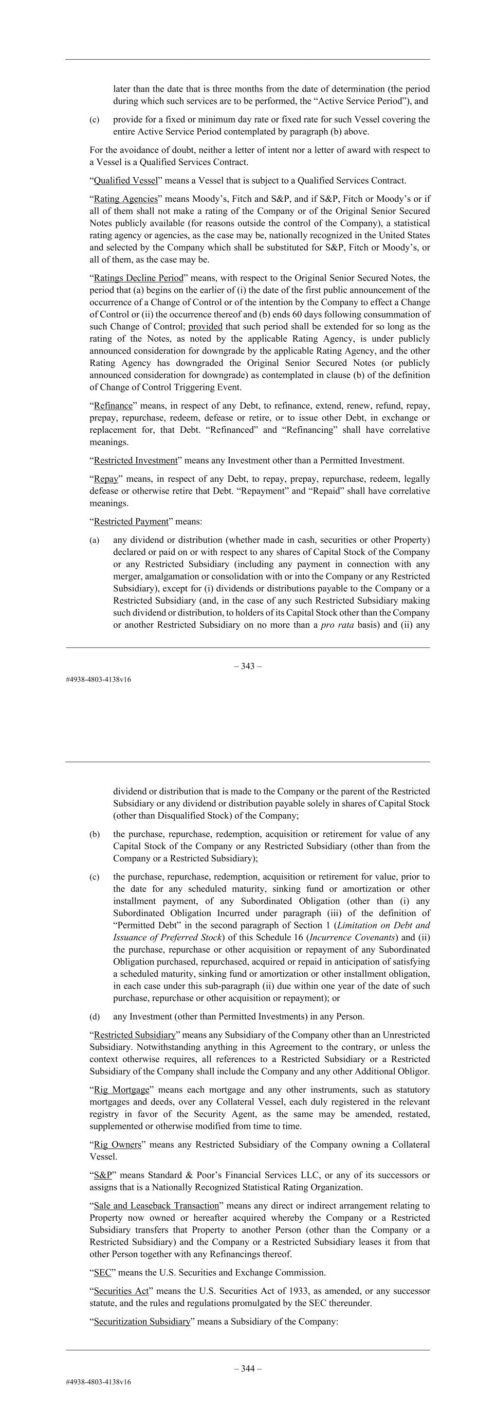 – 131 – “Purchase Money Debt” means Debt: (a) consisting of the deferred purchase price of property, conditional sale obligations, obligations under any title retention agreement, other purchase money obligations and obligations in respect of industrial revenue bonds, or (b) Incurred to finance the acquisition, improvement, refurbishment, activation, reactivation, construction or lease by the Company or a Restricted Subsidiary of the Property, including additions and improvements thereto. “Qualified Capital Stock” means any Capital Stock that is not Disqualified Stock. “Qualified Services Contract” means, as of any date of determination, with respect to any Vessel acquired by, or committed to be delivered to, the Company or any of the Restricted Subsidiaries, a bona fide contract or series of contracts, together with any amendments, supplements or modifications thereto, which contract or contracts: (a) are between the Company or one of the Restricted Subsidiaries, on the one hand, and a Person that is not an Affiliate of the Company, on the other hand, (b) provide for services to be performed by the Company or one or more of the Restricted Subsidiaries involving the use of such Vessel by the Company or one or more of the Restricted Subsidiaries, in either case for a minimum aggregate period of at least one year from (i) the date of determination or (ii) a future date that is no later than the date that is three months from the date of determination (the period during which such services are to be performed, the “Active Service Period”), and (c) provide for a fixed or minimum day rate or fixed rate for such Vessel covering the entire Active Service Period contemplated by paragraph (b) above. For the avoidance of doubt, neither a letter of intent nor a letter of award with respect to a Vessel is a Qualified Services Contract. “Qualified Vessel” means a Vessel that is subject to a Qualified Services Contract. “Rating Agencies” means Moody’s, Fitch and S&P, and if S&P, Fitch or Moody’s or if all of them shall not make a rating of the Company or of the Original Senior Secured Notes publicly available (for reasons outside the control of the Company), a statistical rating agency or agencies, as the case may be, nationally recognized in the United States and selected by the Company which shall be substituted for S&P, Fitch or Moody’s, or all of them, as the case may be. “Ratings Decline Period” means, with respect to the Original Senior Secured Notes, the period that (a) begins on the earlier of (i) the date of the first public announcement of the occurrence of a Change of Control or of the intention by the Company to effect a Change of Control or (ii) the occurrence thereof and (b) ends 60 days following consummation of such Change of Control; provided that such period shall be extended for so long as the rating of the Notes, as noted by the applicable Rating Agency, is under publicly announced consideration for downgrade by the applicable Rating Agency, and the other Rating Agency has downgraded the Original Senior Secured Notes (or publicly – 132 – announced consideration for downgrade) as contemplated in clause (b) of the definition of Change of Control Triggering Event. “Refinance” means, in respect of any Debt, to refinance, extend, renew, refund, repay, prepay, repurchase, redeem, defease or retire, or to issue other Debt, in exchange or replacement for, that Debt. “Refinanced” and “Refinancing” shall have correlative meanings. “Restricted Investment” means any Investment other than a Permitted Investment. “Repay” means, in respect of any Debt, to repay, prepay, repurchase, redeem, legally defease or otherwise retire that Debt. “Repayment” and “Repaid” shall have correlative meanings. “Restricted Payment” means: (a) any dividend or distribution (whether made in cash, securities or other Property) declared or paid on or with respect to any shares of Capital Stock of the Company or any Restricted Subsidiary (including any payment in connection with any merger, amalgamation or consolidation with or into the Company or any Restricted Subsidiary), except for (i) dividends or distributions payable to the Company or a Restricted Subsidiary (and, in the case of any such Restricted Subsidiary making such dividend or distribution, to holders of its Capital Stock other than the Company or another Restricted Subsidiary on no more than a pro rata basis) and (ii) any dividend or distribution that is made to the Company or the parent of the Restricted Subsidiary or any dividend or distribution payable solely in shares of Capital Stock (other than Disqualified Stock) of the Company; (b) the purchase, repurchase, redemption, acquisition or retirement for value of any Capital Stock of the Company or any Restricted Subsidiary (other than from the Company or a Restricted Subsidiary); (c) the purchase, repurchase, redemption, acquisition or retirement for value, prior to the date for any scheduled maturity, sinking fund or amortization or other installment payment, of any Subordinated Obligation (other than (i) any Subordinated Obligation Incurred under paragraph (iii) of the definition of “Permitted Debt” in the second paragraph of Section 1 (Limitation on Debt and Issuance of Preferred Stock) of this Schedule 16 (Incurrence Covenants) and (ii) the purchase, repurchase or other acquisition or repayment of any Subordinated Obligation purchased, repurchased, acquired or repaid in anticipation of satisfying a scheduled maturity, sinking fund or amortization or other installment obligation, in each case under this sub-paragraph (ii) due within one year of the date of such purchase, repurchase or other acquisition or repayment); or (d) any Investment (other than Permitted Investments) in any Person. “Restricted Subsidiary” means any Subsidiary of the Company other than an Unrestricted Subsidiary. Notwithstanding anything in this Agr