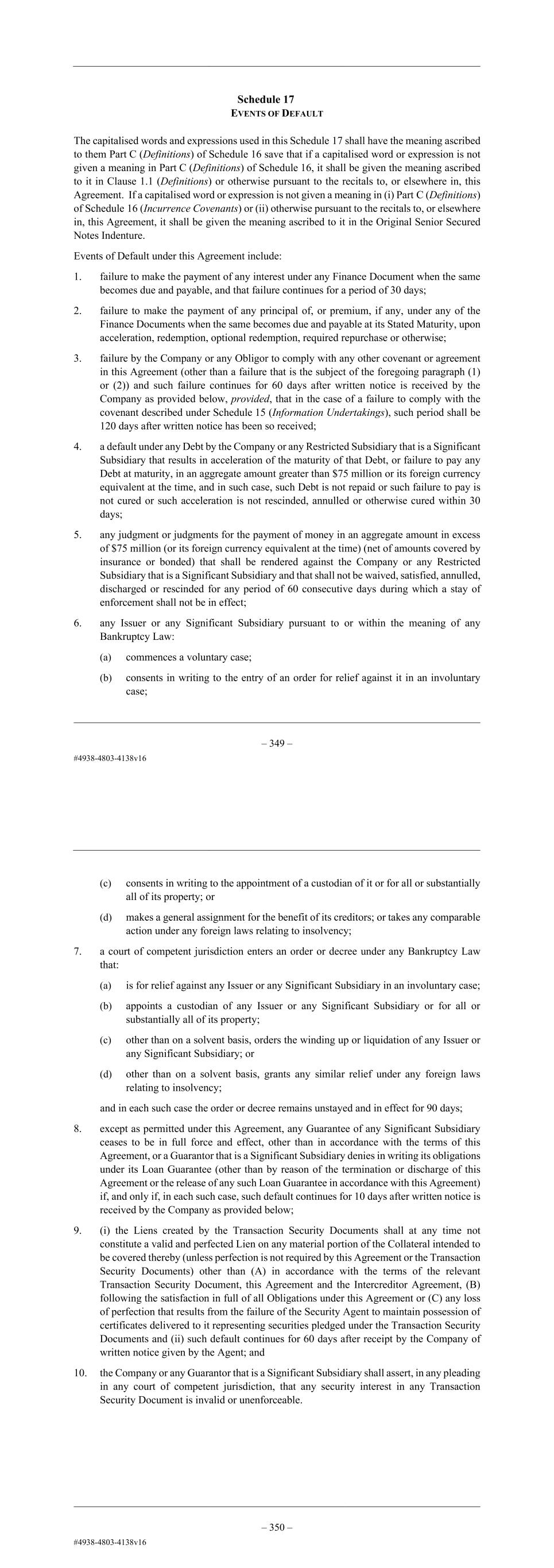 – 137 – Schedule 17 EVENTS OF DEFAULT The capitalised words and expressions used in this Schedule 17 shall have the meaning ascribed to them Part C (Definitions) of Schedule 16 save that if a capitalised word or expression is not given a meaning in Part C (Definitions) of Schedule 16, it shall be given the meaning ascribed to it in Clause 1.1 (Definitions) or otherwise pursuant to the recitals to, or elsewhere in, this Agreement. If a capitalised word or expression is not given a meaning in (i) Part C (Definitions) of Schedule 16 (Incurrence Covenants) or (ii) otherwise pursuant to the recitals to, or elsewhere in, this Agreement, it shall be given the meaning ascribed to it in the Original Senior Secured Notes Indenture. Events of Default under this Agreement include: 1. failure to make the payment of any interest under any Finance Document when the same becomes due and payable, and that failure continues for a period of 30 days; 2. failure to make the payment of any principal of, or premium, if any, under any of the Finance Documents when the same becomes due and payable at its Stated Maturity, upon acceleration, redemption, optional redemption, required repurchase or otherwise; 3. failure by the Company or any Obligor to comply with any other covenant or agreement in this Agreement (other than a failure that is the subject of the foregoing paragraph (1) or (2)) and such failure continues for 60 days after written notice is received by the Company as provided below, provided, that in the case of a failure to comply with the covenant described under Schedule 15 (Information Undertakings), such period shall be 120 days after written notice has been so received; 4. a default under any Debt by the Company or any Restricted Subsidiary that is a Significant Subsidiary that results in acceleration of the maturity of that Debt, or failure to pay any Debt at maturity, in an aggregate amount greater than $75 million or its foreign currency equivalent at the time, and in such case, such Debt is not repaid or such failure to pay is not cured or such acceleration is not rescinded, annulled or otherwise cured within 30 days; 5. any judgment or judgments for the payment of money in an aggregate amount in excess of $75 million (or its foreign currency equivalent at the time) (net of amounts covered by insurance or bonded) that shall be rendered against the Company or any Restricted Subsidiary that is a Significant Subsidiary and that shall not be waived, satisfied, annulled, discharged or rescinded for any period of 60 consecutive days during which a stay of enforcement shall not be in effect; 6. any Issuer or any Significant Subsidiary pursuant to or within the meaning of any Bankruptcy Law: (a) commences a voluntary case; (b) consents in writing to the entry of an order for relief against it in an involuntary case; – 138 – (c) consents in writing to the appointment of a custodian of it or for all or substantially all of its property; or (d) makes a general assignment for the benefit of its creditors; or takes any comparable action under any foreign laws relating to insolvency; 7. a court of competent jurisdiction enters an order or decree under any Bankruptcy Law that: (a) is for relief against any Issuer or any Significant Subsidiary in an involuntary case; (b) appoints a custodian of any Issuer or any Significant Subsidiary or for all or substantially all of its property; (c) other than on a solvent basis, orders the winding up or liquidation of any Issuer or any Significant Subsidiary; or (d) other than on a solvent basis, grants any similar relief under any foreign laws relating to insolvency; and in each such case the order or decree remains unstayed and in effect for 90 days; 8. except as permitted under this Agreement, any Guarantee of any Significant Subsidiary ceases to be in full force and effect, other than in accordance with the terms of this Agreement, or a Guarantor that is a Significant Subsidiary denies in writing its obligations under its Loan Guarantee (other than by reason of the termination or discharge of this Agreement or the release of any such Loan Guarantee in accordance with this Agreement) if, and only if, in each such case, such default continues for 10 days after written notice is received by the Company as provided below; 9. (i) the Liens created by the Transaction Security Documents shall at any time not constitute a valid and perfected Lien on any material portion of the Collateral intended to be covered thereby (unless perfection is not required by this Agreement or the Transaction Security Documents) other than (A) in accordance with the terms of the relevant Transaction Security Document, this Agreement and the Intercreditor Agreement, (B) following the satisfaction in full of all Obligations under this Agreement or (C) any loss of perfection that results from the failure of the Security Agent to maintain possession of certificates delivered to it representing securities pledged under the Transaction Security Documents and (ii) such default continues for 60 days after receipt by the Company of written notice given by the Agent; and 10. the Company or any Guarantor that is a Significant Subsidiary shall assert, in any pleading in any court of competent jurisdiction, that any security interest in any Transaction Security Document is invalid or unenforceable.