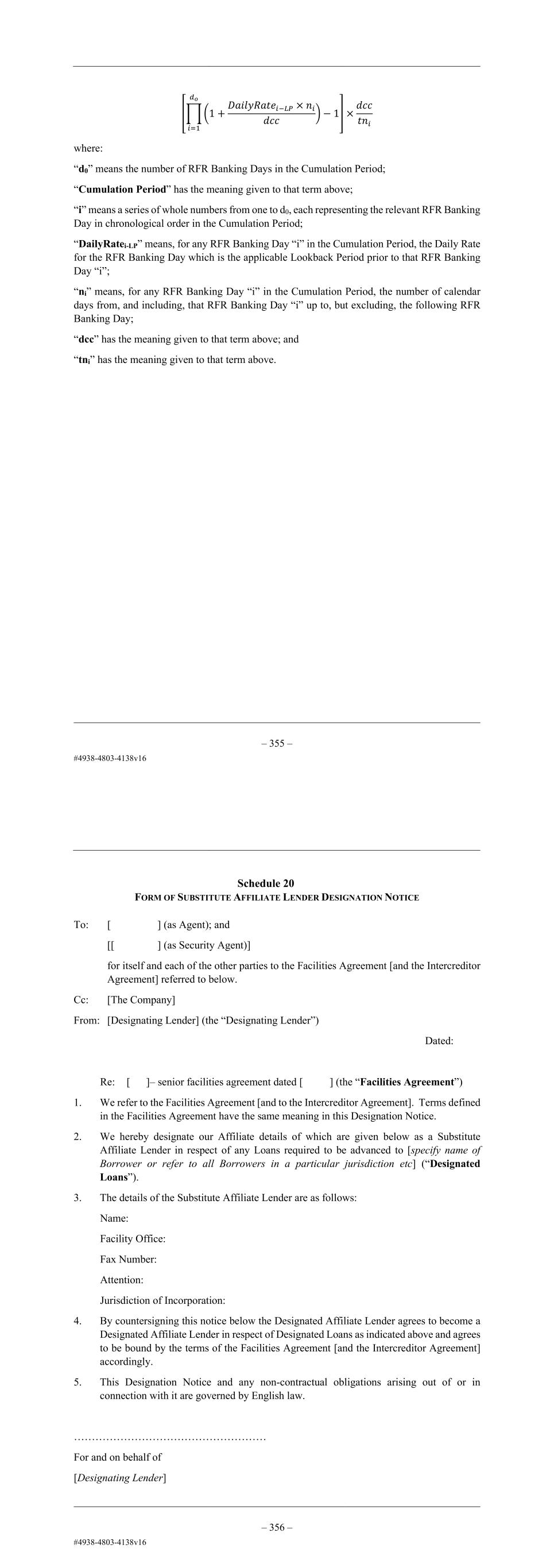 – 143 – [∏(1 + 𝐷𝑎𝑖𝑙𝑦𝑅𝑎𝑡𝑒𝑖−𝐿𝑃 × 𝑛𝑖 𝑑𝑐𝑐 ) − 1 𝑑𝑜 𝑖=1 ] × 𝑑𝑐𝑐 𝑡𝑛𝑖 where: “d0” means the number of RFR Banking Days in the Cumulation Period; “Cumulation Period” has the meaning given to that term above; “i” means a series of whole numbers from one to d0, each representing the relevant RFR Banking Day in chronological order in the Cumulation Period; “DailyRatei-LP” means, for any RFR Banking Day “i” in the Cumulation Period, the Daily Rate for the RFR Banking Day which is the applicable Lookback Period prior to that RFR Banking Day “i”; “ni” means, for any RFR Banking Day “i” in the Cumulation Period, the number of calendar days from, and including, that RFR Banking Day “i” up to, but excluding, the following RFR Banking Day; “dcc” has the meaning given to that term above; and “tni” has the meaning given to that term above. – 144 – Schedule 20 FORM OF SUBSTITUTE AFFILIATE LENDER DESIGNATION NOTICE To: [ ] (as Agent); and [[ ] (as Security Agent)] for itself and each of the other parties to the Facilities Agreement [and the Intercreditor Agreement] referred to below. Cc: [The Company] From: [Designating Lender] (the “Designating Lender”) Dated: Dear Sirs Re: [ ]– senior facilities agreement dated [ ] (the “Facilities Agreement”) 1. We refer to the Facilities Agreement [and to the Intercreditor Agreement]. Terms defined in the Facilities Agreement have the same meaning in this Designation Notice. 2. We hereby designate our Affiliate details of which are given below as a Substitute Affiliate Lender in respect of any Loans required to be advanced to [specify name of Borrower or refer to all Borrowers in a particular jurisdiction etc] (“Designated Loans”). 3. The details of the Substitute Affiliate Lender are as follows: Name: Facility Office: Fax Number: Attention: Jurisdiction of Incorporation: 4. By countersigning this notice below the Designated Affiliate Lender agrees to become a Designated Affiliate Lender in respect of Designated Loans as indicated above and agrees to be bound by the terms of the Facilities Agreement [and the Intercreditor Agreement] accordingly. 5. This Designation Notice and any non-contractual obligations arising out of or in connection with it are governed by English law. ……………………………………………… For and on behalf of [Designating Lender]
