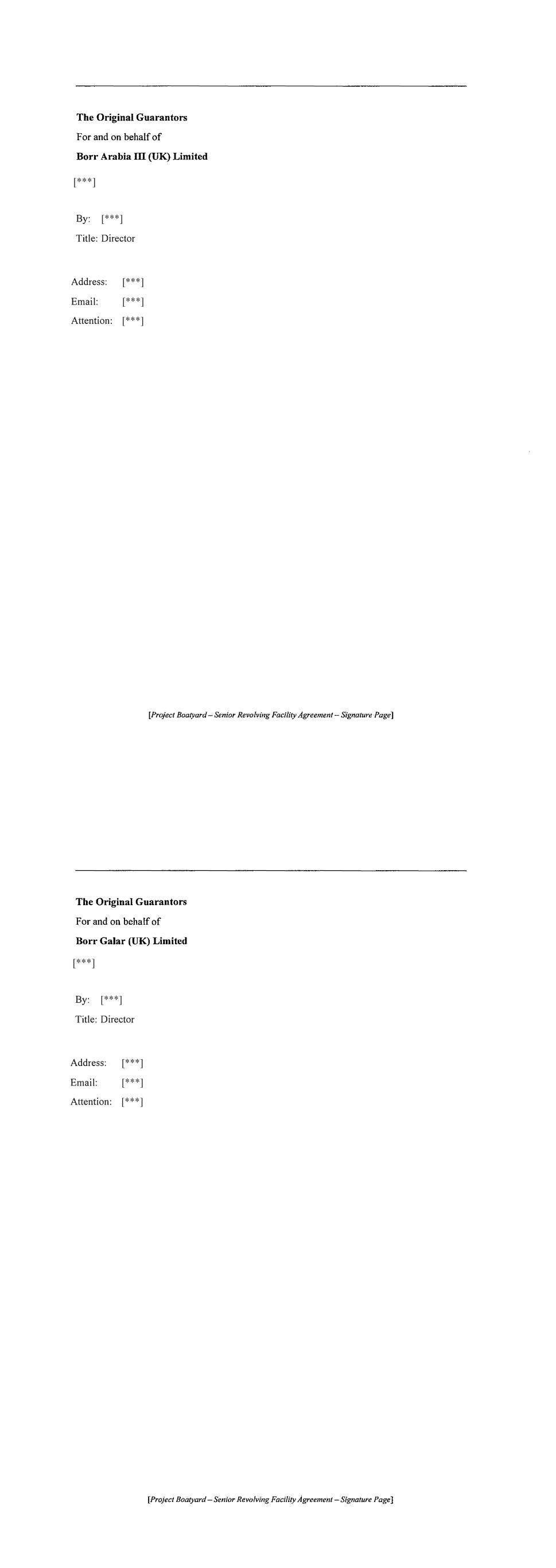 For and on behalf of BORR RAN (UK) LIMITED as Existing Obligor, acting by a director in the presence of: Director Witness's Signature Name: Address: [Project Boatyard-Signature Page to RCF Amendment Agreement] [***] [***] [***] [***] [***] For and on behalf of BORR ARABIA III (UK) LIMITED as Existing Obligor, acting by a director in the presence of: Director W• , s· 1tness s 1gnature Name: Address: [Project Boatyard - Signature Page to RCF Amendment Agreement] [***] [***] [***] [***] [***] [***]