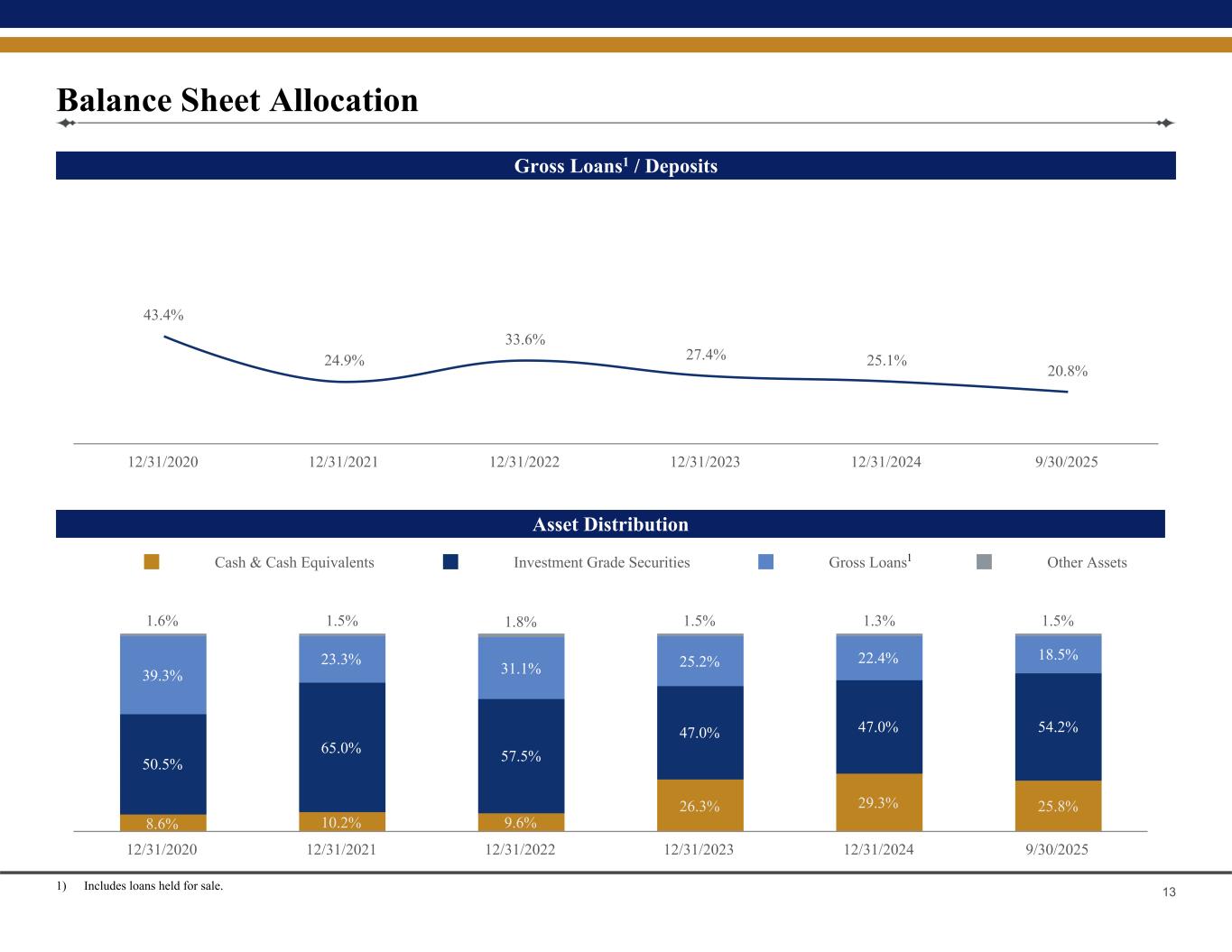 13 68 72 74 15 49 109 42 80 130 232 159 44 148 109 51 233 234 235 100 100 100 Binding Zone Printer Margins 1) Includes loans held for sale. Asset Distribution Gross Loans1 / Deposits Balance Sheet Allocation 43.4% 24.9% 33.6% 27.4% 25.1% 20.8% 12/31/2020 12/31/2021 12/31/2022 12/31/2023 12/31/2024 9/30/2025 8.6% 10.2% 9.6% 26.3% 29.3% 25.8% 50.5% 65.0% 57.5% 47.0% 47.0% 54.2% 39.3% 23.3% 31.1% 25.2% 22.4% 18.5% 1.6% 1.5% 1.8% 1.5% 1.3% 1.5% Cash & Cash Equivalents Investment Grade Securities Gross Loans Other Assets 12/31/2020 12/31/2021 12/31/2022 12/31/2023 12/31/2024 9/30/2025 1