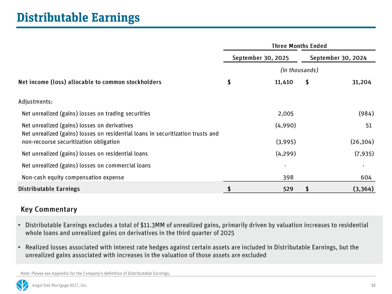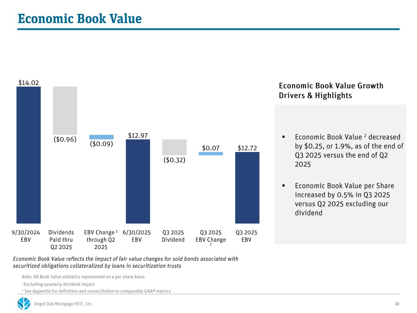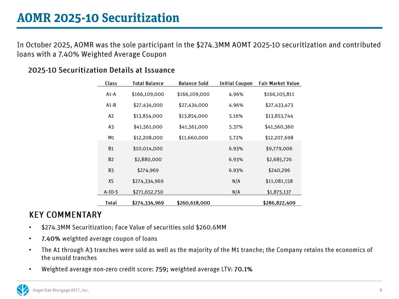Sreeni Prabhu, Chief Executive Officer and President of Angel Oak Mortgage REIT, Inc., said "The third quarter of 2025 presented a constructive environment for AOMR's business in which we demonstrated our ability to capitalize on opportunities to drive accretive growth in our portfolio. Of note, we called and retired two legacy securitizations and re-allocated that capital toward higher-yielding investments. Additionally, following the end of the quarter, we established a new credit facility at attractive rates, diversifying our creditor base and driving reduced interest expense." He continued, "Our financial results were strong; we resumed quarterly sequential net income growth following May's senior unsecured debt issuance, maintained operating expense levels, and observed increases in valuations across the portfolio compared to the second quarter of 2025. Additionally, following the end of the quarter, we executed the AOMT 2025-10 securitization with favorable terms. We remain committed to leveraging our competitive advantages and building upon our proven track record to drive continued income and earnings growth for our stakeholders."