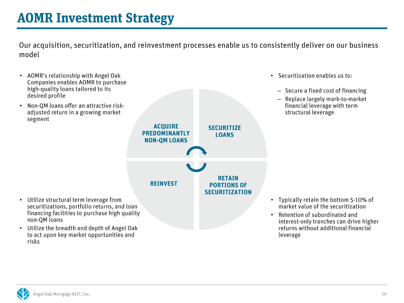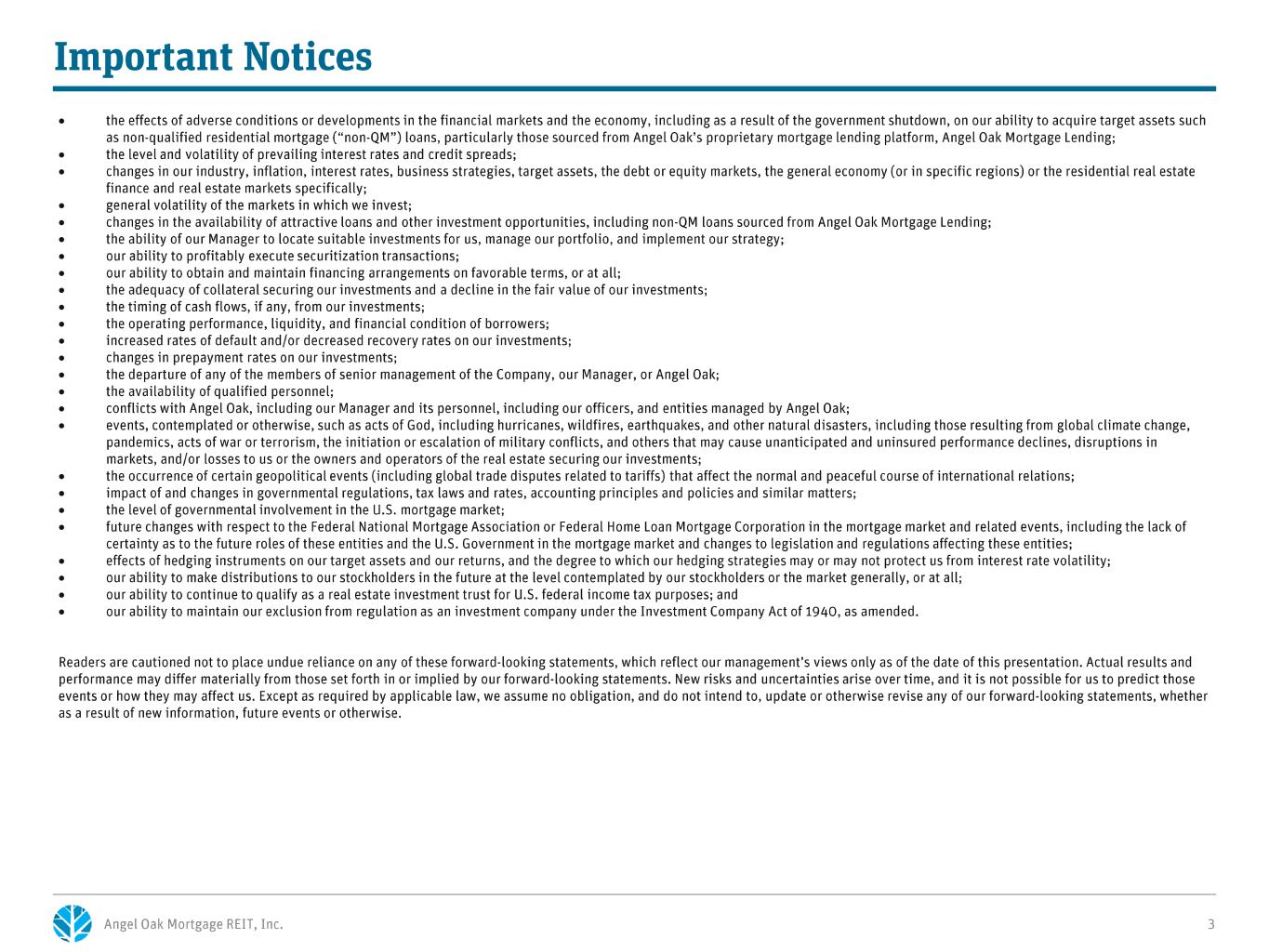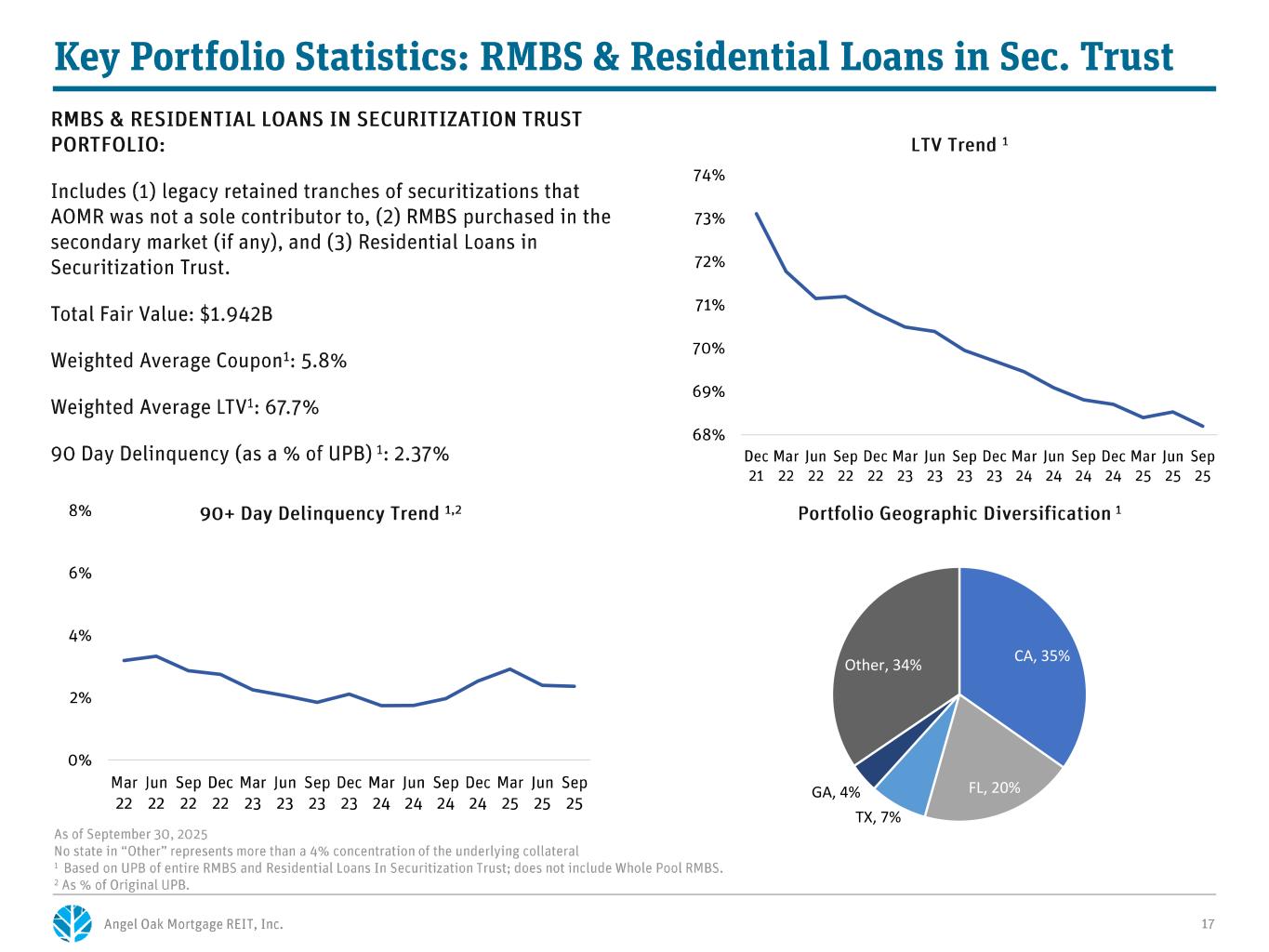 Sreeni Prabhu, Chief Executive Officer and President of Angel Oak Mortgage REIT, Inc., said "The third quarter of 2025 presented a constructive environment for AOMR's business in which we demonstrated our ability to capitalize on opportunities to drive accretive growth in our portfolio. Of note, we called and retired two legacy securitizations and re-allocated that capital toward higher-yielding investments. Additionally, following the end of the quarter, we established a new credit facility at attractive rates, diversifying our creditor base and driving reduced interest expense." He continued, "Our financial results were strong; we resumed quarterly sequential net income growth following May's senior unsecured debt issuance, maintained operating expense levels, and observed increases in valuations across the portfolio compared to the second quarter of 2025. Additionally, following the end of the quarter, we executed the AOMT 2025-10 securitization with favorable terms. We remain committed to leveraging our competitive advantages and building upon our proven track record to drive continued income and earnings growth for our stakeholders."