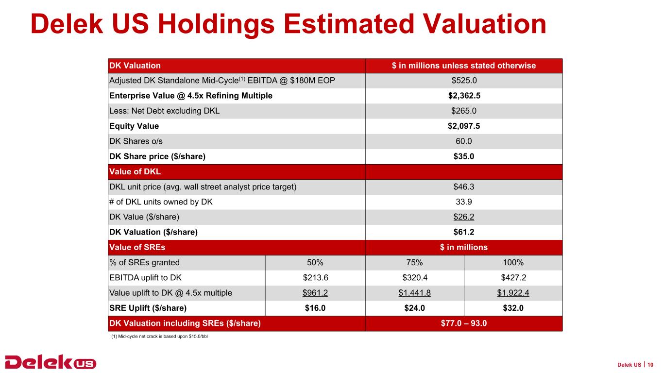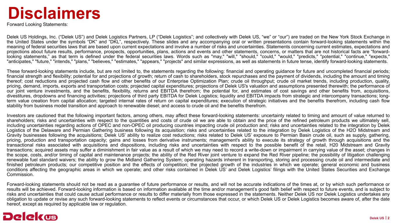 or renewables; uncertainty related to timing and amount of future share repurchases and dividend payments; risks and uncertainties with respect to the quantities and costs of crude oil we are able to obtain and the price of the refined petroleum products we ultimately sell, uncertainties regarding actions by OPEC and non-OPEC oil producing countries impacting crude oil production and pricing;デレック・ロジスティクス社によるデラウェア・ギャザリング事業、パーミアン・ギャザリング事業、H2Oミッドストリーム事業、グラビティ事業の買収後の統合に関連するリスクと不確実性、デレックUS社によるコスト削減の実現能力、パーミアン・ベースン原油の供給、価格、集荷、生産、輸送能力などのエクスポージャーに関連するリスク、デリバティブ商品による利益と損失、買収と売却に関連するリスク、小売事業、H2Oミッドストリーム事業、グラビティ事業の買収によりもたらされる可能性のある利益に関するリスクと不確実性;買収した資産の公正価値が低下し、帳簿価額の評価減または減損を計上する必要が生じる可能性、再生可能燃料基準免除を争う訴訟の可能性、資本およびメンテナンス・プロジェクトの範囲、費用、および/または時期の変更、ミッドランド・ギャザリング・システムを成長させる能力、レッド・リバー・ジョイント・ベンチャーがレッド・リバー・パイプラインの容量を増加させる拡張プロジェクトを完了させる能力;原油および中間・最終石油製品の輸送、貯蔵、処理に内在する操業上の危険、当社の競争上の地位および競争による影響、当社が事業を行っている業界の成長予測、当社が事業を行っている地域に影響を及ぼす一般的な経済および経営状況、ならびにフォーム10-K年次報告書、フォーム10-Q四半期報告書、およびその他のSECへの提出書類および報告書に開示されているリスクを含む、Delek USが米国証券取引委員会(以下「SEC」)に提出した書類に記載されているその他のリスク。