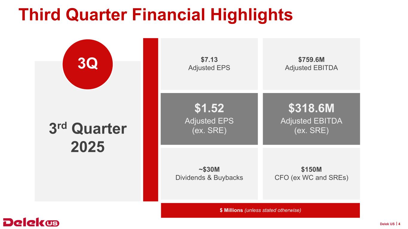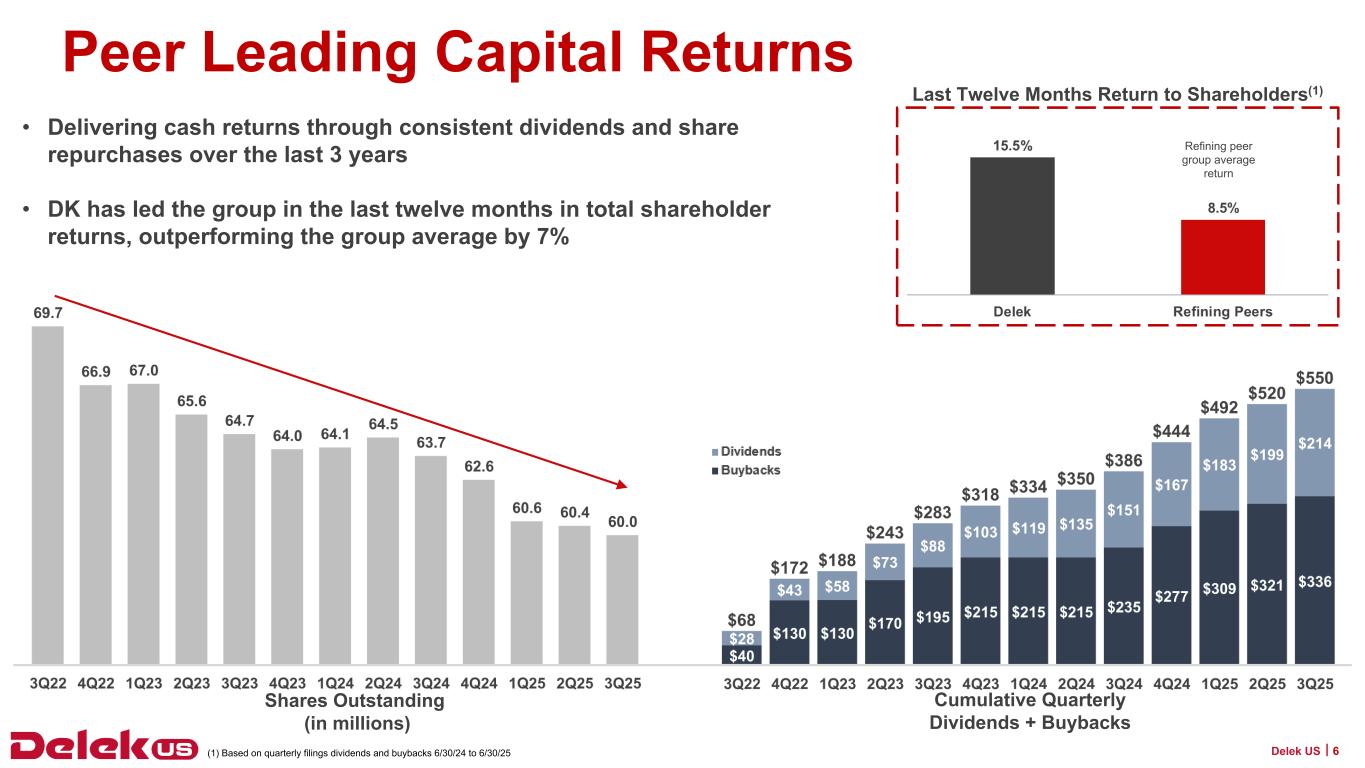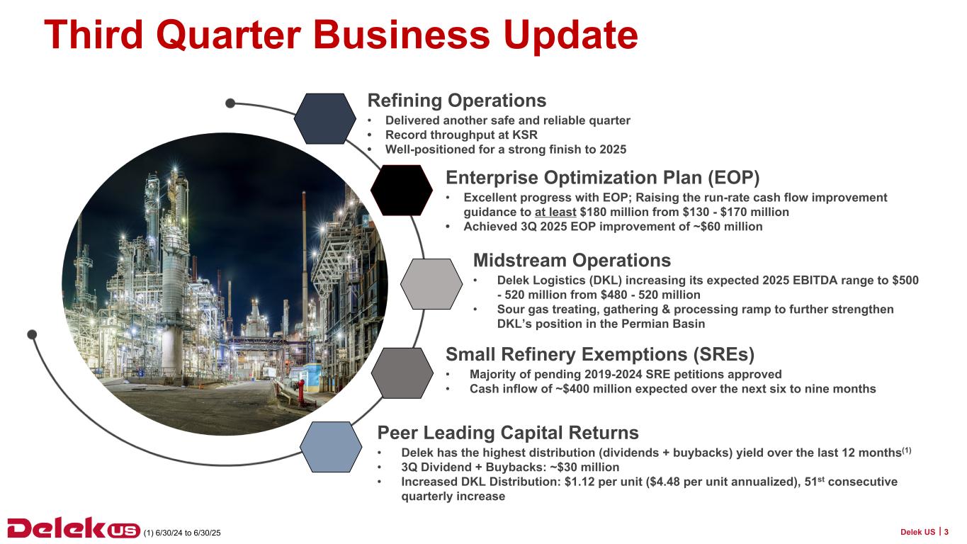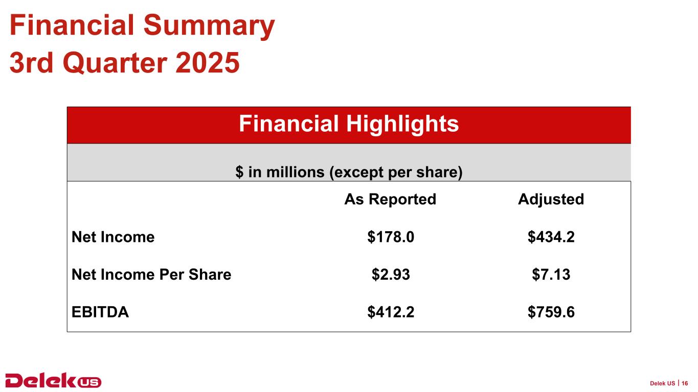 テネシー州セントウッド--2025年11月7日--Delek US Holdings, Inc. (NYSE: DK)(以下、Delek US)は本日、2025年9月30日を期末とする第3四半期の業績を発表した。