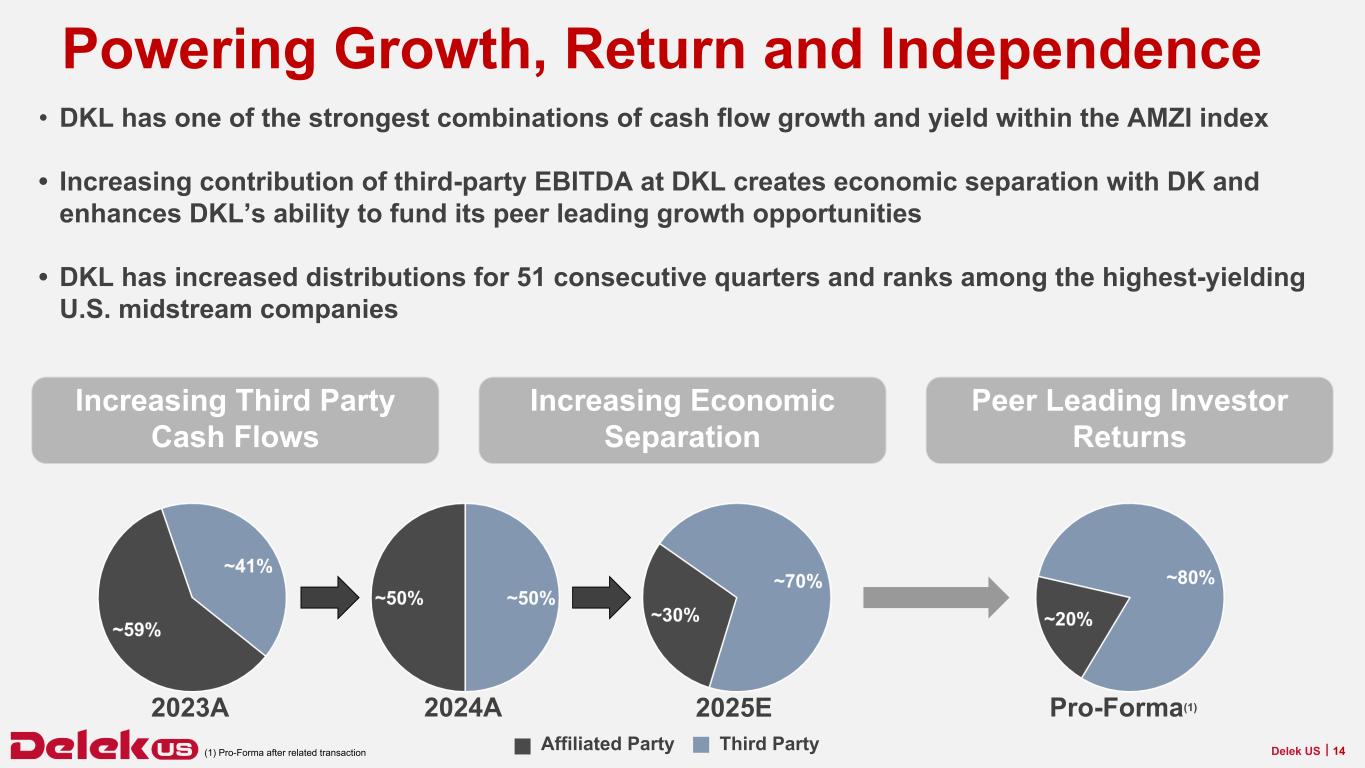 物流事業にはDelek Logistics Partners, LP (NYSE: DKL)が含まれる。Delek Logistics Partners, LP は成長志向のマスター・リミテッド・パートナーシップで、中流エネルギー・インフラ資産の所有と運営に注力している。2025年9月30日現在、Delek US Holdings, Inc.とその子会社はDelek Logistics Partners, LPの約63.3%(ジェネラルパートナー持分を含む)を所有している。