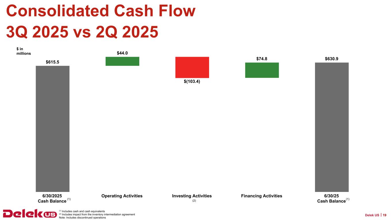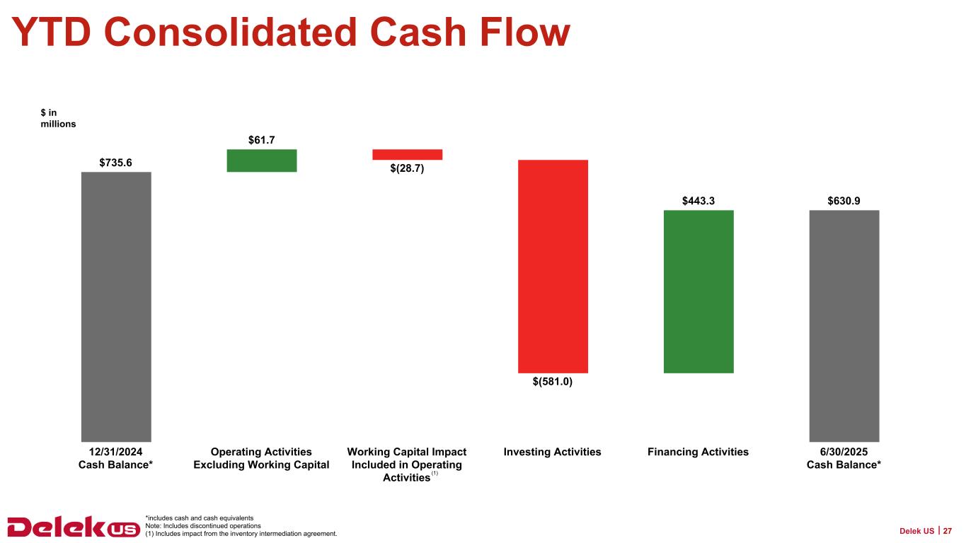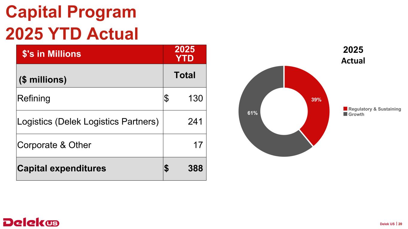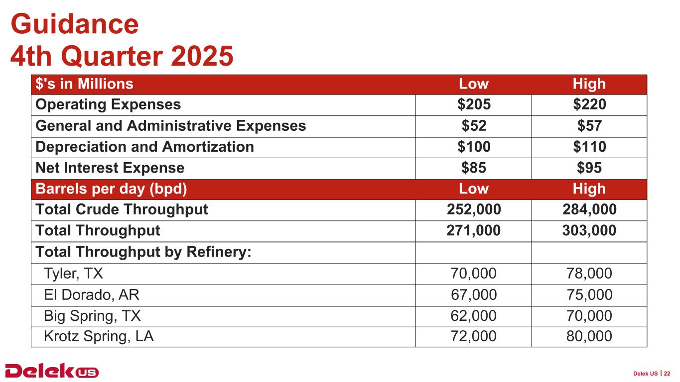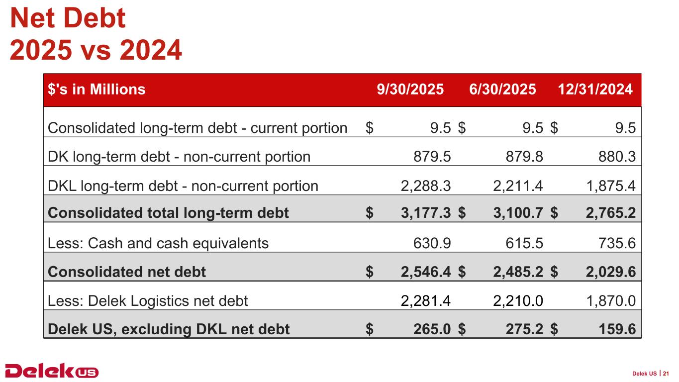 2025年9月30日現在、Delek USの現金残高は6億3,090万ドル、連結長期債務総額は31億7,730万ドルで、純有利子負債は25億4,640万ドルとなっている。2025年9月30日現在、Delek Logistics Partners, LP(NYSE: DKL)(以下「Delek Logistics」)の現金残高は690万ドル、長期借入金総額は22億8,830万ドルで、これらはDelek USの貸借対照表の連結金額に含まれています。Delek Logisticsを除くと、Delek USの現金は6億2,400万ドル、長期借入金は8億8,900万ドル、純有利子負債は2億6,500万ドルである。