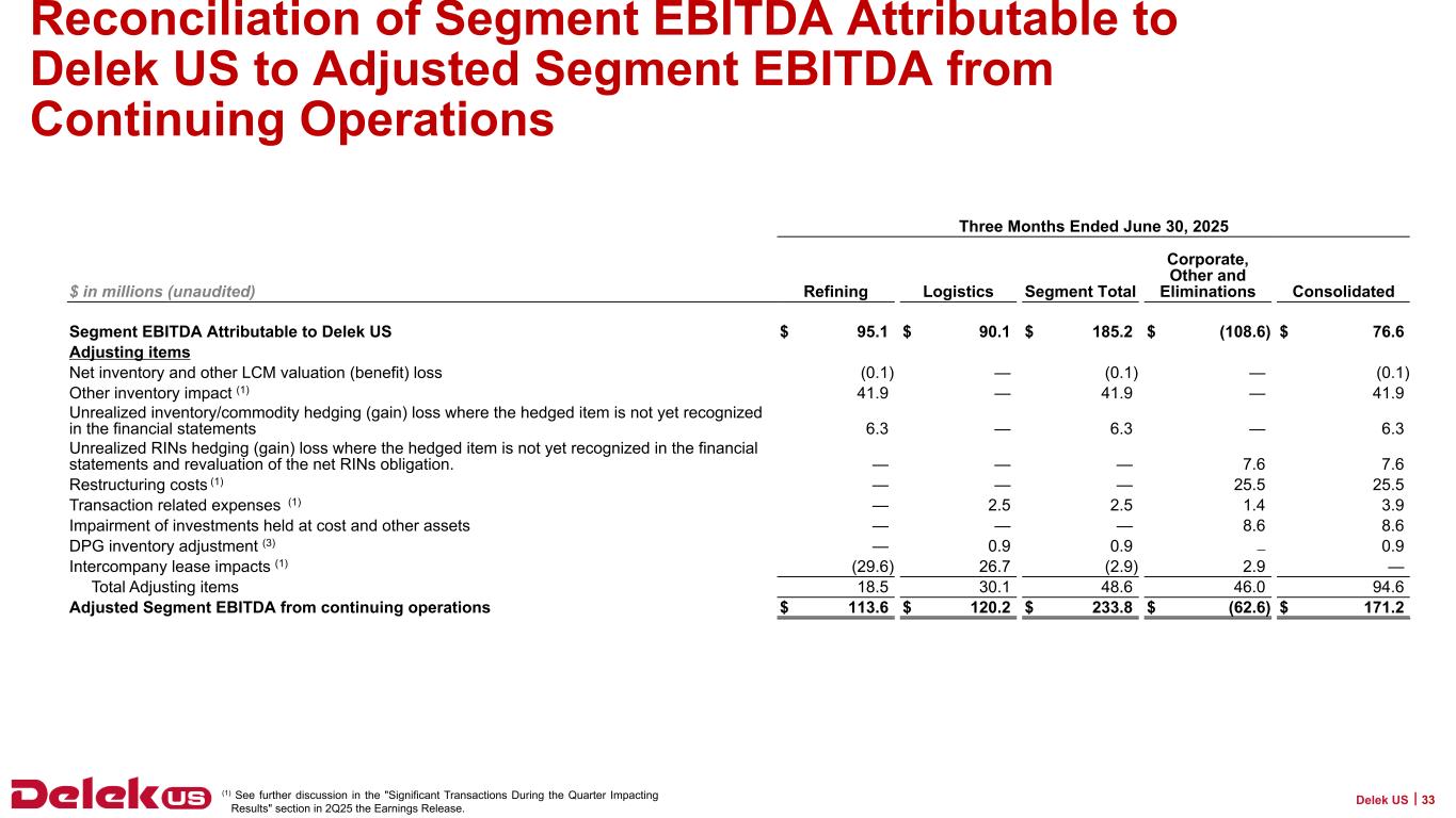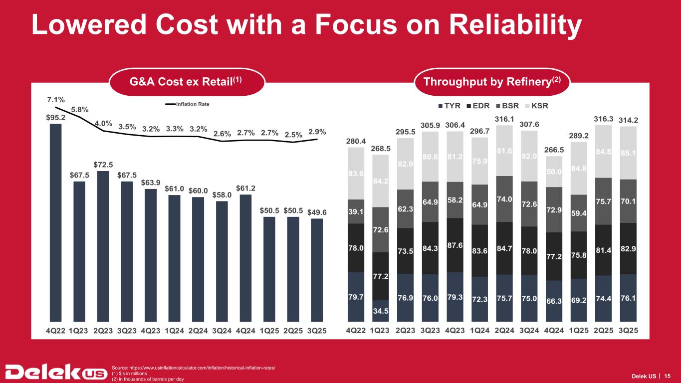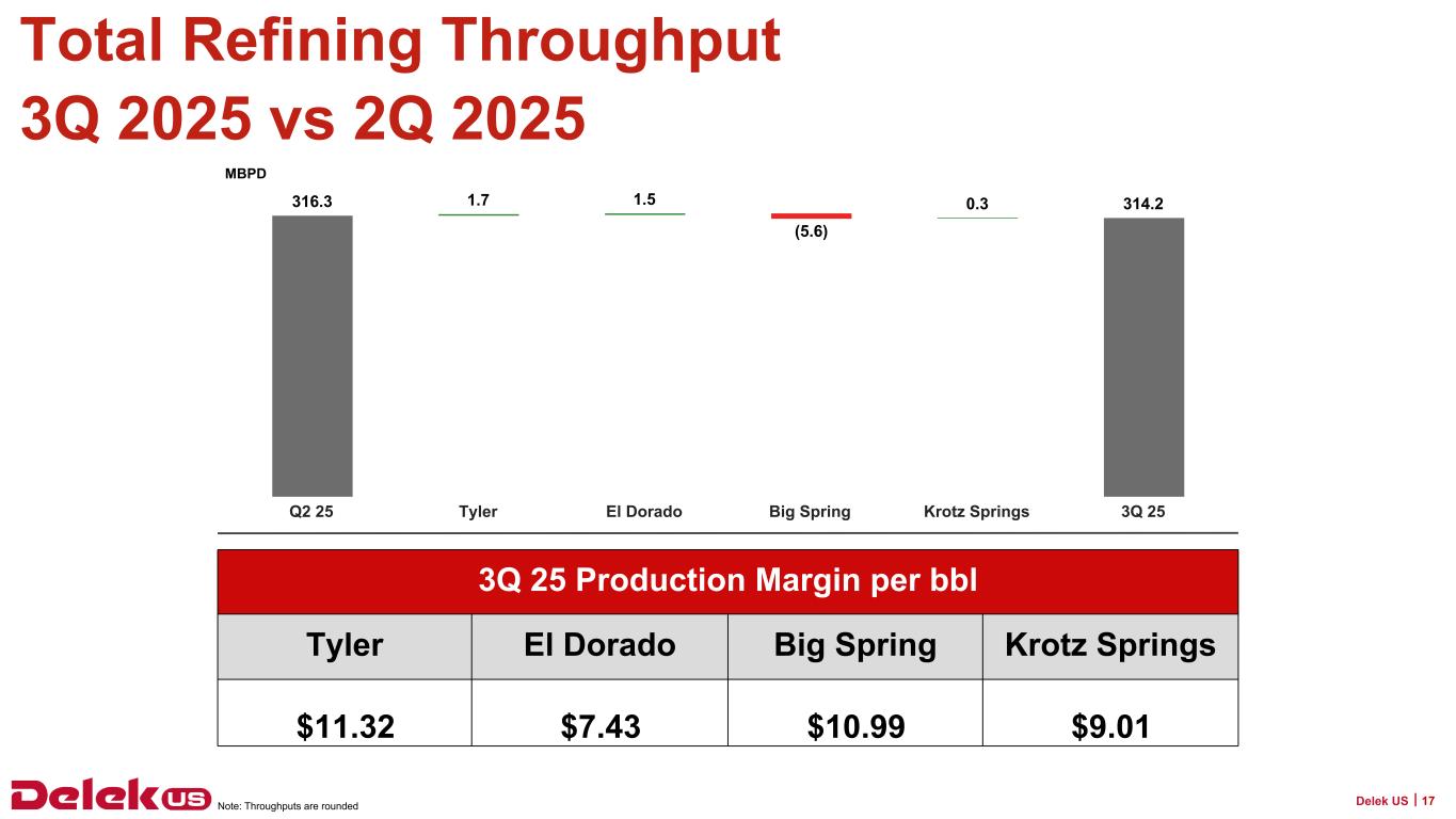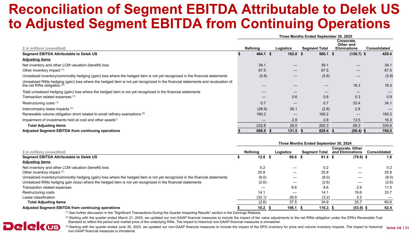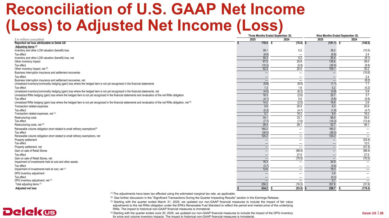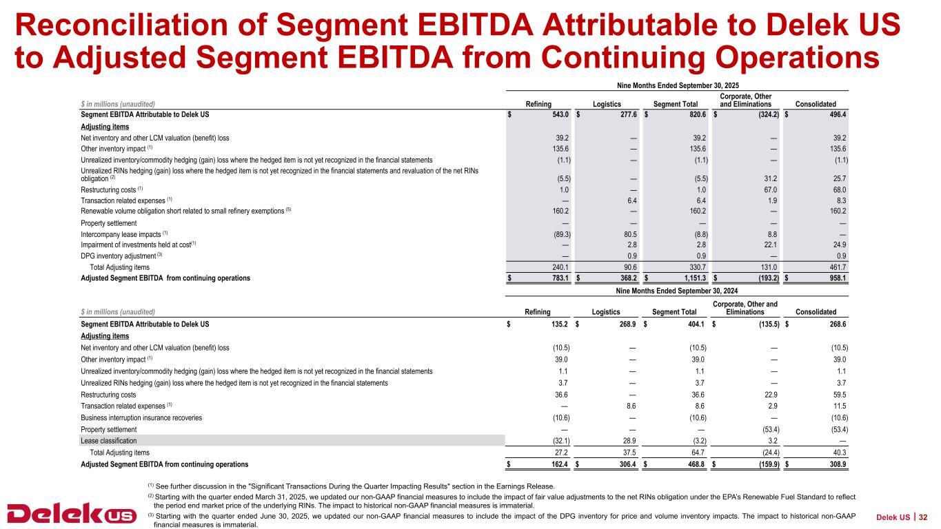 2025年9月30日現在、Delek USの現金残高は6億3,090万ドル、連結長期債務総額は31億7,730万ドルで、純有利子負債は25億4,640万ドルとなっている。2025年9月30日現在、Delek Logistics Partners, LP(NYSE: DKL)(以下「Delek Logistics」)の現金残高は690万ドル、長期借入金総額は22億8,830万ドルで、これらはDelek USの貸借対照表の連結金額に含まれています。Delek Logisticsを除くと、Delek USの現金は6億2,400万ドル、長期借入金は8億8,900万ドル、純有利子負債は2億6,500万ドルである。