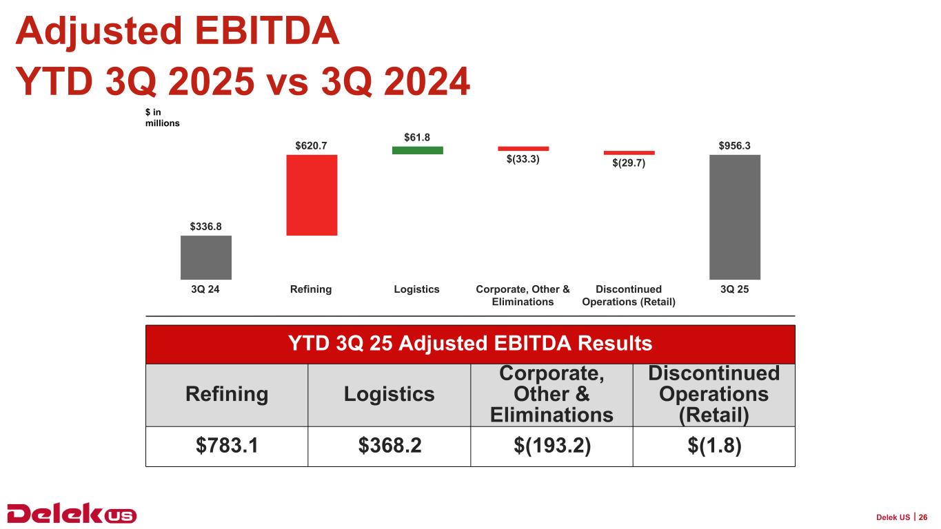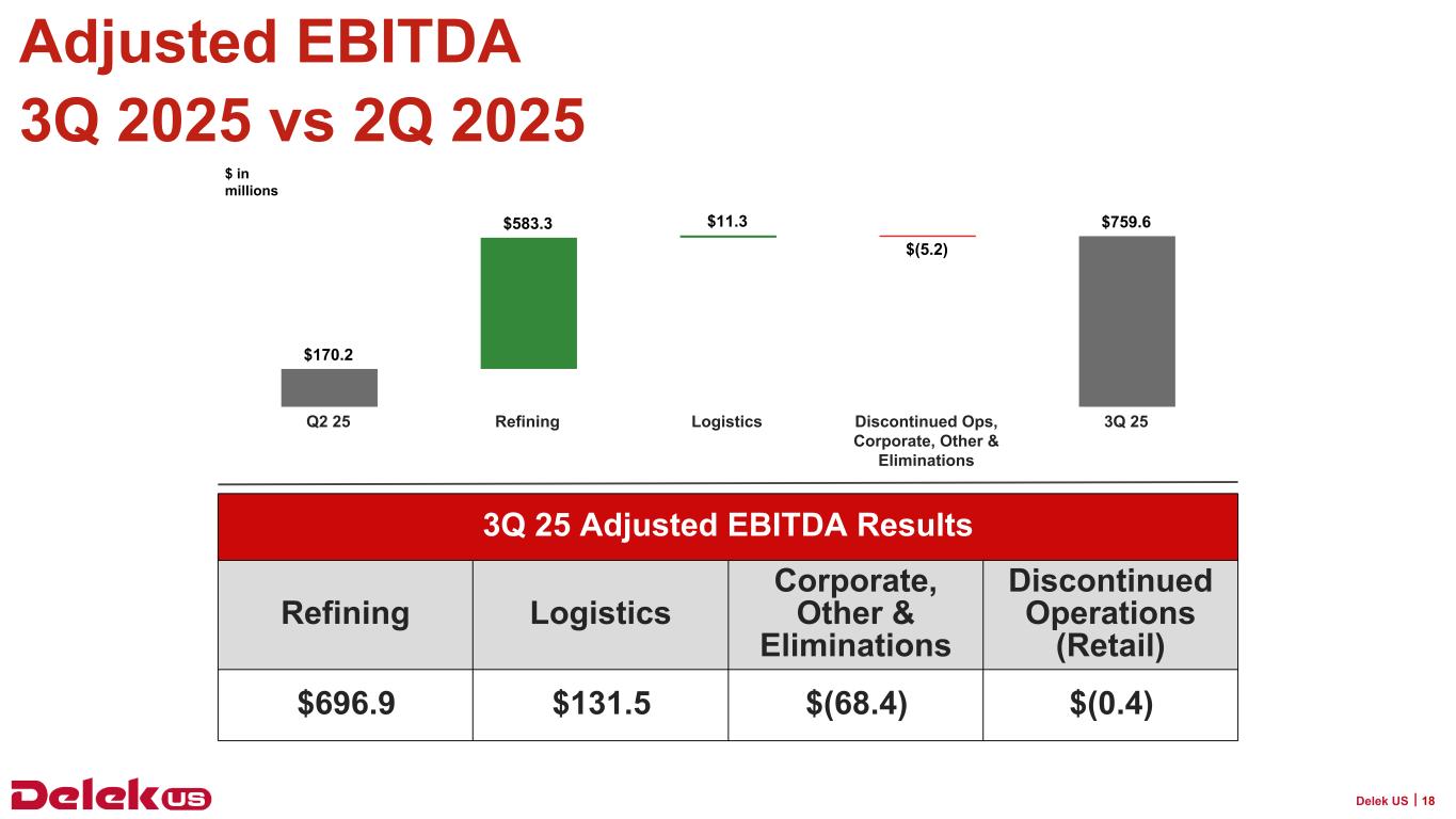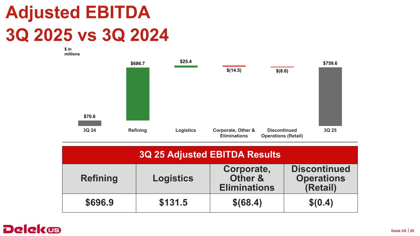 精製部門の調整後 EBITDA は、前年同期の 1,020 万ドルに対し、2025 年第 3 四半期は 6 億 9,690 万ドルとなりました。これは、第 3 四半期の小規模製油所免除に関連する影響と、クラック・スプレッドの拡大による精製マージンの増加を反映したものです。2025年第3四半期のDelek USのベンチマーク・クラック・スプレッドは、前年同期比で平均46.8%上昇しました。調整後EBITDAは、2025年第3四半期および2024年第3四半期にそれぞれ6,750万ドルおよび2,580万ドルのその他在庫の影響も受けました。