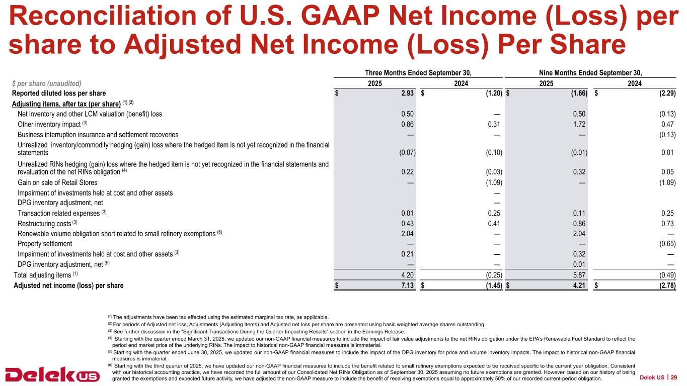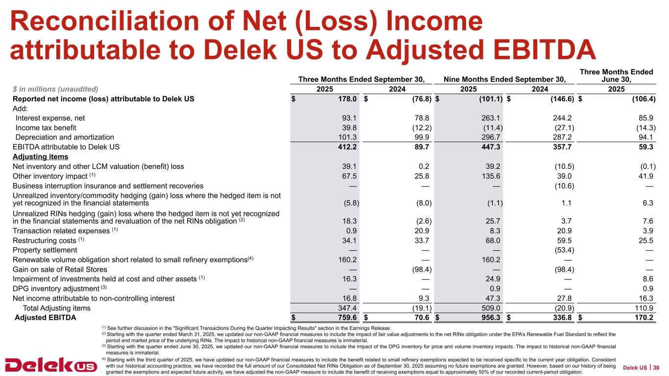 調整後EBITDAおよび調整後純利益には、2025年SRE補助金の可能性を含む1~9ヵ月間のRVO50%削減の影響(~1億6,000万ドル)も含まれる。