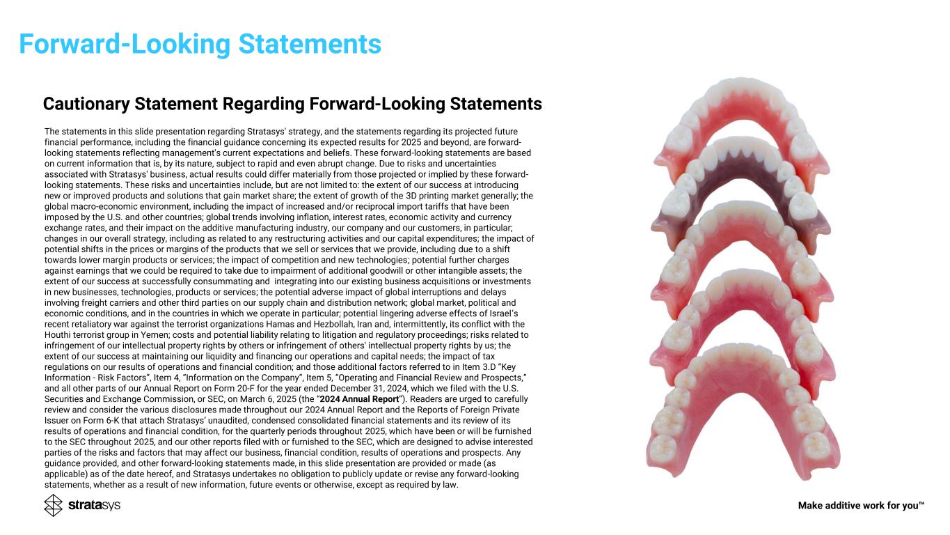 The statements in this press release regarding Stratasys' strategy, and the statements regarding its projected future financial performance, including the financial guidance concerning its expected results for 2025 and beyond, are forward-looking statements reflecting management's current expectations and beliefs. These forward-looking statements are based on current information that is, by its nature, subject to rapid and even abrupt change. Due to risks and uncertainties associated with Stratasys' business, actual results could differ materially from those projected or implied by these forward-looking statements. These risks and uncertainties include, but are not limited to: the extent of our success at introducing new or improved products and solutions that gain market share; the extent of growth of the 3D printing market generally; the global macro-economic environment, including the impact of increased and/or reciprocal import tariffs that have been imposed by the U.S. and other countries; global trends involving inflation, interest rates, economic activity and currency exchange rates, and their impact on the additive manufacturing industry, our company and our customers, in particular; changes in our overall strategy, including as related to any restructuring activities and our capital expenditures; the impact of potential shifts in the prices or margins of the products that we sell or services that we provide, including due to a shift towards lower margin products or services; the impact of competition and new technologies; potential further charges against earnings that we could be required to take due to impairment of additional goodwill or other intangible assets; the extent of our success at successfully consummating and integrating into our existing business acquisitions or investments in new businesses, technologies, products or services; the potential adverse impact of global interruptions and delays involving freight carriers and other third parties on our supply chain and distribution network; global market, political and economic conditions, and in the countries in which we operate in particular; potential lingering adverse effects of Israel’s recent retaliatory war against the terrorist organizations Hamas and Hezbollah, Iran, and, intermittently, its conflict with the Houthi terrorist group in Yemen; costs and potential liability relating to litigation and regulatory proceedings; risks related to infringement of our intellectual property rights by others or infringement of others' intellectual property rights by us; the extent of our success at maintaining our liquidity and financing our operations and capital needs; the impact of tax regulations on our results of operations and financial condition; and those additional factors referred to in Item 3.D “Key Information - Risk Factors”, Item 4, “Information on the Company”, Item 5, “Operating and Financial Review and Prospects,” and all other parts of our Annual Report on Form 20-F for the year ended December 31, 2024, which we filed with the U.S. Securities and Exchange Commission, or SEC, on March 6, 2025 (the “2024 Annual Report”). Readers are urged to carefully review and consider the various disclosures made throughout our 2024 Annual Report and the Reports of Foreign Private Issuer on Form 6-K that attach Stratasys’ unaudited, condensed consolidated financial statements and its review of its results of operations and financial condition, for the quarterly periods throughout 2025, which have been or will be furnished to the SEC throughout 2025, and our other reports filed with or furnished to the SEC, which are designed to advise interested parties of the risks and factors that may affect our business, financial condition, results of operations and prospects. Any guidance provided, and other forward-looking statements made, in this press release are provided or made (as applicable) as of the date hereof, and Stratasys undertakes no obligation to publicly update or revise any forward-looking statements, whether as a result of new information, future events or otherwise, except as required by law.