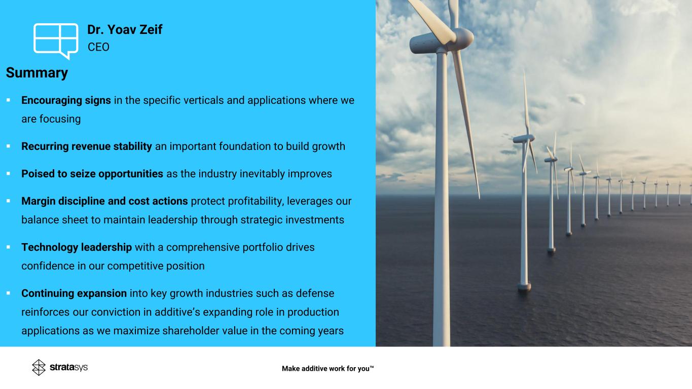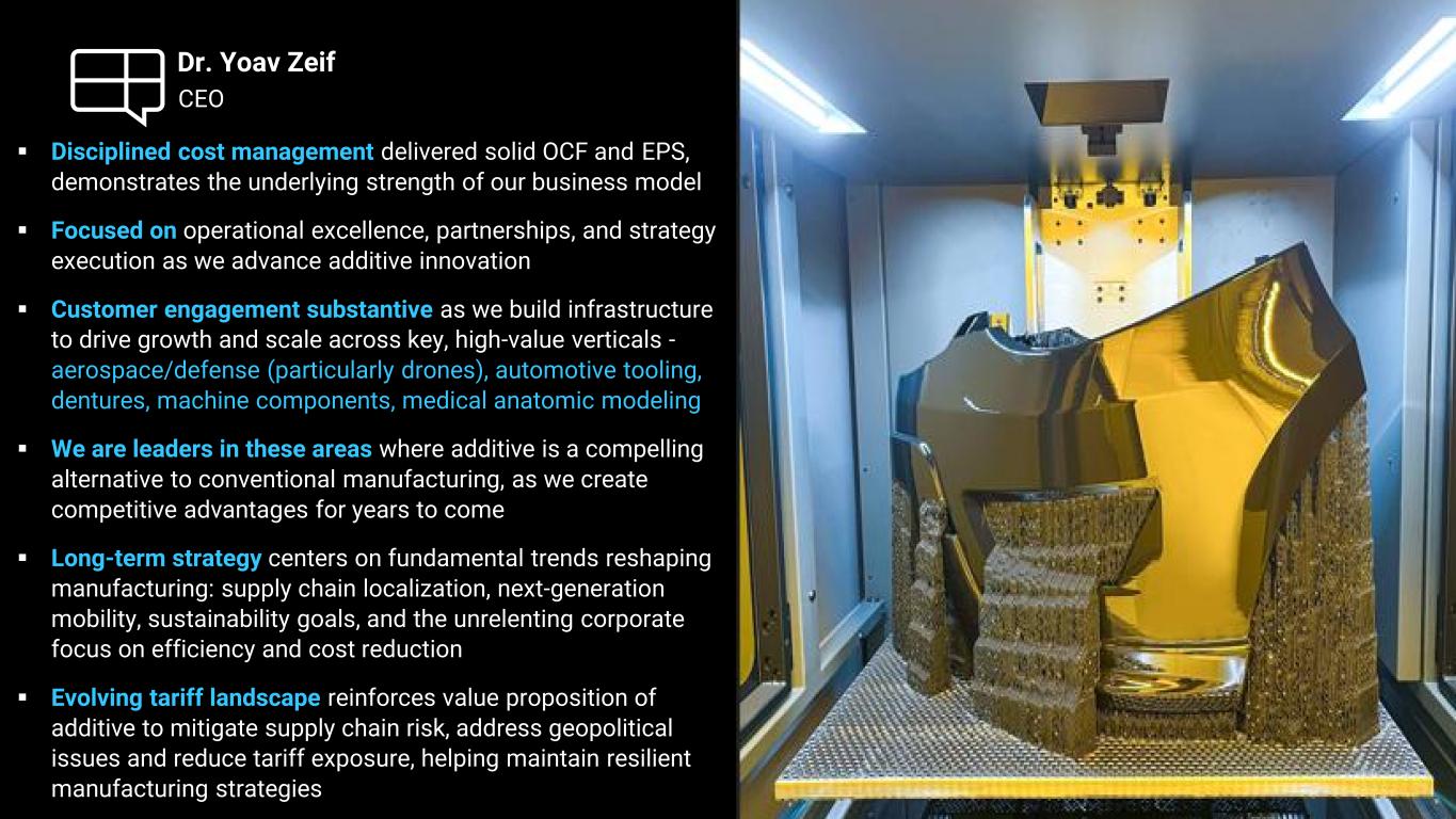 "Our success with leaders of industry and major technology companies validates our solutions' critical role in production environments. The fundamental trends driving manufacturing transformation - supply chain localization, sustainability goals, personalization, and efficiency demands - continue to intensify. As customer spending patterns normalize, we remain well-positioned to capitalize on these secular drivers and deliver shareholder value through our comprehensive portfolio of systems, materials, and software solutions.”