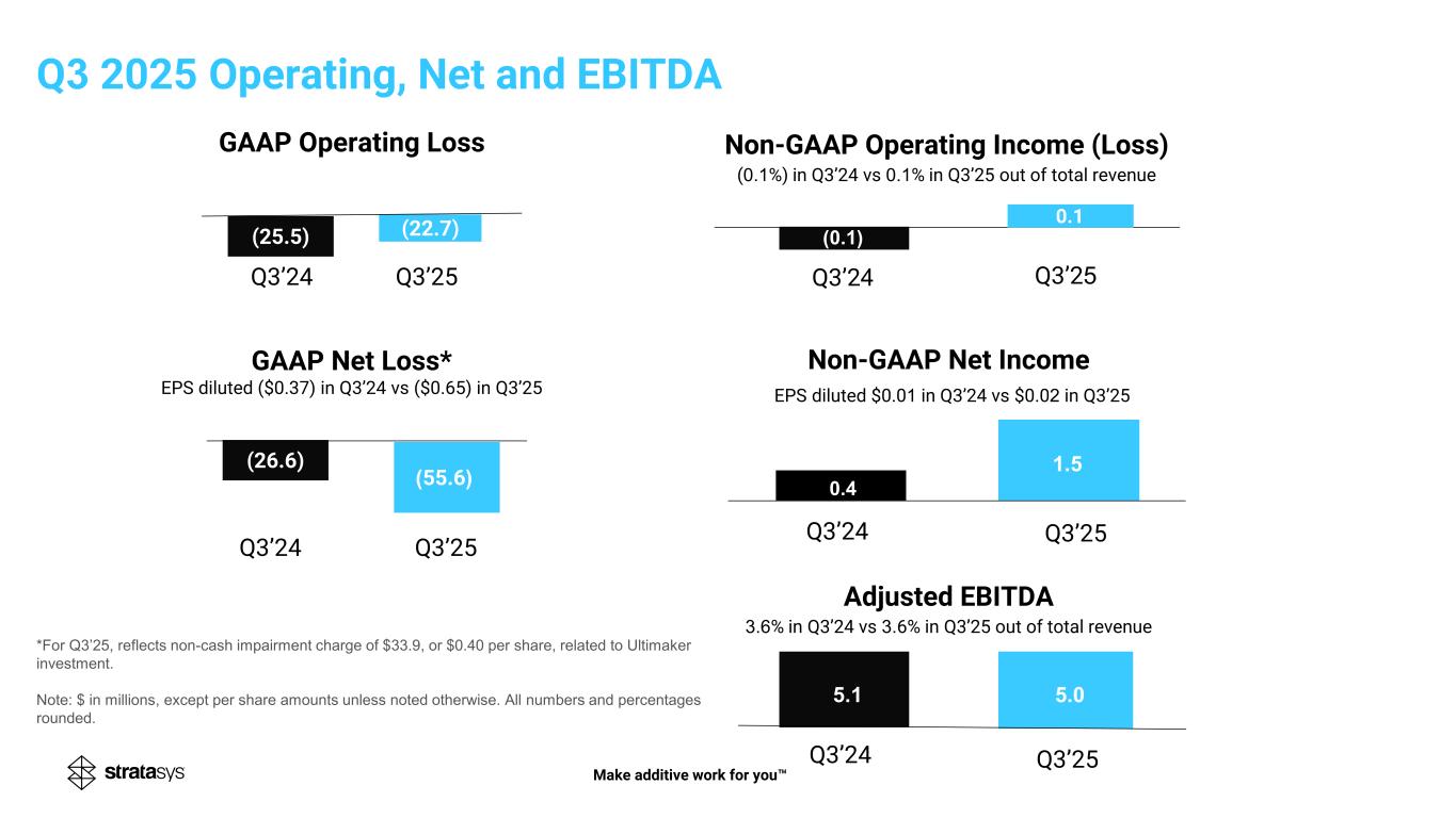 "Our third quarter results demonstrate the resilience of our business model that enabled us to deliver solid operating cash flow and positive adjusted earnings per share, through the combination of strong recurring revenues, disciplined cost management and operational excellence," said Dr. Yoav Zeif, CEO of Stratasys. "Our industry-leading balance sheet, with $255 million in cash, cash equivalents and short-term deposits and no debt, enables us to build the foundational infrastructure that will drive our expansion in aerospace and defense, automotive tooling, dentures, precision machine components, and medical anatomic modeling. We are strategically investing in the technological capabilities and customer relationships that position us to capture substantial growth as these high-value applications scale. Customer engagement remains robust across these verticals, with active partnerships on compelling use cases that reinforce our confidence in our competitive positioning and additive manufacturing's long-term trajectory."