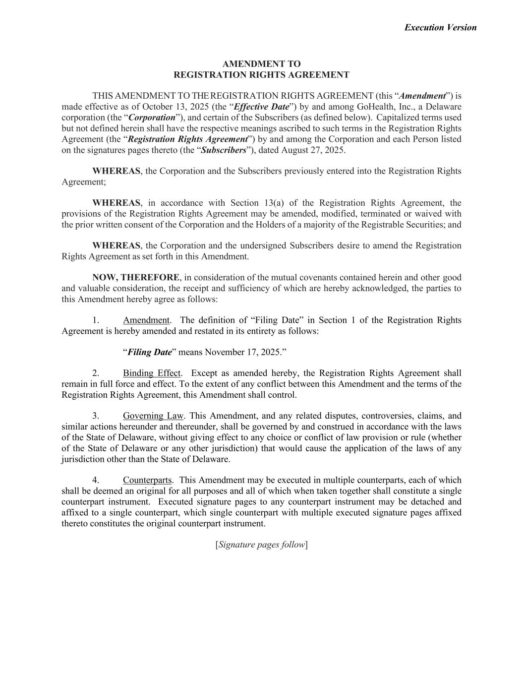 Execution Version AMENDMENT TO REGISTRATION RIGHTS AGREEMENT THIS AMENDMENT TO THE REGISTRATION RIGHTS AGREEMENT (this “Amendment”) is made effective as of October 13, 2025 (the “Effective Date”) by and among GoHealth, Inc., a Delaware corporation (the “Corporation”), and certain of the Subscribers (as defined below). Capitalized terms used but not defined herein shall have the respective meanings ascribed to such terms in the Registration Rights Agreement (the “Registration Rights Agreement”) by and among the Corporation and each Person listed on the signatures pages thereto (the “Subscribers”), dated August 27, 2025. WHEREAS, the Corporation and the Subscribers previously entered into the Registration Rights Agreement; WHEREAS, in accordance with Section 13(a) of the Registration Rights Agreement, the provisions of the Registration Rights Agreement may be amended, modified, terminated or waived with the prior written consent of the Corporation and the Holders of a majority of the Registrable Securities; and WHEREAS, the Corporation and the undersigned Subscribers desire to amend the Registration Rights Agreement as set forth in this Amendment. NOW, THEREFORE, in consideration of the mutual covenants contained herein and other good and valuable consideration, the receipt and sufficiency of which are hereby acknowledged, the parties to this Amendment hereby agree as follows: 1. Amendment. The definition of “Filing Date” in Section 1 of the Registration Rights Agreement is hereby amended and restated in its entirety as follows: “Filing Date” means November 17, 2025.” 2. Binding Effect. Except as amended hereby, the Registration Rights Agreement shall remain in full force and effect. To the extent of any conflict between this Amendment and the terms of the Registration Rights Agreement, this Amendment shall control. 3. Governing Law. This Amendment, and any related disputes, controversies, claims, and similar actions hereunder and thereunder, shall be governed by and construed in accordance with the laws of the State of Delaware, without giving effect to any choice or conflict of law provision or rule (whether of the State of Delaware or any other jurisdiction) that would cause the application of the laws of any jurisdiction other than the State of Delaware. 4. Counterparts. This Amendment may be executed in multiple counterparts, each of which shall be deemed an original for all purposes and all of which when taken together shall constitute a single counterpart instrument. Executed signature pages to any counterpart instrument may be detached and affixed to a single counterpart, which single counterpart with multiple executed signature pages affixed thereto constitutes the original counterpart instrument. [Signature pages follow]