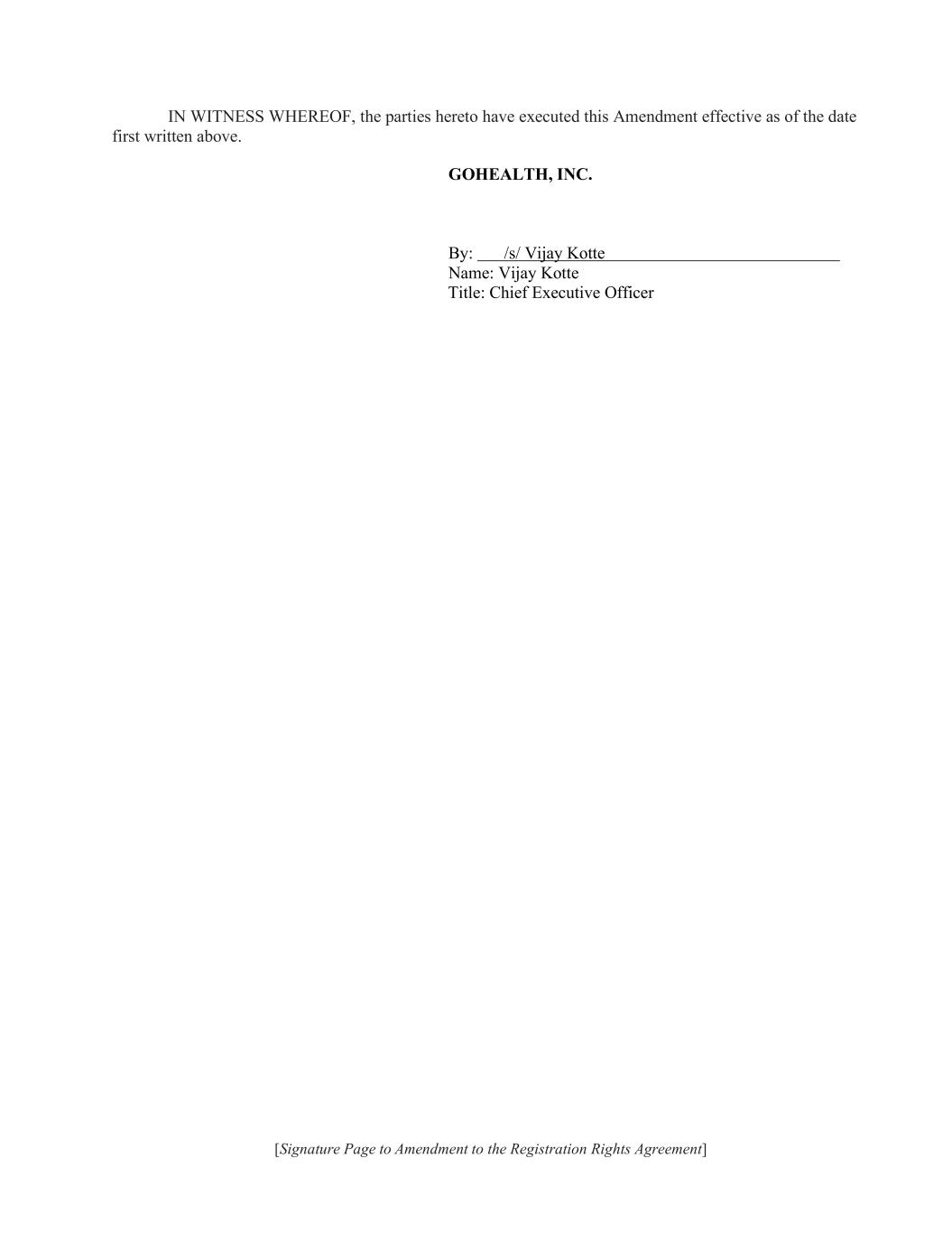 [Signature Page to Amendment to the Registration Rights Agreement] IN WITNESS WHEREOF, the parties hereto have executed this Amendment effective as of the date first written above. GOHEALTH, INC. By: /s/ Vijay Kotte Name: Vijay Kotte Title: Chief Executive Officer