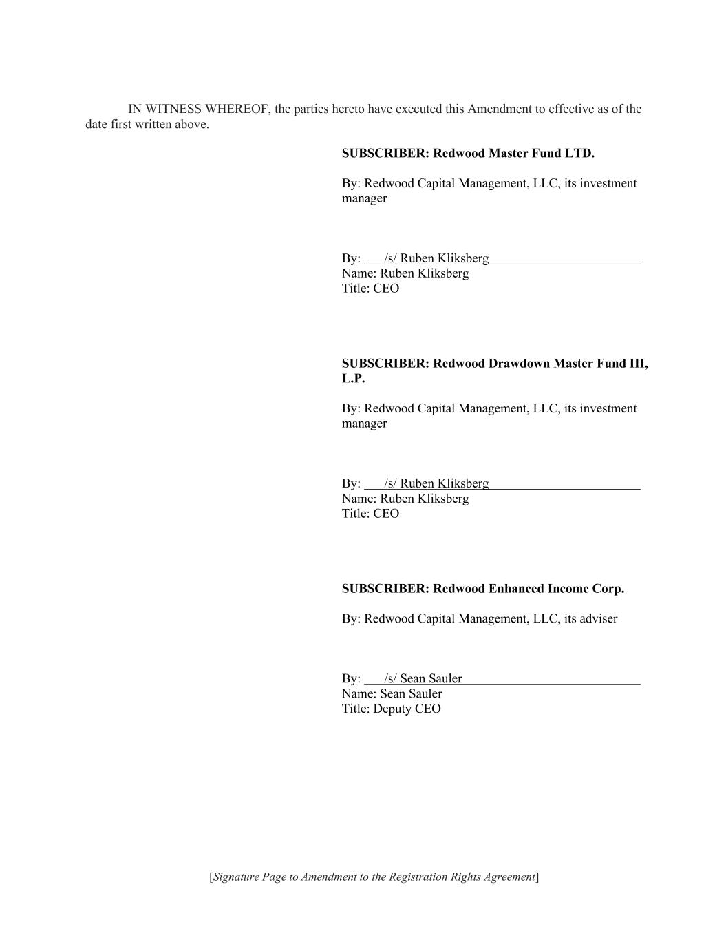 [Signature Page to Amendment to the Registration Rights Agreement] IN WITNESS WHEREOF, the parties hereto have executed this Amendment to effective as of the date first written above. SUBSCRIBER: Redwood Master Fund LTD. By: Redwood Capital Management, LLC, its investment manager By: /s/ Ruben Kliksberg Name: Ruben Kliksberg Title: CEO SUBSCRIBER: Redwood Drawdown Master Fund III, L.P. By: Redwood Capital Management, LLC, its investment manager By: /s/ Ruben Kliksberg Name: Ruben Kliksberg Title: CEO SUBSCRIBER: Redwood Enhanced Income Corp. By: Redwood Capital Management, LLC, its adviser By: /s/ Sean Sauler Name: Sean Sauler Title: Deputy CEO