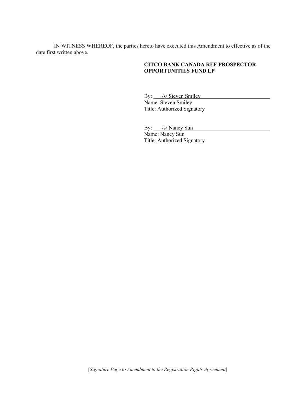 [Signature Page to Amendment to the Registration Rights Agreement] IN WITNESS WHEREOF, the parties hereto have executed this Amendment to effective as of the date first written above. CITCO BANK CANADA REF PROSPECTOR OPPORTUNITIES FUND LP By: /s/ Steven Smiley Name: Steven Smiley Title: Authorized Signatory By: /s/ Nancy Sun Name: Nancy Sun Title: Authorized Signatory