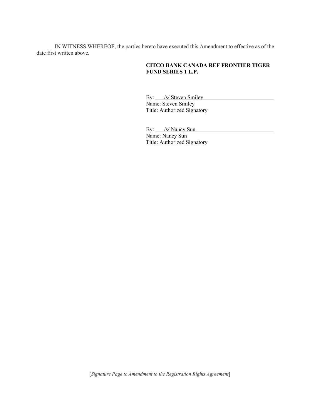 [Signature Page to Amendment to the Registration Rights Agreement] IN WITNESS WHEREOF, the parties hereto have executed this Amendment to effective as of the date first written above. CITCO BANK CANADA REF FRONTIER TIGER FUND SERIES 1 L.P. By: /s/ Steven Smiley Name: Steven Smiley Title: Authorized Signatory By: /s/ Nancy Sun Name: Nancy Sun Title: Authorized Signatory