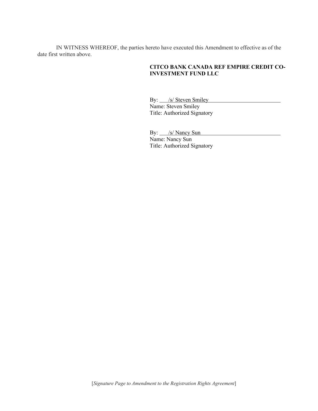 [Signature Page to Amendment to the Registration Rights Agreement] IN WITNESS WHEREOF, the parties hereto have executed this Amendment to effective as of the date first written above. CITCO BANK CANADA REF EMPIRE CREDIT CO- INVESTMENT FUND LLC By: /s/ Steven Smiley Name: Steven Smiley Title: Authorized Signatory By: /s/ Nancy Sun Name: Nancy Sun Title: Authorized Signatory