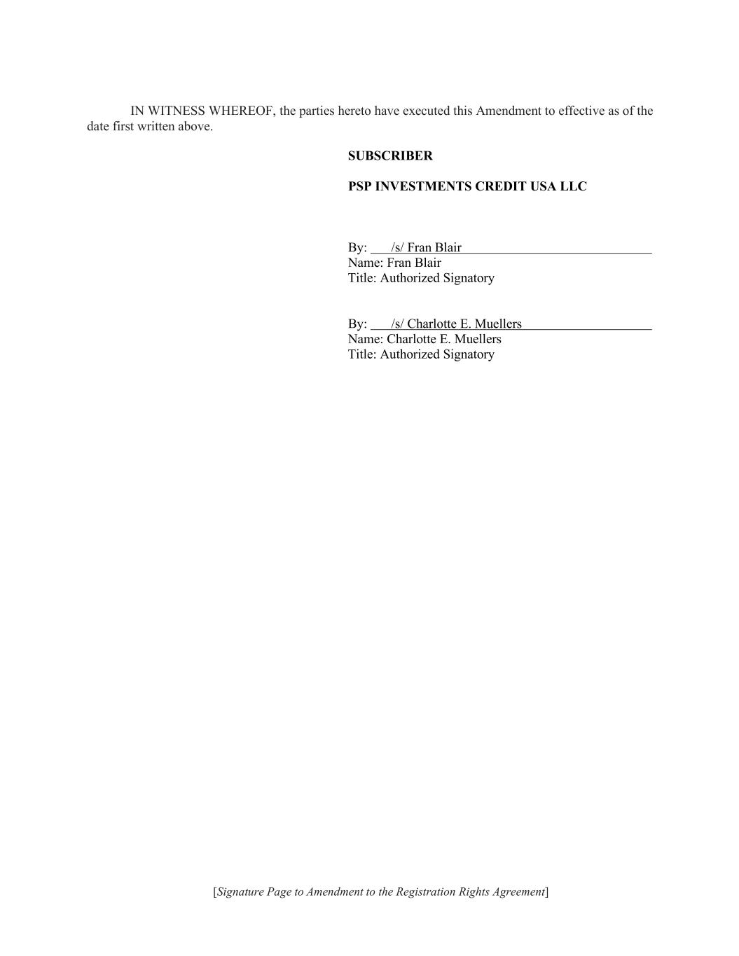 [Signature Page to Amendment to the Registration Rights Agreement] IN WITNESS WHEREOF, the parties hereto have executed this Amendment to effective as of the date first written above. SUBSCRIBER PSP INVESTMENTS CREDIT USA LLC By: /s/ Fran Blair Name: Fran Blair Title: Authorized Signatory By: /s/ Charlotte E. Muellers Name: Charlotte E. Muellers Title: Authorized Signatory