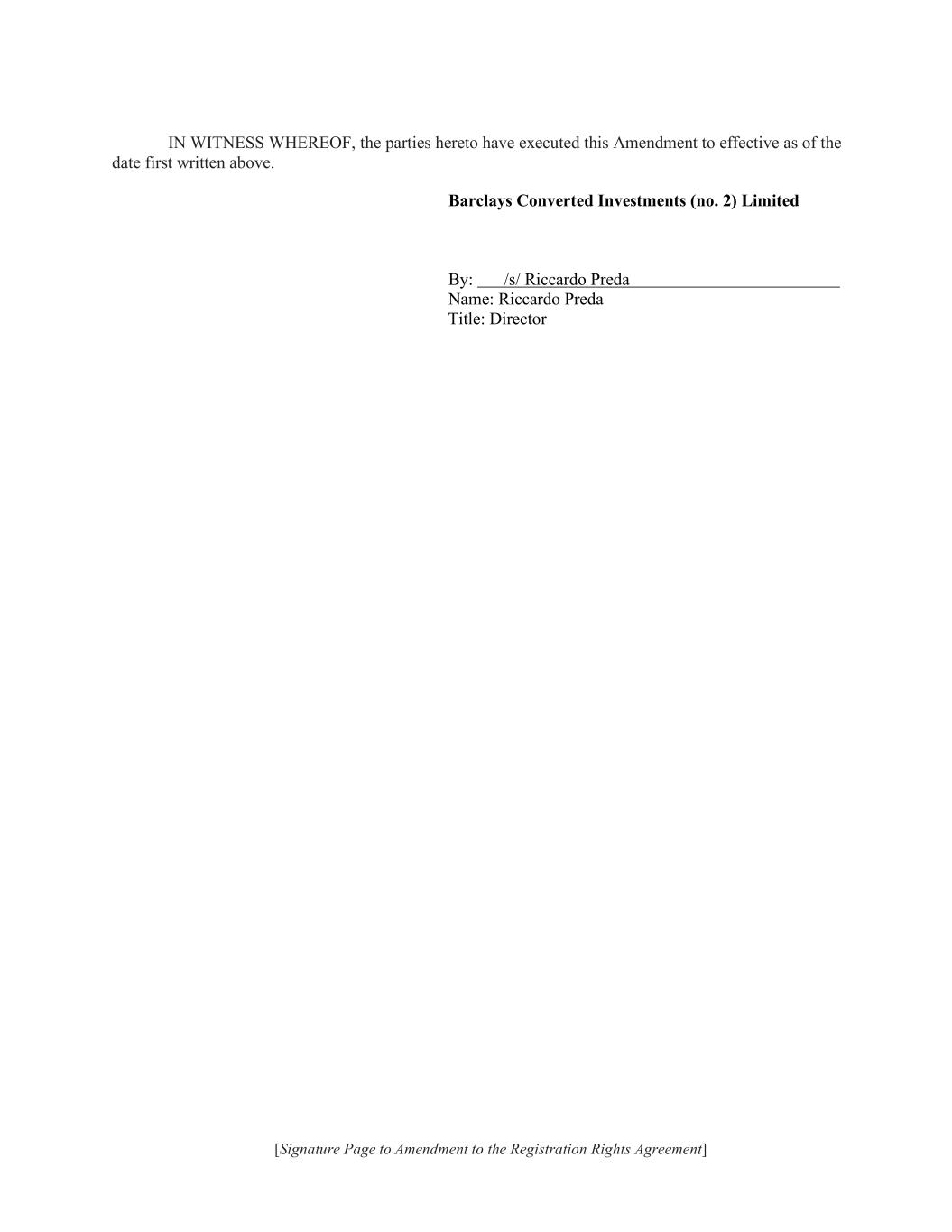 [Signature Page to Amendment to the Registration Rights Agreement] IN WITNESS WHEREOF, the parties hereto have executed this Amendment to effective as of the date first written above. Barclays Converted Investments (no. 2) Limited By: /s/ Riccardo Preda Name: Riccardo Preda Title: Director