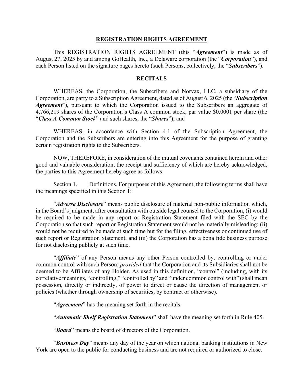 REGISTRATION RIGHTS AGREEMENT This REGISTRATION RIGHTS AGREEMENT (this “Agreement”) is made as of August 27, 2025 by and among GoHealth, Inc., a Delaware corporation (the “Corporation”), and each Person listed on the signature pages hereto (such Persons, collectively, the “Subscribers”). RECITALS WHEREAS, the Corporation, the Subscribers and Norvax, LLC, a subsidiary of the Corporation, are party to a Subscription Agreement, dated as of August 6, 2025 (the “Subscription Agreement”), pursuant to which the Corporation issued to the Subscribers an aggregate of 4,766,219 shares of the Corporation’s Class A common stock, par value $0.0001 per share (the “Class A Common Stock” and such shares, the “Shares”); and WHEREAS, in accordance with Section 4.1 of the Subscription Agreement, the Corporation and the Subscribers are entering into this Agreement for the purpose of granting certain registration rights to the Subscribers. NOW, THEREFORE, in consideration of the mutual covenants contained herein and other good and valuable consideration, the receipt and sufficiency of which are hereby acknowledged, the parties to this Agreement hereby agree as follows: Section 1. Definitions. For purposes of this Agreement, the following terms shall have the meanings specified in this Section 1: “Adverse Disclosure” means public disclosure of material non-public information which, in the Board’s judgment, after consultation with outside legal counsel to the Corporation, (i) would be required to be made in any report or Registration Statement filed with the SEC by the Corporation so that such report or Registration Statement would not be materially misleading; (ii) would not be required to be made at such time but for the filing, effectiveness or continued use of such report or Registration Statement; and (iii) the Corporation has a bona fide business purpose for not disclosing publicly at such time. “Affiliate” of any Person means any other Person controlled by, controlling or under common control with such Person; provided that the Corporation and its Subsidiaries shall not be deemed to be Affiliates of any Holder. As used in this definition, “control” (including, with its correlative meanings, “controlling,” “controlled by” and “under common control with”) shall mean possession, directly or indirectly, of power to direct or cause the direction of management or policies (whether through ownership of securities, by contract or otherwise). “Agreement” has the meaning set forth in the recitals. “Automatic Shelf Registration Statement” shall have the meaning set forth in Rule 405. “Board” means the board of directors of the Corporation. “Business Day” means any day of the year on which national banking institutions in New York are open to the public for conducting business and are not required or authorized to close.