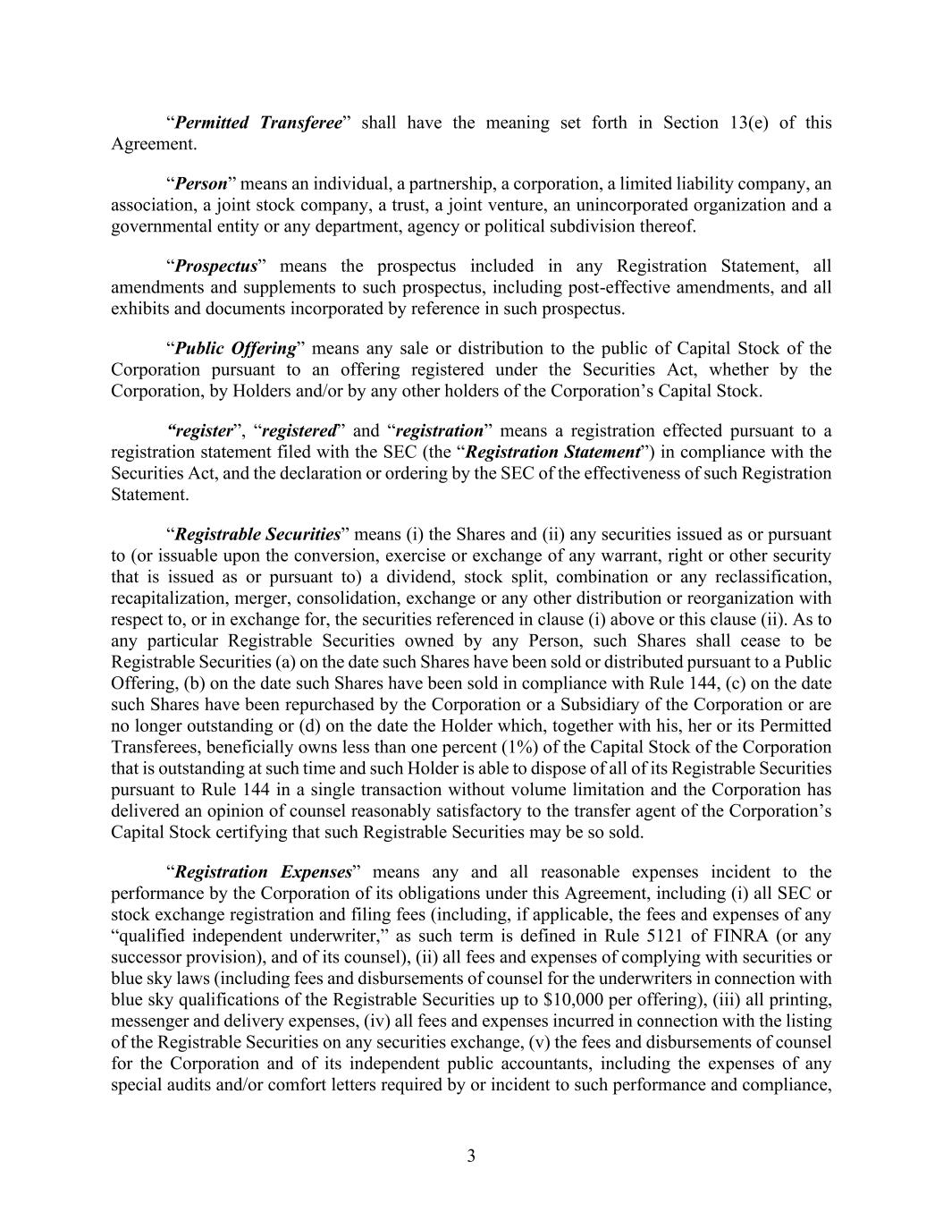 3 “Permitted Transferee” shall have the meaning set forth in Section 13(e) of this Agreement. “Person” means an individual, a partnership, a corporation, a limited liability company, an association, a joint stock company, a trust, a joint venture, an unincorporated organization and a governmental entity or any department, agency or political subdivision thereof. “Prospectus” means the prospectus included in any Registration Statement, all amendments and supplements to such prospectus, including post-effective amendments, and all exhibits and documents incorporated by reference in such prospectus. “Public Offering” means any sale or distribution to the public of Capital Stock of the Corporation pursuant to an offering registered under the Securities Act, whether by the Corporation, by Holders and/or by any other holders of the Corporation’s Capital Stock. “register”, “registered” and “registration” means a registration effected pursuant to a registration statement filed with the SEC (the “Registration Statement”) in compliance with the Securities Act, and the declaration or ordering by the SEC of the effectiveness of such Registration Statement. “Registrable Securities” means (i) the Shares and (ii) any securities issued as or pursuant to (or issuable upon the conversion, exercise or exchange of any warrant, right or other security that is issued as or pursuant to) a dividend, stock split, combination or any reclassification, recapitalization, merger, consolidation, exchange or any other distribution or reorganization with respect to, or in exchange for, the securities referenced in clause (i) above or this clause (ii). As to any particular Registrable Securities owned by any Person, such Shares shall cease to be Registrable Securities (a) on the date such Shares have been sold or distributed pursuant to a Public Offering, (b) on the date such Shares have been sold in compliance with Rule 144, (c) on the date such Shares have been repurchased by the Corporation or a Subsidiary of the Corporation or are no longer outstanding or (d) on the date the Holder which, together with his, her or its Permitted Transferees, beneficially owns less than one percent (1%) of the Capital Stock of the Corporation that is outstanding at such time and such Holder is able to dispose of all of its Registrable Securities pursuant to Rule 144 in a single transaction without volume limitation and the Corporation has delivered an opinion of counsel reasonably satisfactory to the transfer agent of the Corporation’s Capital Stock certifying that such Registrable Securities may be so sold. “Registration Expenses” means any and all reasonable expenses incident to the performance by the Corporation of its obligations under this Agreement, including (i) all SEC or stock exchange registration and filing fees (including, if applicable, the fees and expenses of any “qualified independent underwriter,” as such term is defined in Rule 5121 of FINRA (or any successor provision), and of its counsel), (ii) all fees and expenses of complying with securities or blue sky laws (including fees and disbursements of counsel for the underwriters in connection with blue sky qualifications of the Registrable Securities up to $10,000 per offering), (iii) all printing, messenger and delivery expenses, (iv) all fees and expenses incurred in connection with the listing of the Registrable Securities on any securities exchange, (v) the fees and disbursements of counsel for the Corporation and of its independent public accountants, including the expenses of any special audits and/or comfort letters required by or incident to such performance and compliance,